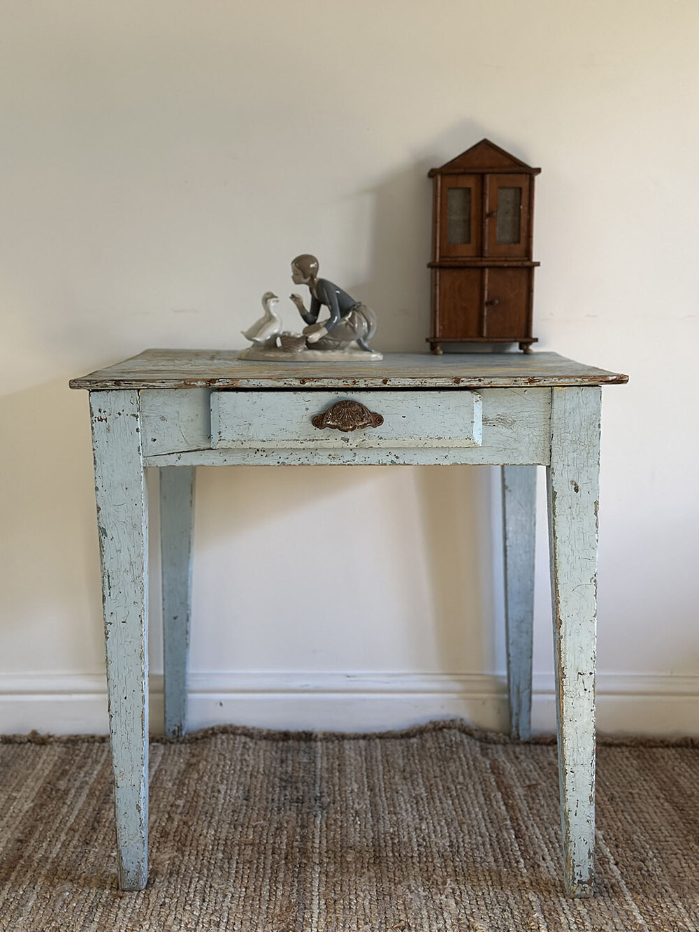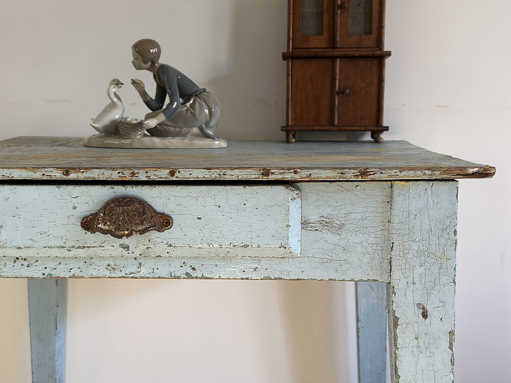 25-144 Old vintage French shabby chic table with a drawer - powder blue