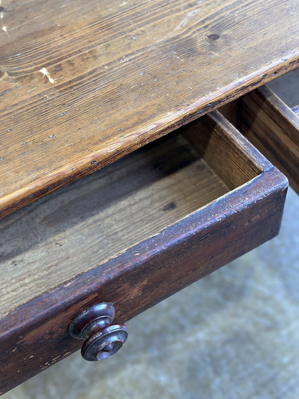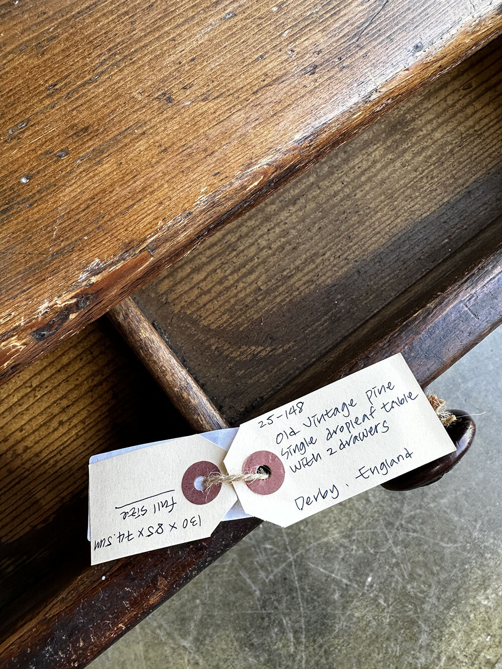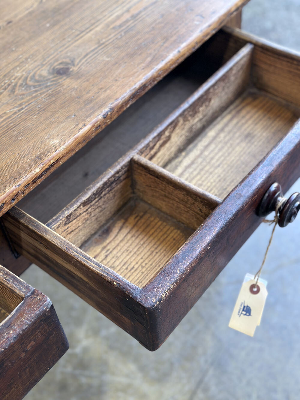짙은 컬러의 올드 빈티지 파인 싱글 드랍리프 테이블입니다. 책상이나 콘솔 테이블로도 활용이 가능한 타입으로, 큰 서랍이 2개 딸려 있습니다.
