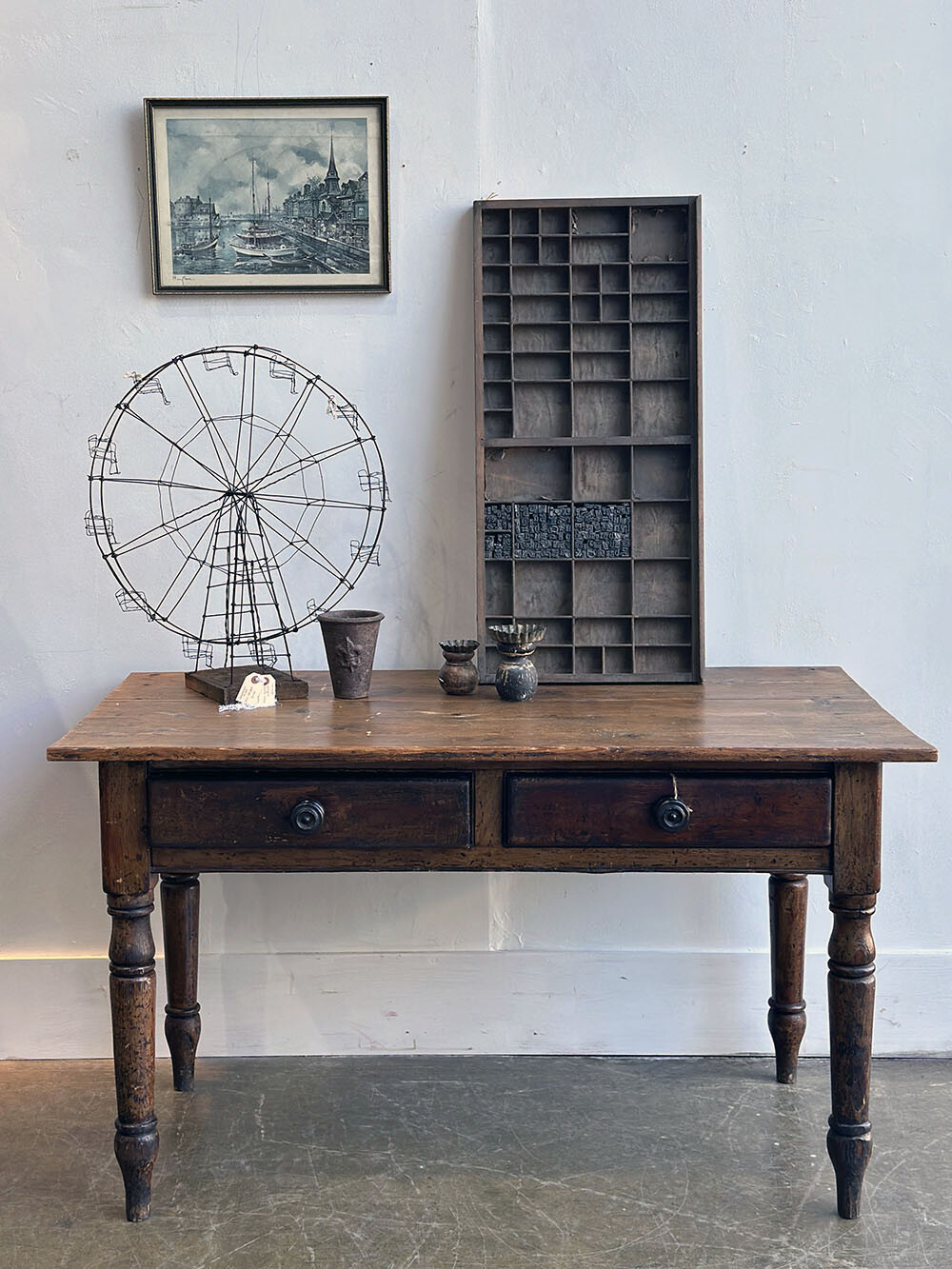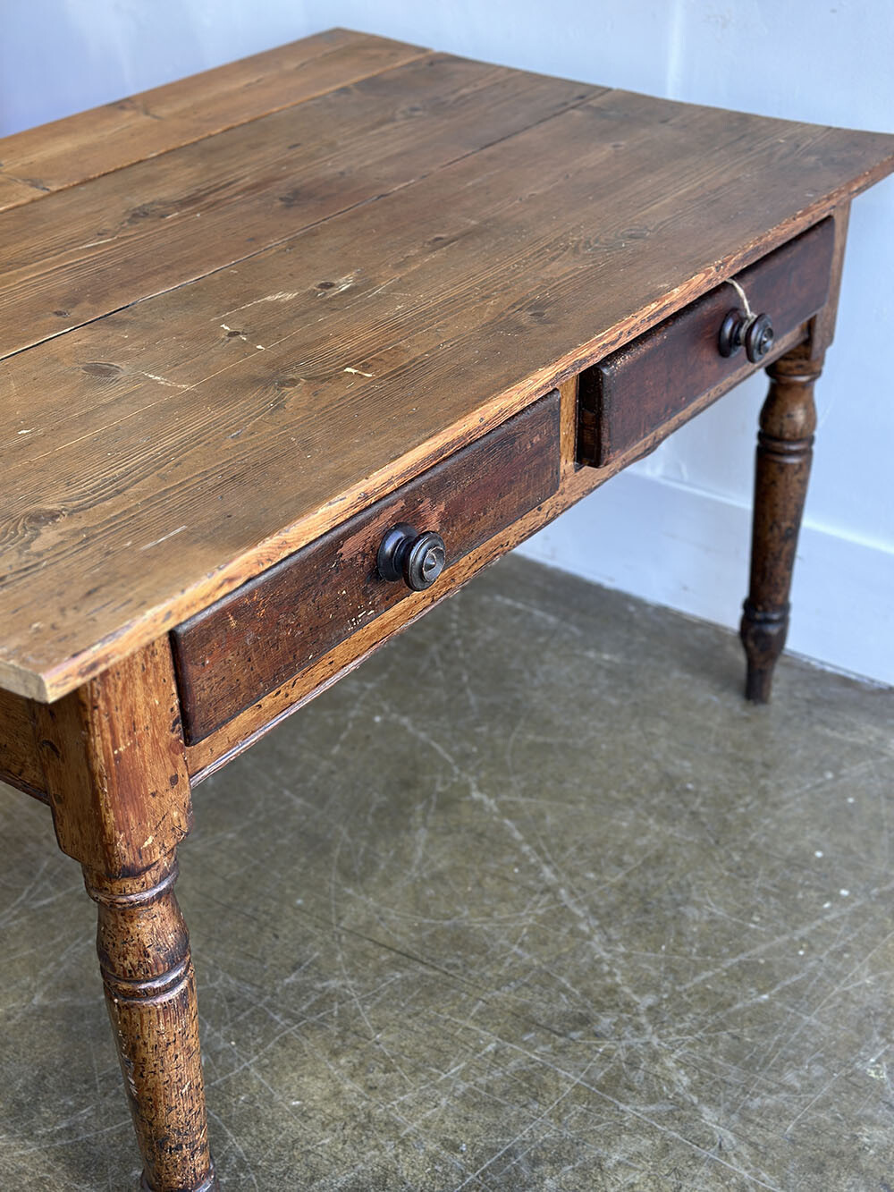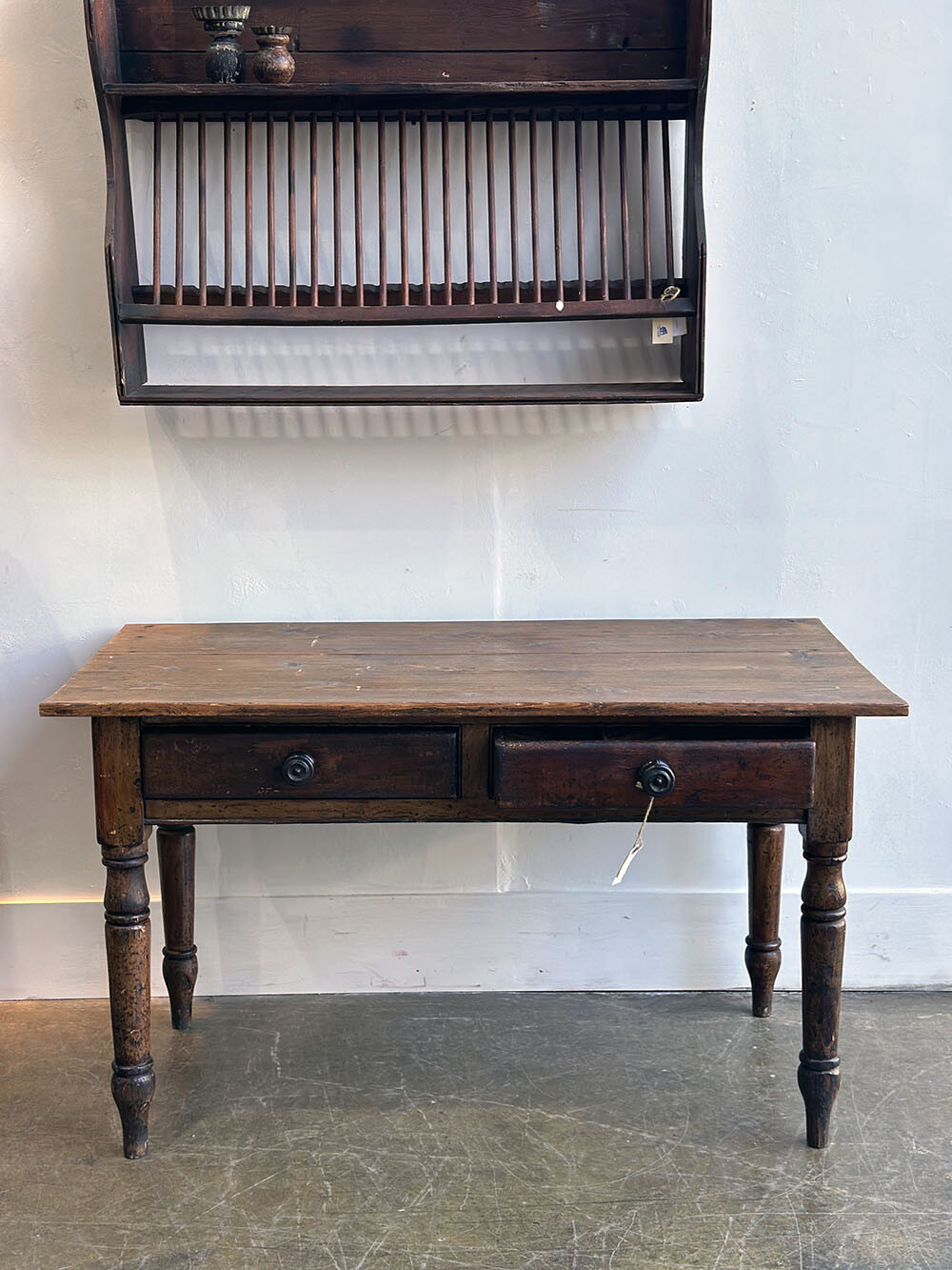 짙은 컬러의 올드 빈티지 파인 싱글 드랍리프 테이블입니다. 책상이나 콘솔 테이블로도 활용이 가능한 타입으로, 큰 서랍이 2개 딸려 있습니다.