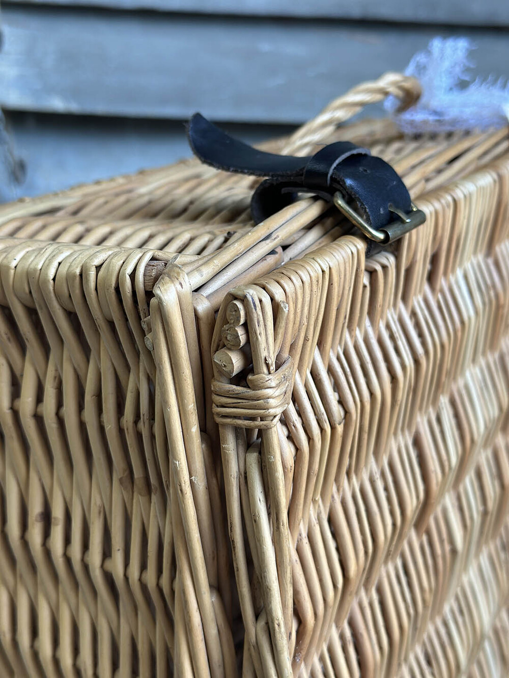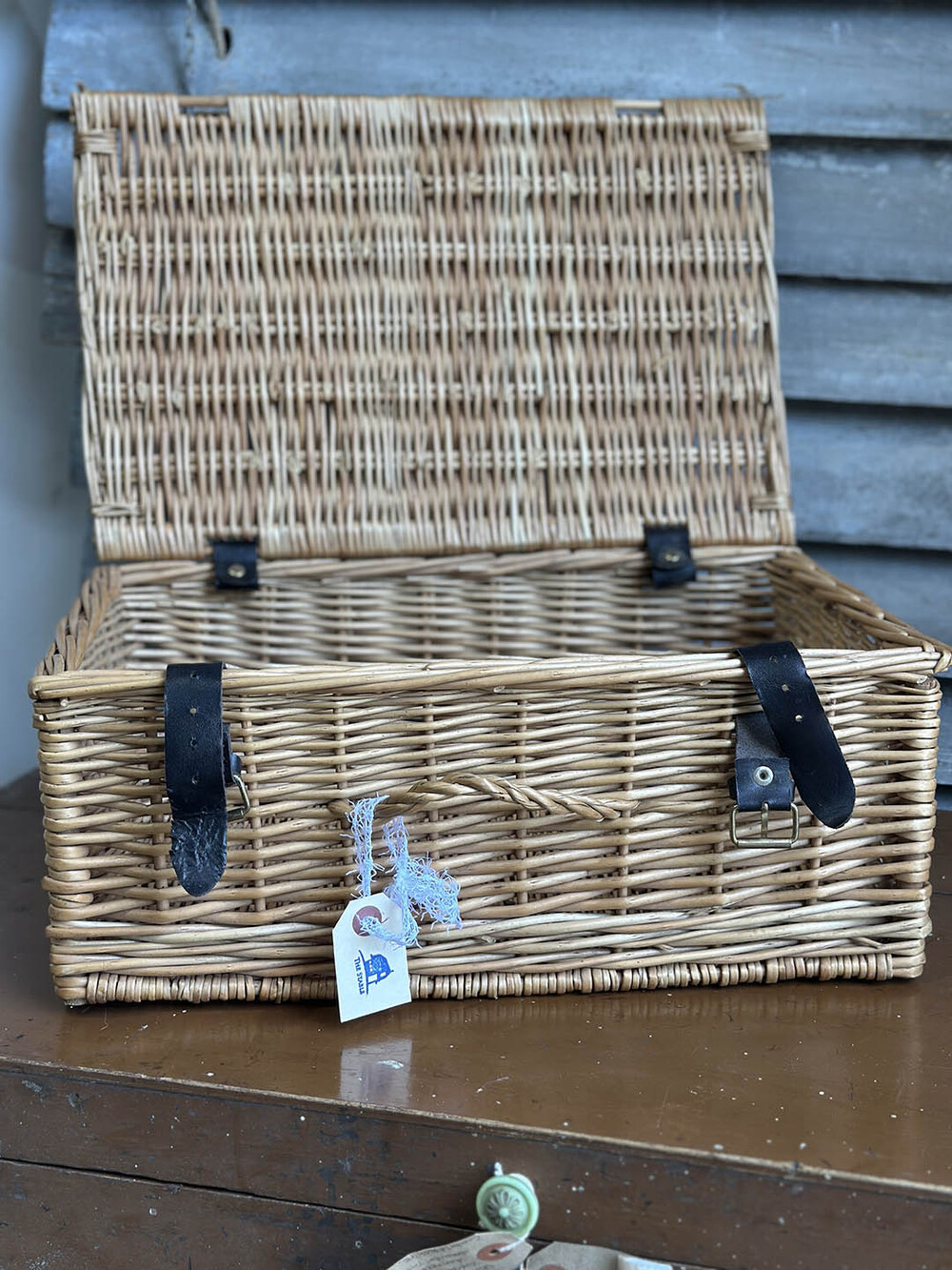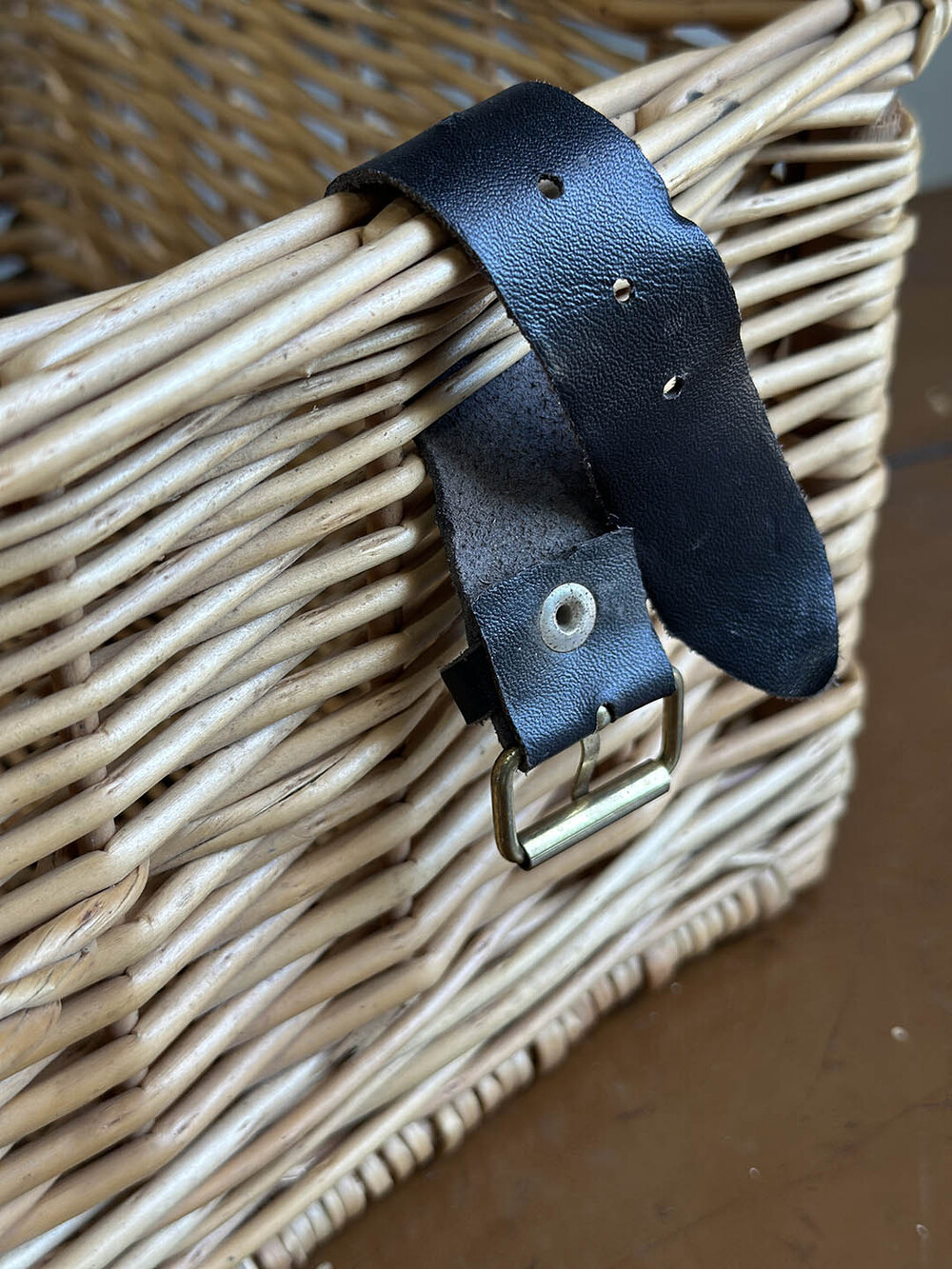 이 바스켓은 실사용을 염두에 두고 만들어진 1960년대 이전의 피크닉 바스켓으로, 가죽 버클과 안정적인 구조가 그대로 남아 있어요. 요즘은 같은 형태가 플라스틱으로 대체되거나, 전혀 다른 재질로 바뀌었기 때문에 천연 위커 바스켓은 더 희소해졌죠.
