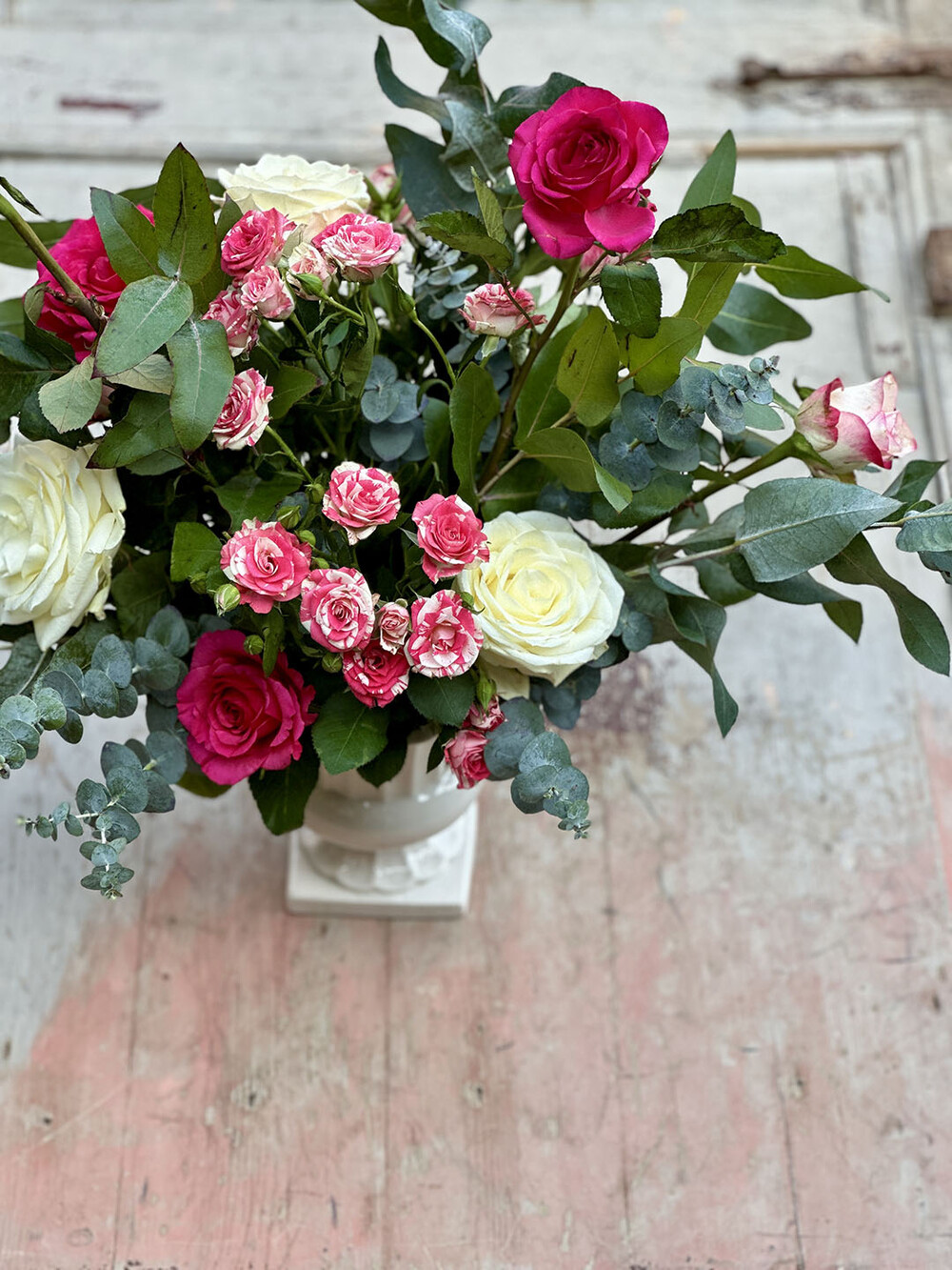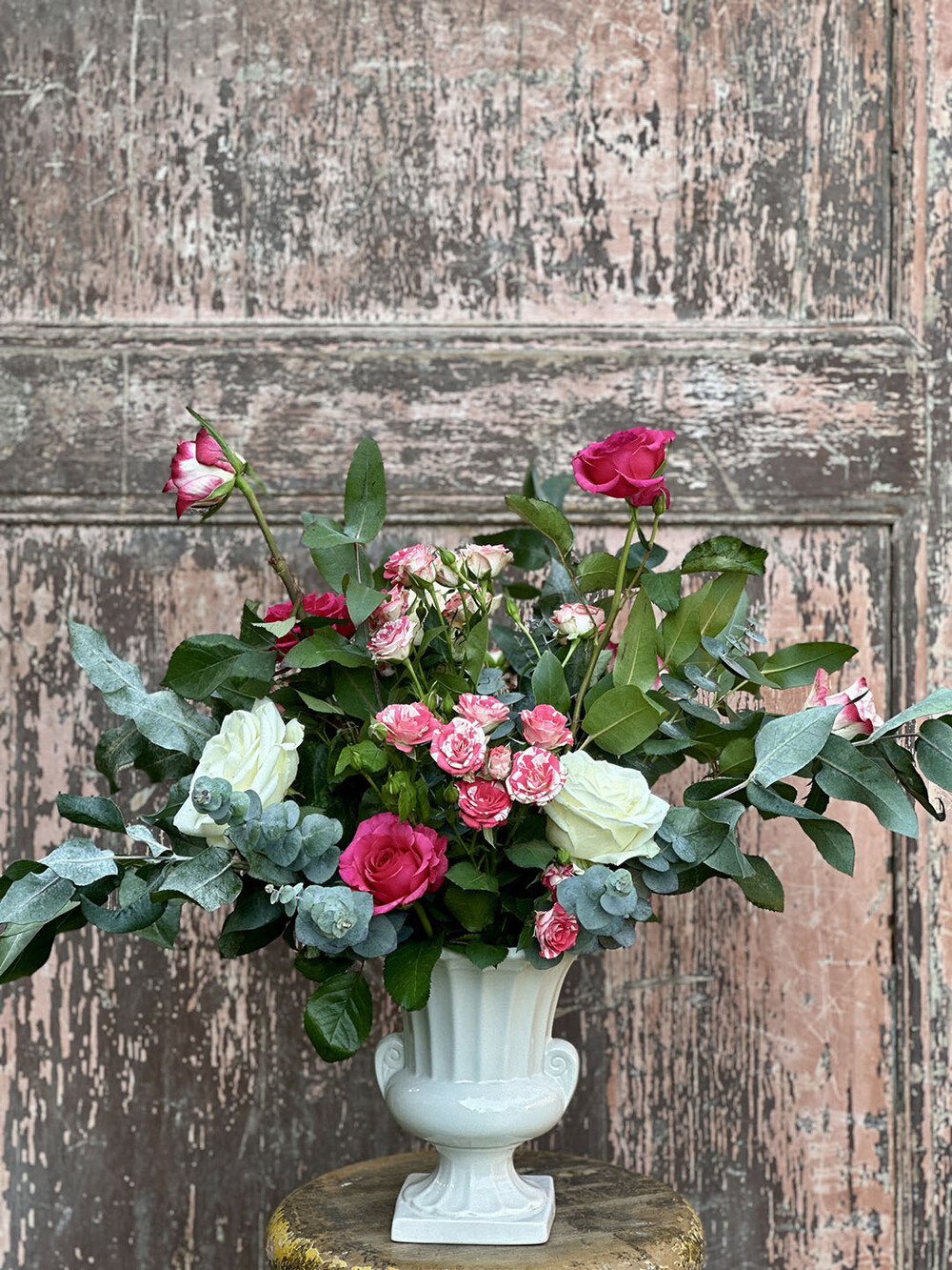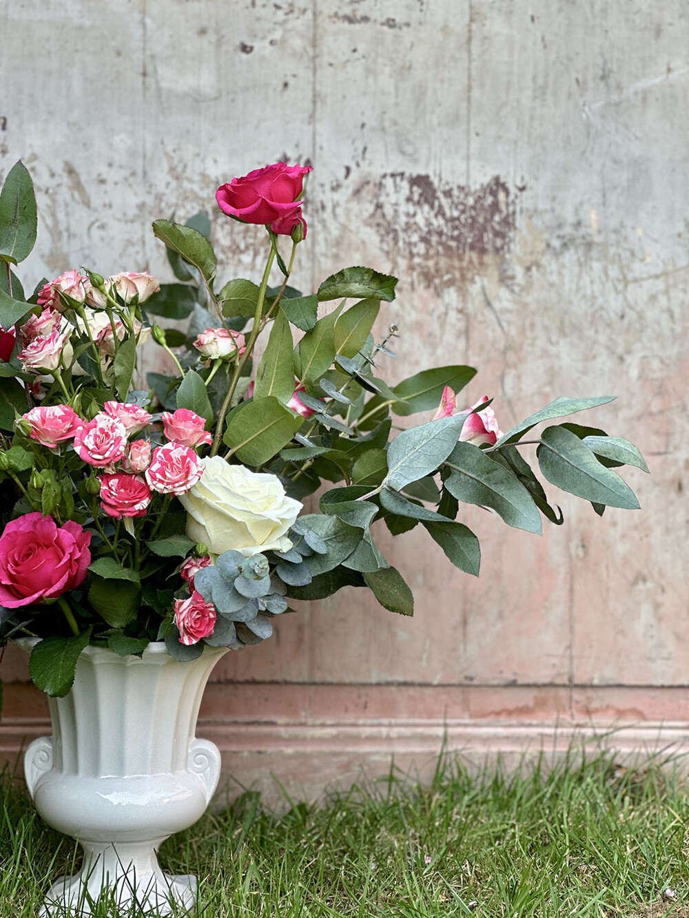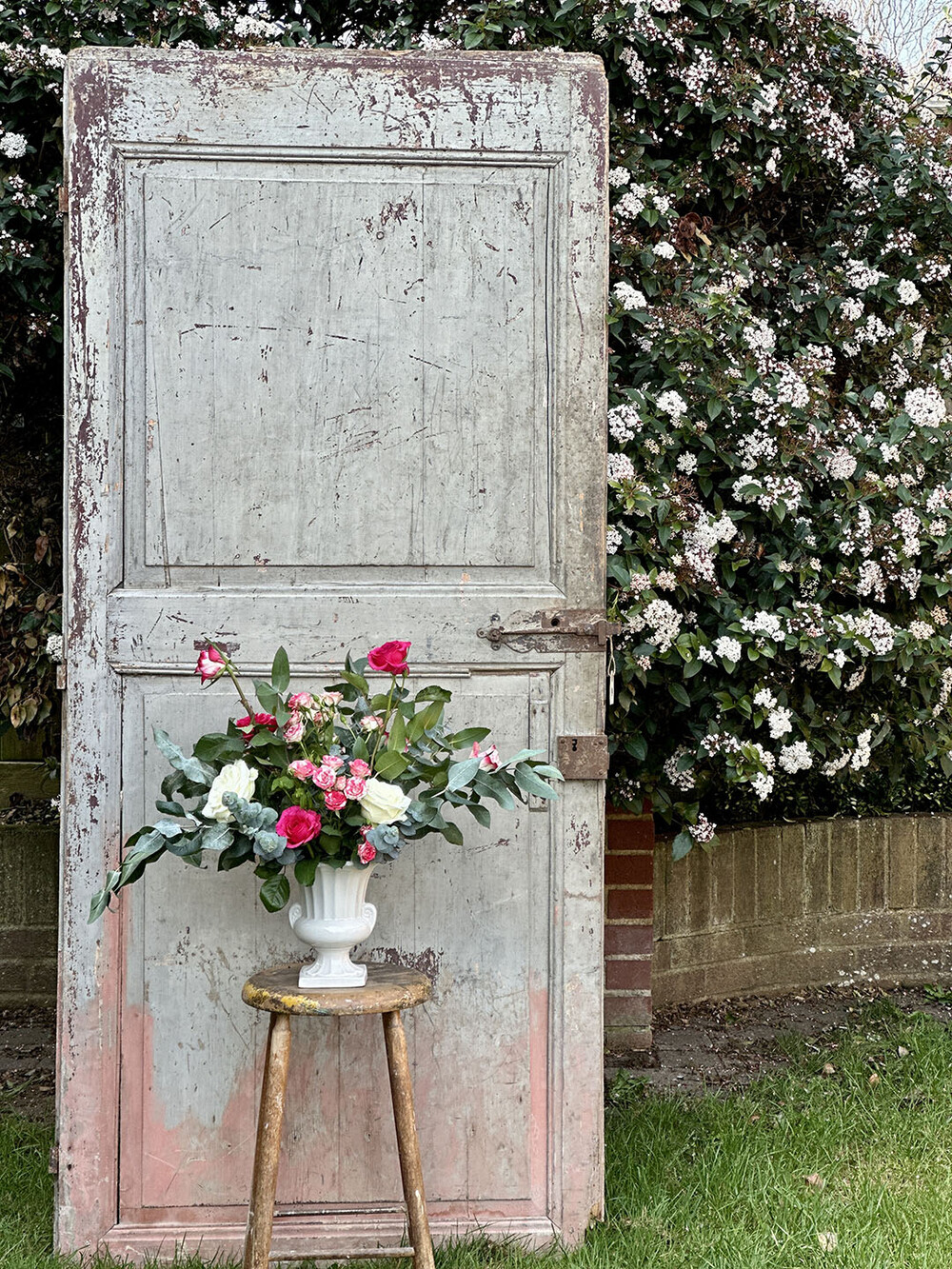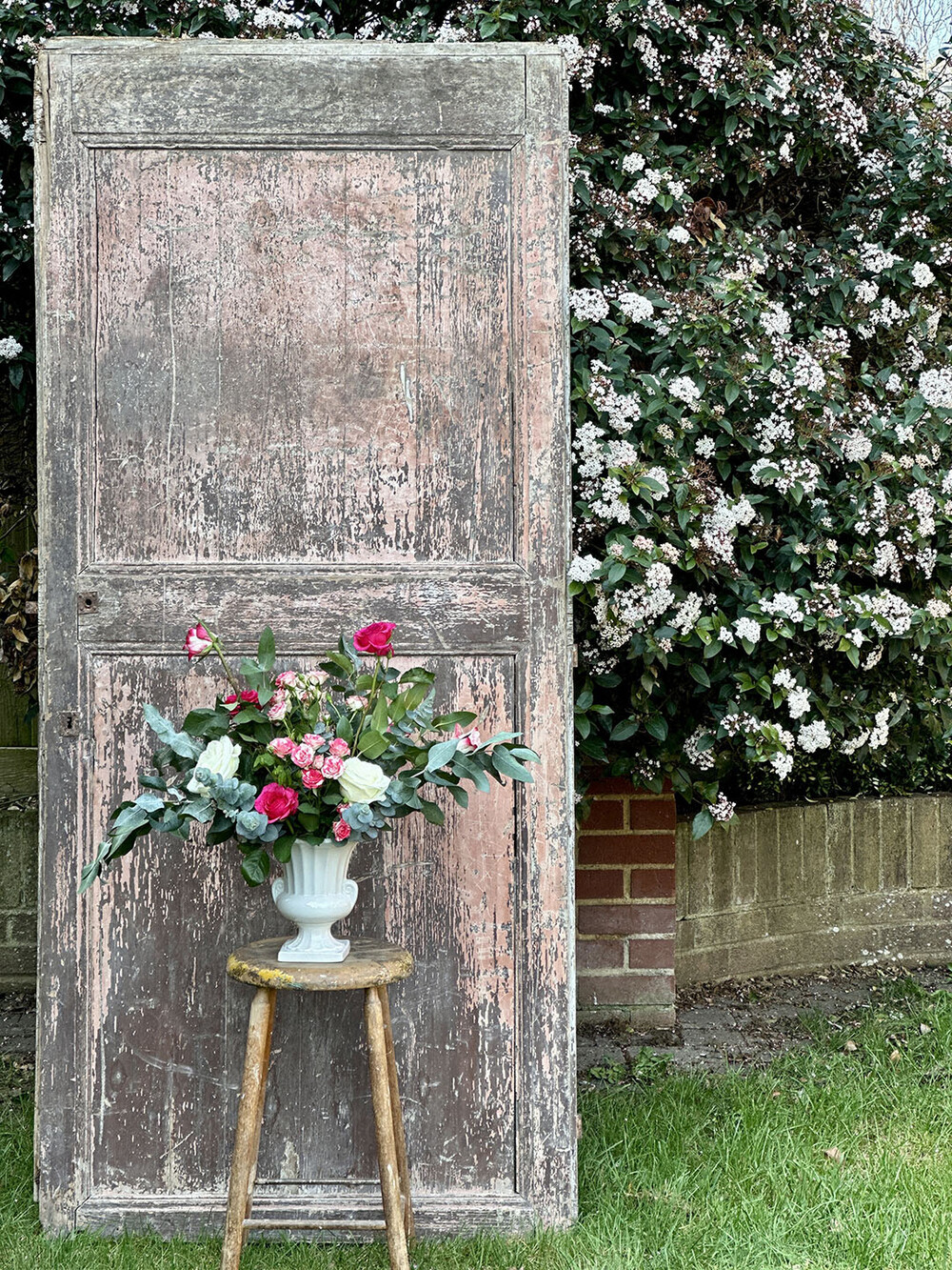 19세기 프렌치 도어로, 외측은 오랜 세월이 남긴 자연스러운 핑크 페인트의 풍화된 미감이, 내측은 그레이 컬러가 메인이 되는 쉐비 시크톤이 매력적으로 대조를 이루고 있습니다.