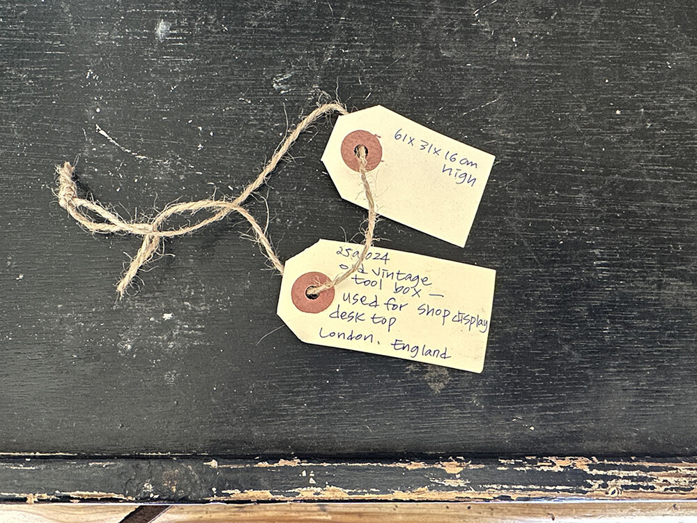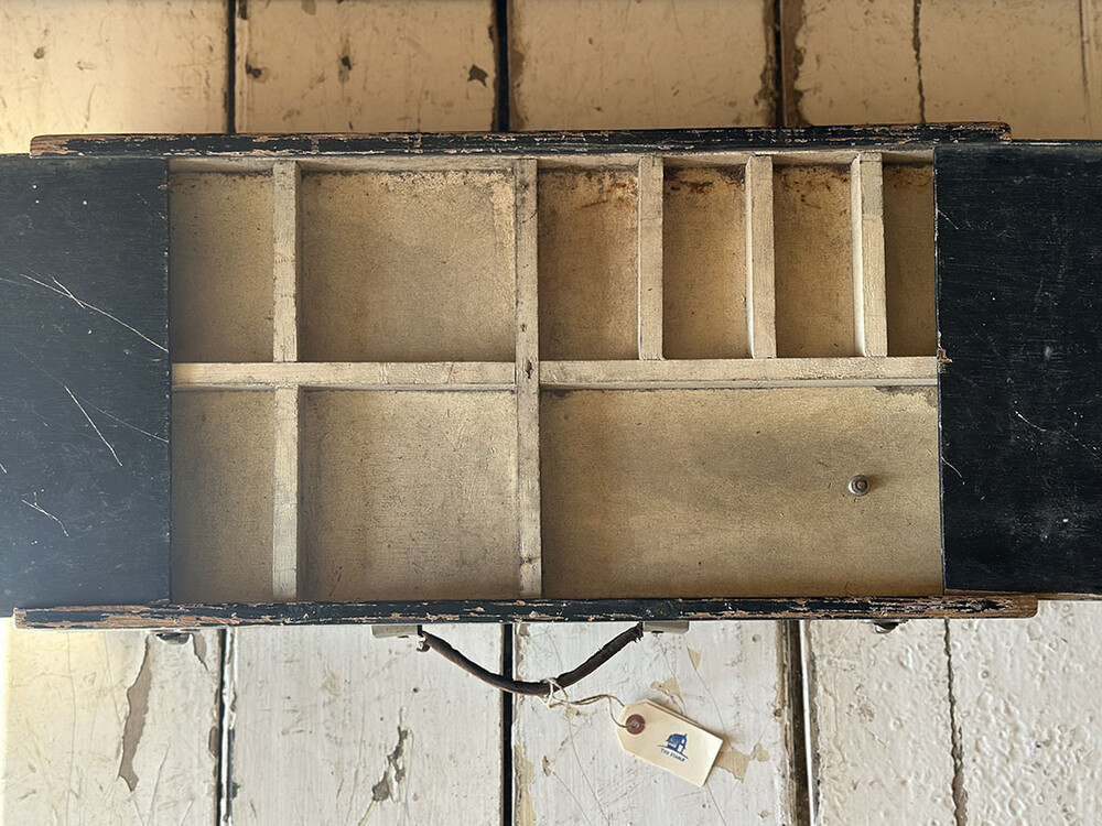 목재로 제작된 올드 빈티지 툴 박스입니다. 명칭대로 공구와 부자재 등을 보관하고, 들고 다니기 위해 만들어진 공구함이죠. 특징은 세월의 미감이 느껴지는 블랙 컬러에, 심플하지만 엣지가 느껴지는 형태가 매력적입니다. 거기에 툴 박스의 상단이 슬라이딩 방식으로 열리고, 그 내부는 피전 홀 형태로 파티션이 나뉘어져 있다는 점입니다.