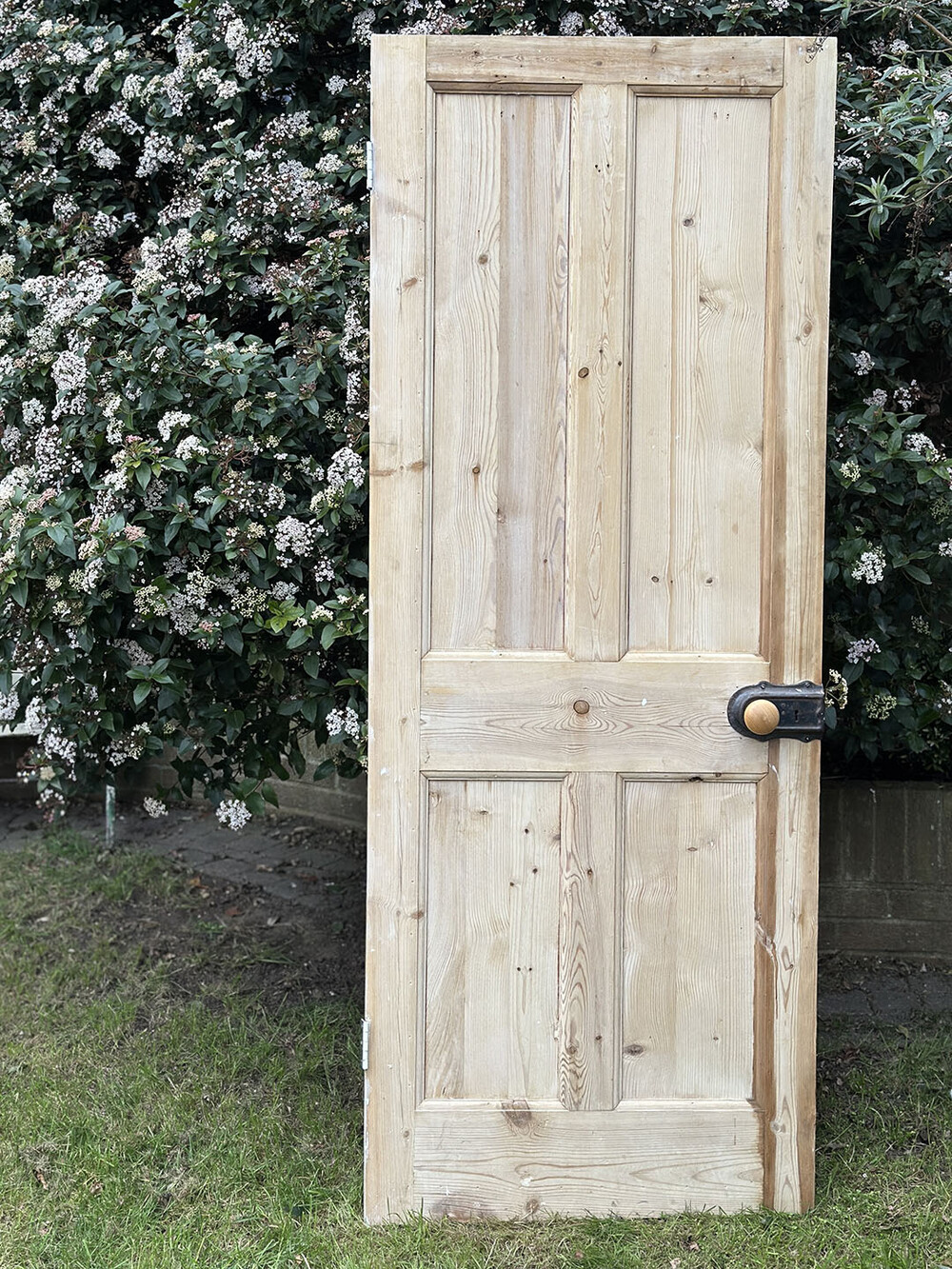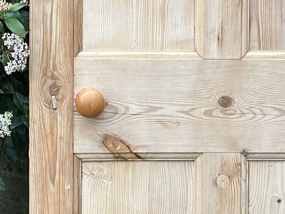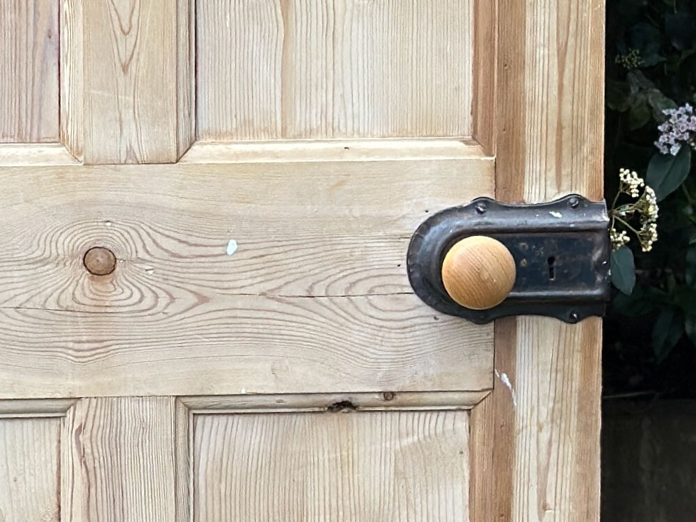 앤틱 파인 소재의 인터널 도어(중문 혹은 방문으로 사용된 실내용 문)입니다. 파인 소재의 가구들이 높은 가치를 형성하고 있는 것처럼, 역시 올드 파인 / 앤틱 파인 소재의 도어나 계단, 난간 등의 자재 역시 희소성이 매우 높은 편입니다. 도어 전체가 파인 원목의 내츄럴 우든 상태로 제작되어 있어 따뜻하고 정감이 가는 느낌을 자아냅니다. 주물로 만들어진 잠금쇠에 물성이 다른 목재 손잡이가 달린 것이 독특합니다.