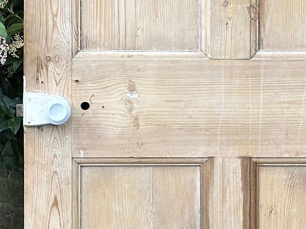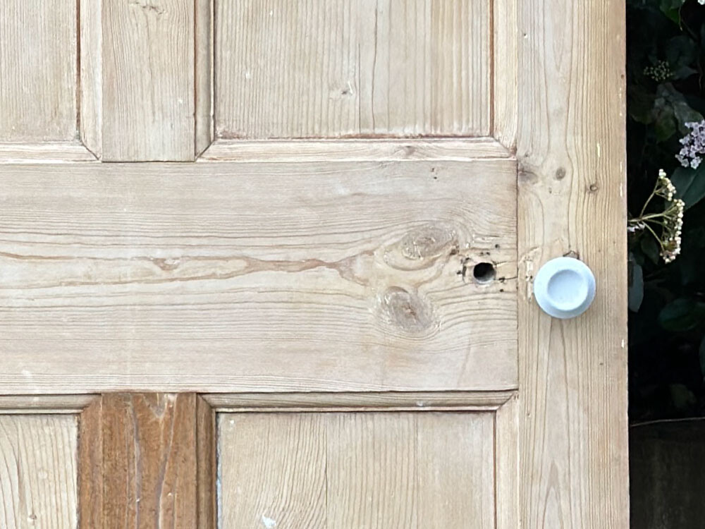 앤틱 파인 소재의 인터널 도어(중문 혹은 방문으로 사용된 실내용 문)입니다. 파인 소재의 가구들이 높은 가치를 형성하고 있는 것처럼, 역시 올드 파인 / 앤틱 파인 소재의 도어나 계단, 난간 등의 자재 역시 희소성이 매우 높은 편입니다. 도어 전체가 파인 원목의 내츄럴 우든 상태로 제작되어 있어 따뜻하고 정감이 가는 느낌을 자아냅니다. 잠금쇠와 볼 타입의 도어 핸들이 모두 주물로 제작되어 있어서 약간의 무게감을 더하고 있습니다.