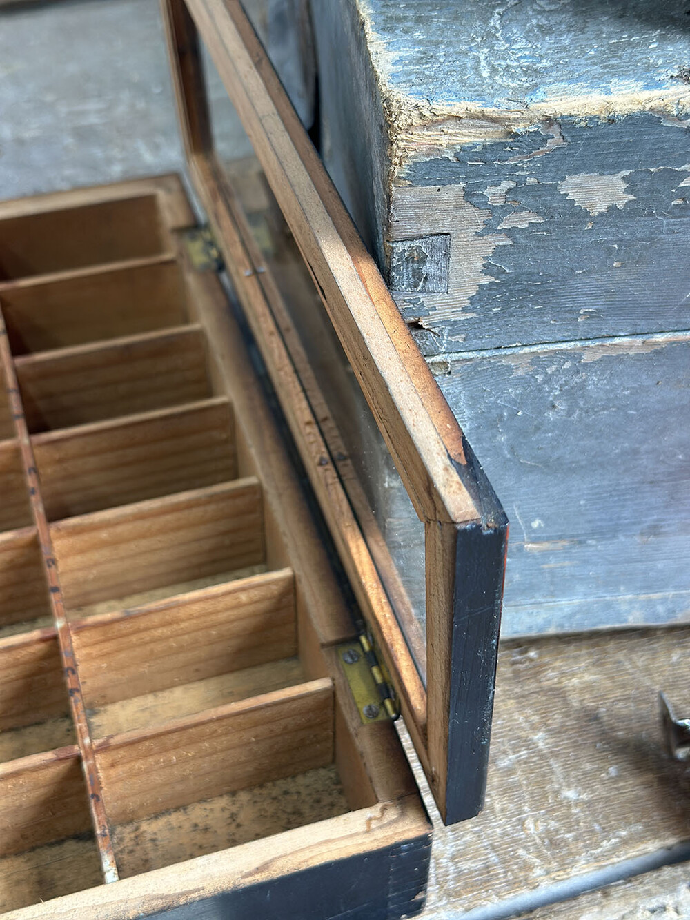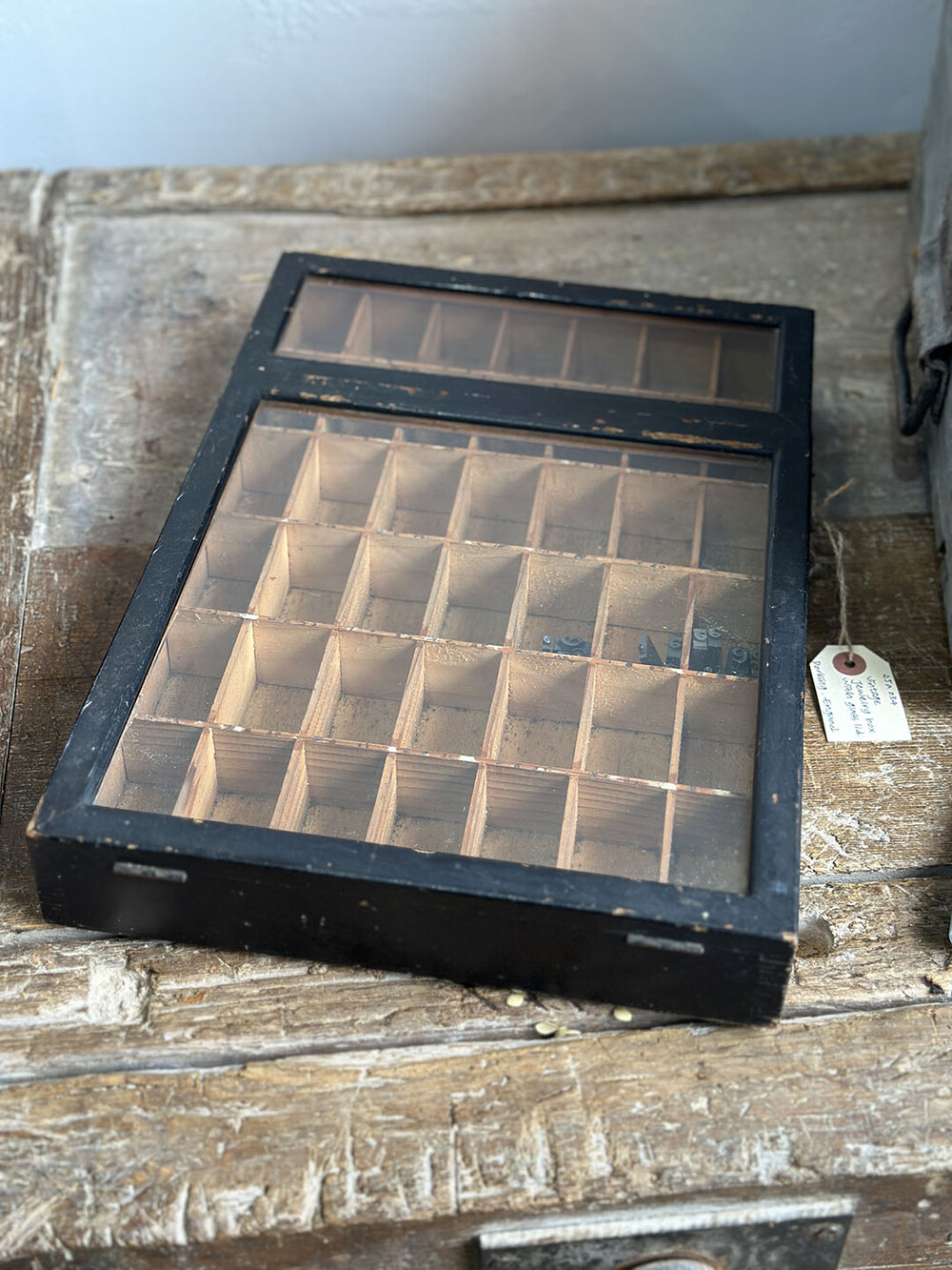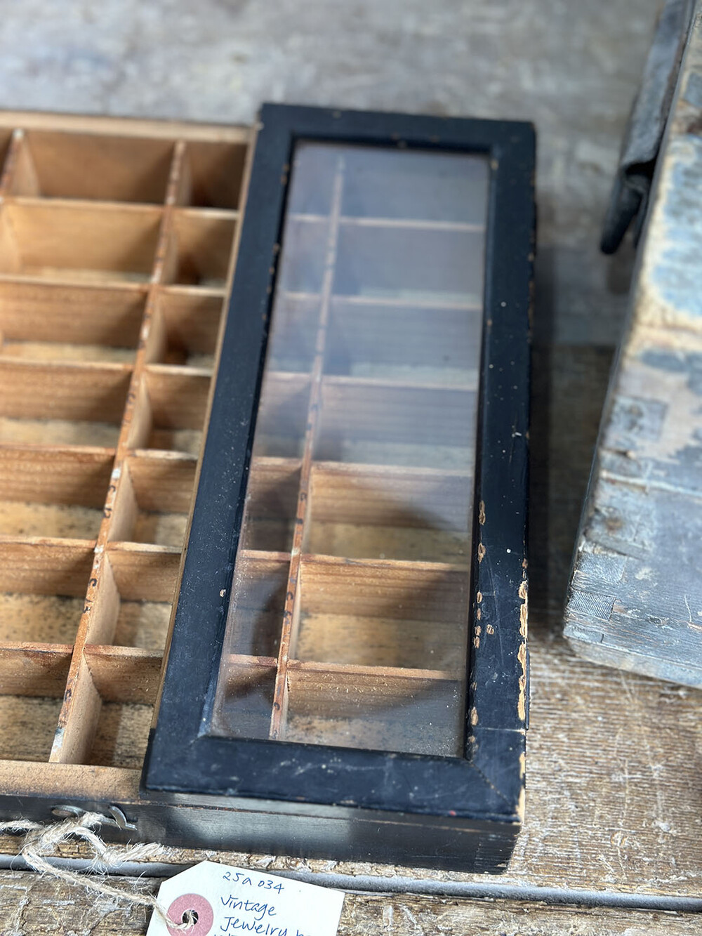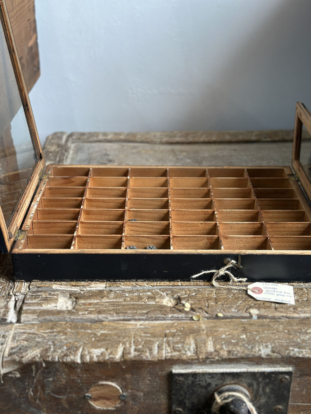 빈티지 주얼리 박스입니다. 에보니(흑단) 컬러의 프레임 박스에 글레이즈드 글래스가 추가된 커버 리드가 양쪽으로 열리게 되어 있습니다.