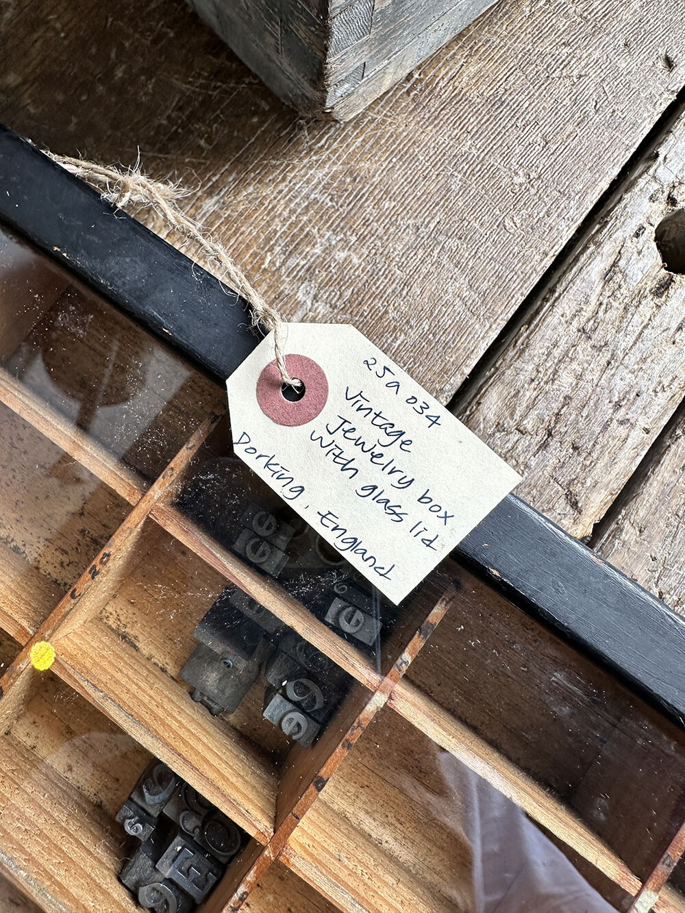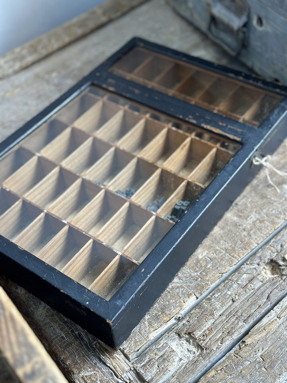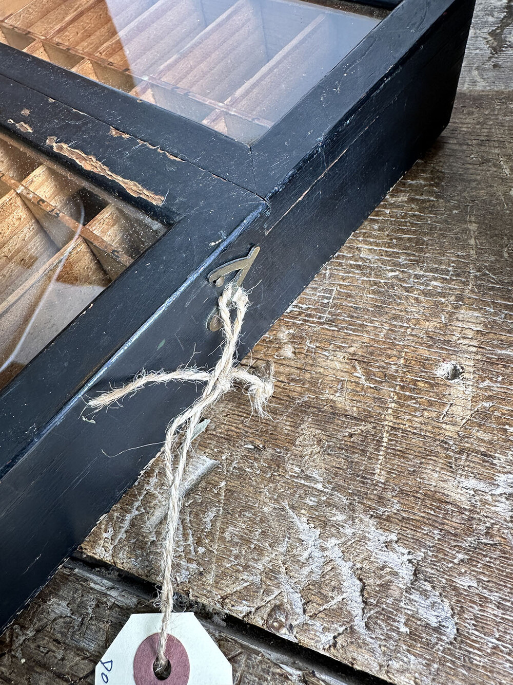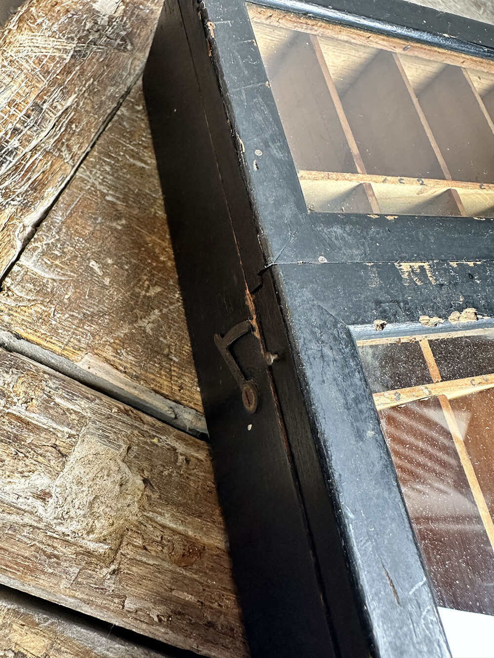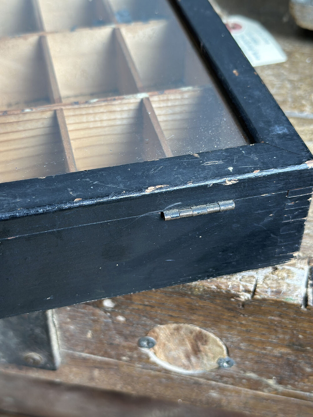 빈티지 주얼리 박스입니다. 에보니(흑단) 컬러의 프레임 박스에 글레이즈드 글래스가 추가된 커버 리드가 양쪽으로 열리게 되어 있습니다.