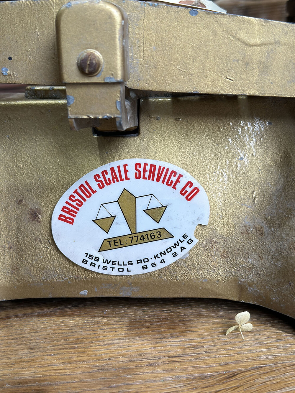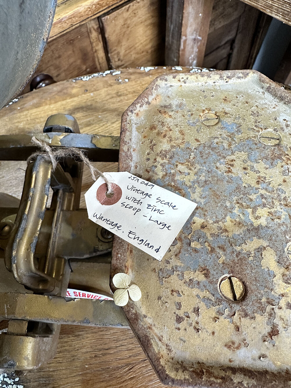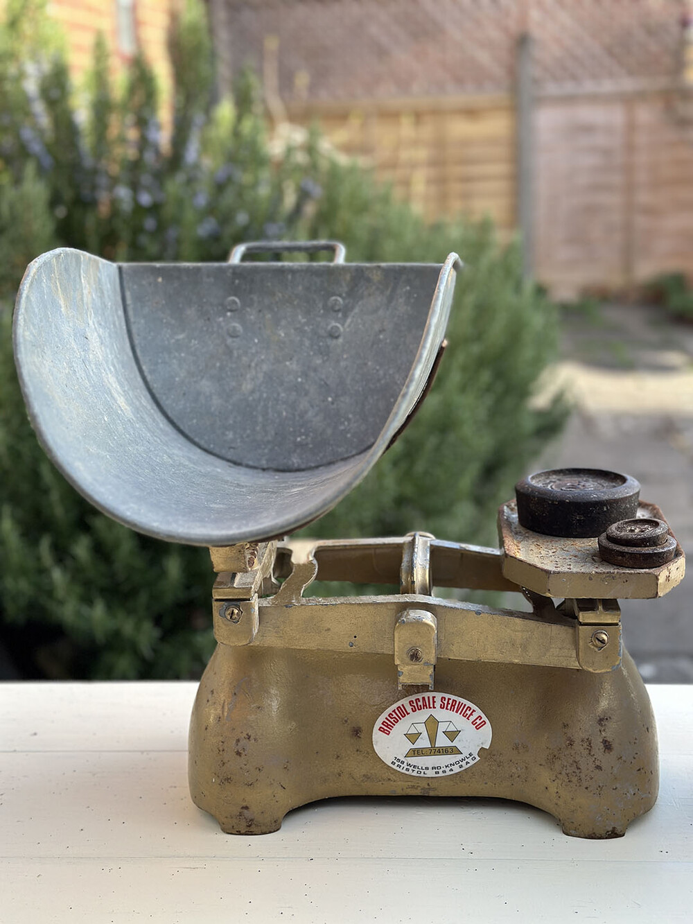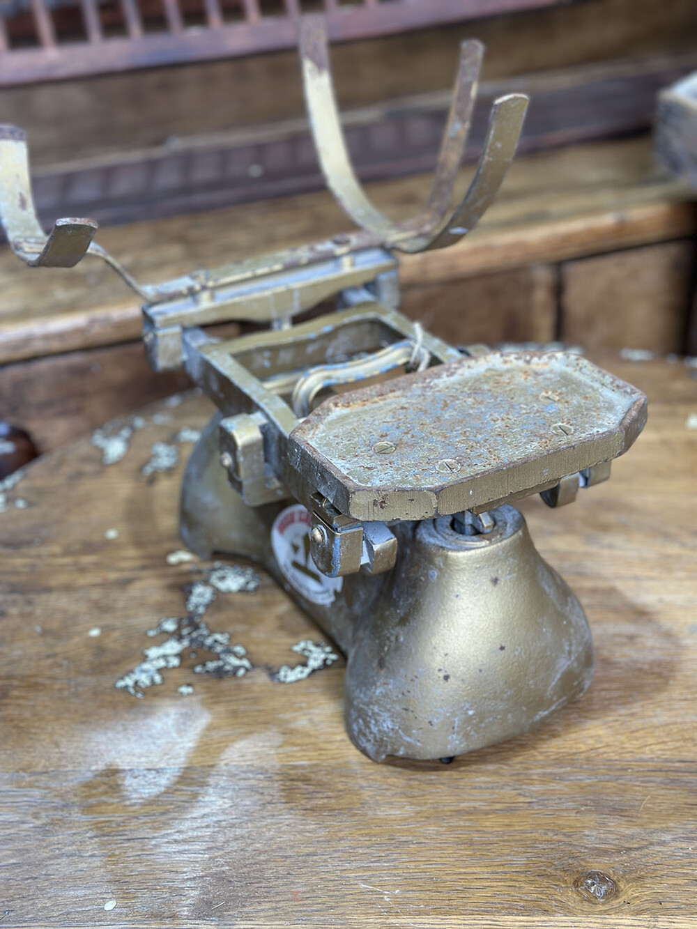 영국 브리스톨 스케일 서비스의 기계식 저울입니다. 골드 컬러의 저울은 주물로 제작되어 매우 묵직한 인상을 주는데요, 여기에 징크로 된 커다란 스쿱이 딸려 있어서 인상적입니다. 커다란 징크 스쿱이 딸려 있는 이유는, 곡물의 무게를 재기 위해 제작된 저울이기 때문이라고 해요.