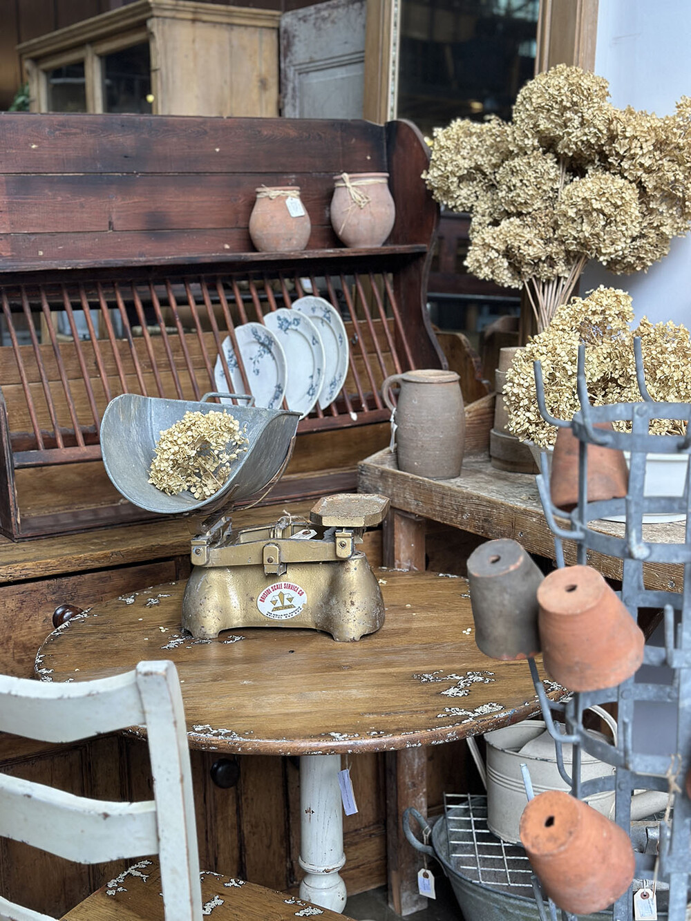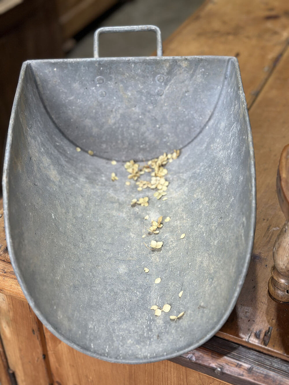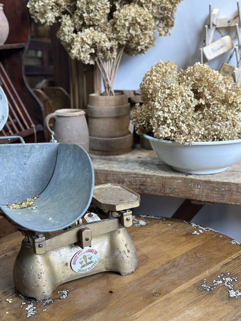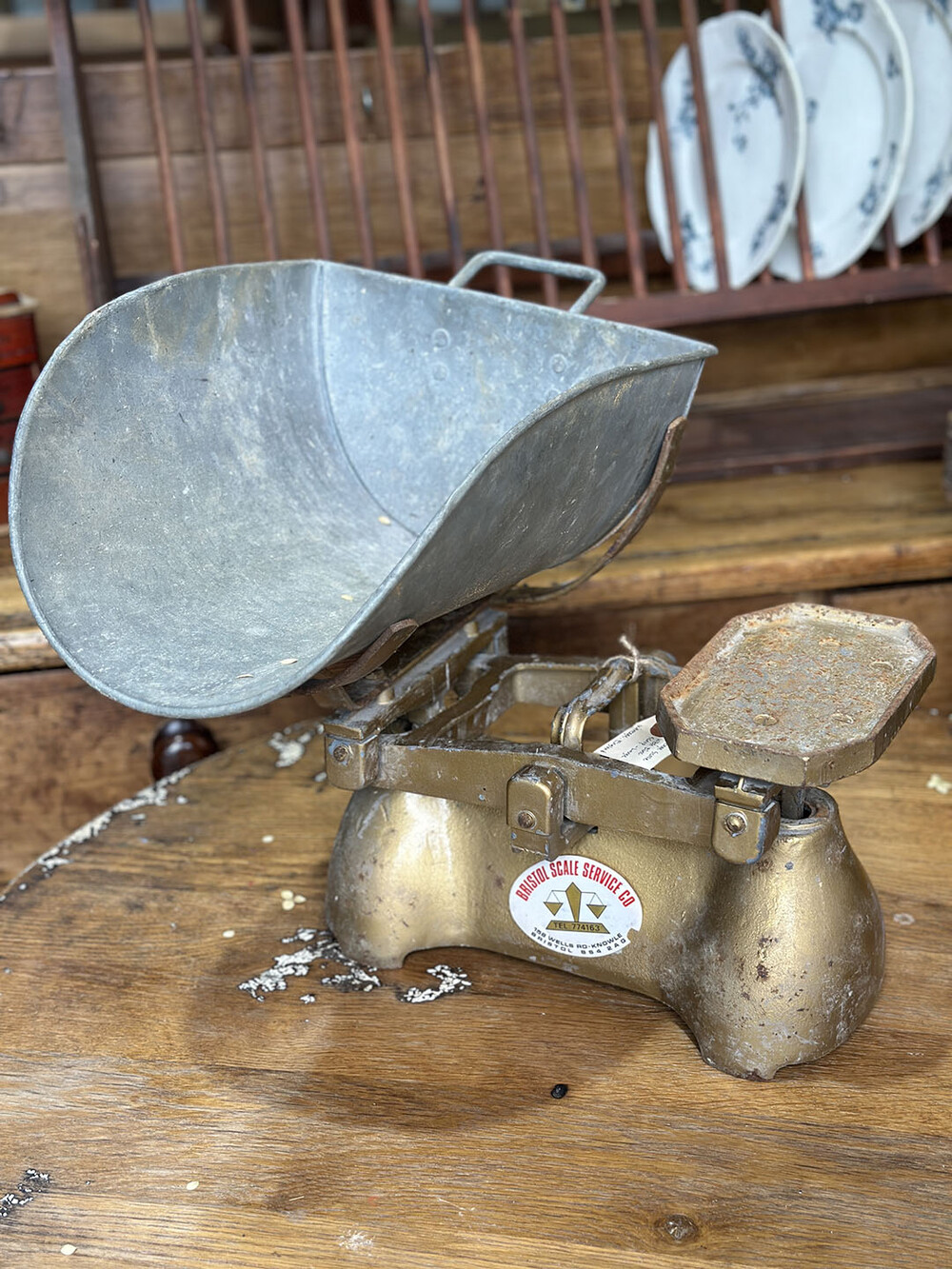 영국 브리스톨 스케일 서비스의 기계식 저울입니다. 골드 컬러의 저울은 주물로 제작되어 매우 묵직한 인상을 주는데요, 여기에 징크로 된 커다란 스쿱이 딸려 있어서 인상적입니다. 커다란 징크 스쿱이 딸려 있는 이유는, 곡물의 무게를 재기 위해 제작된 저울이기 때문이라고 해요.
