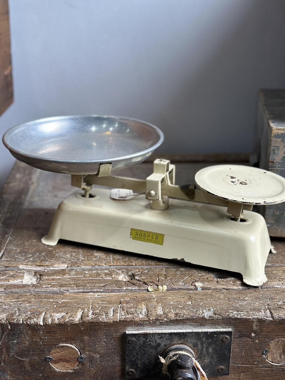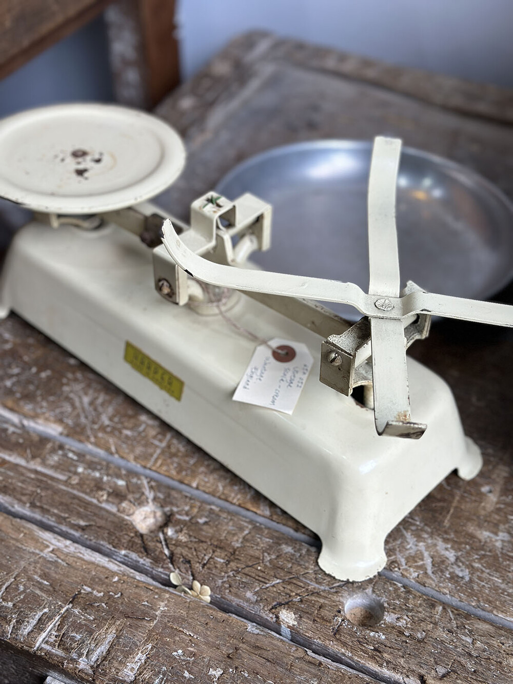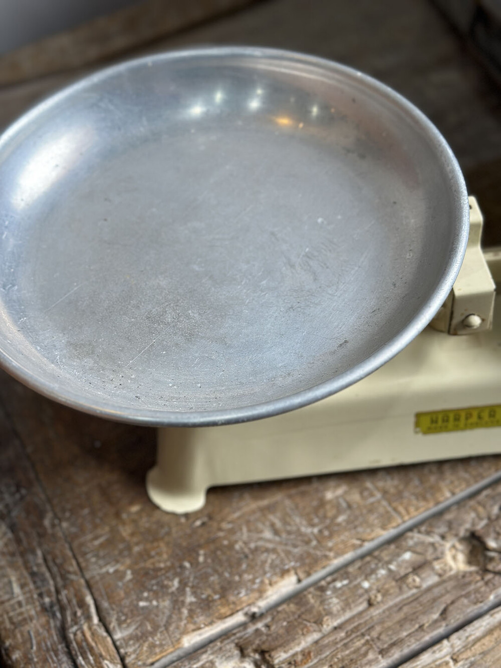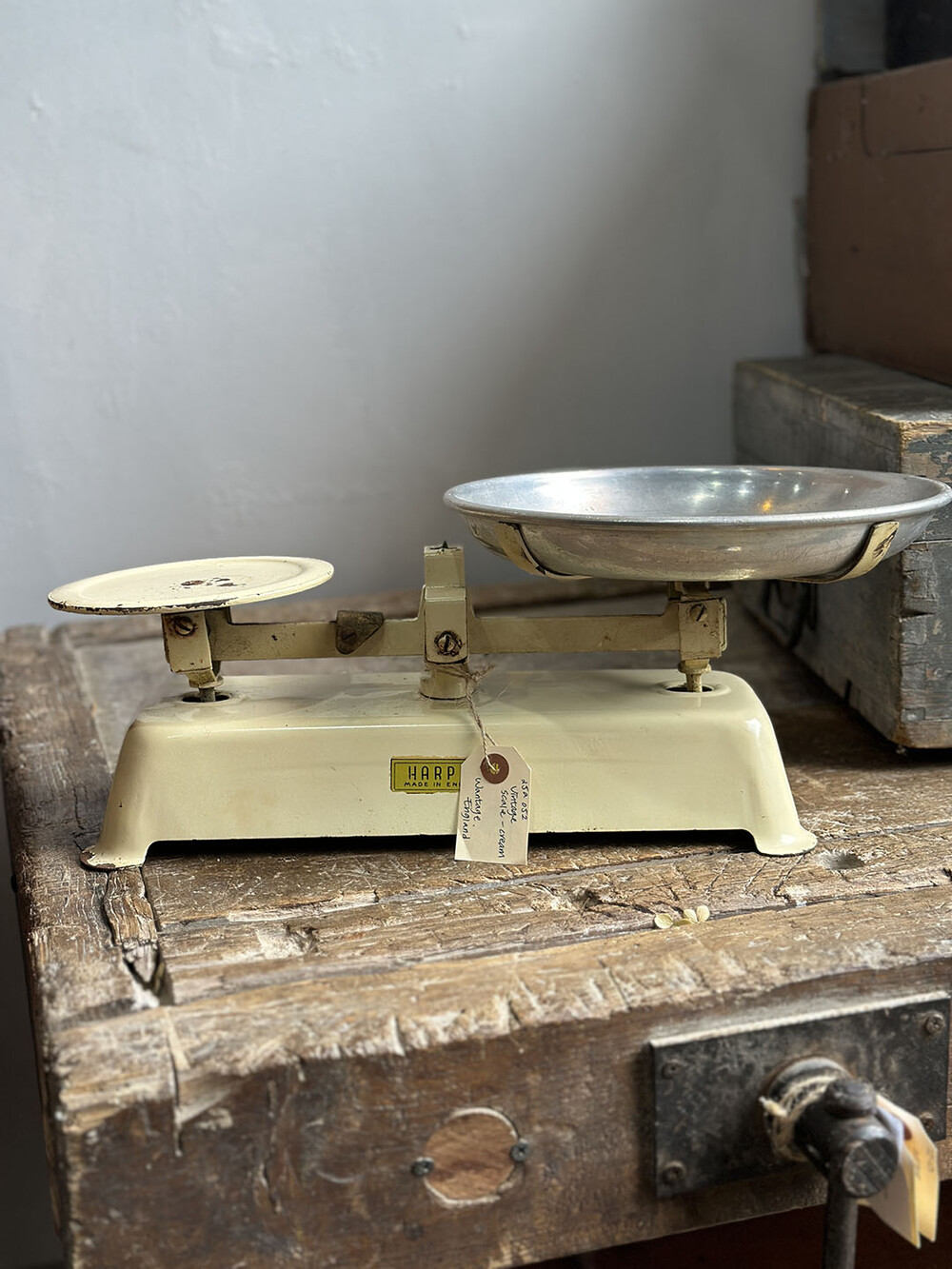 크림 컬러의 기계식 저울입니다. 무쇠 주물로 제작한 저울의 몸체에 크림 컬러의 에나멜(법랑)을 입혀서 색을 냈어요. 빈티지 에나멜 특유의 파티나가 오랜 시간에 걸쳐 형성되면서, 빈티지 특유의 미감이 완성된 상태입니다. 계량 기능도 정상적으로 작동하고, 무게를 잴 물건을 올려 놓을 트레이는 스테인스로 제작 되어 있는데, 탈착이 가능합니다.