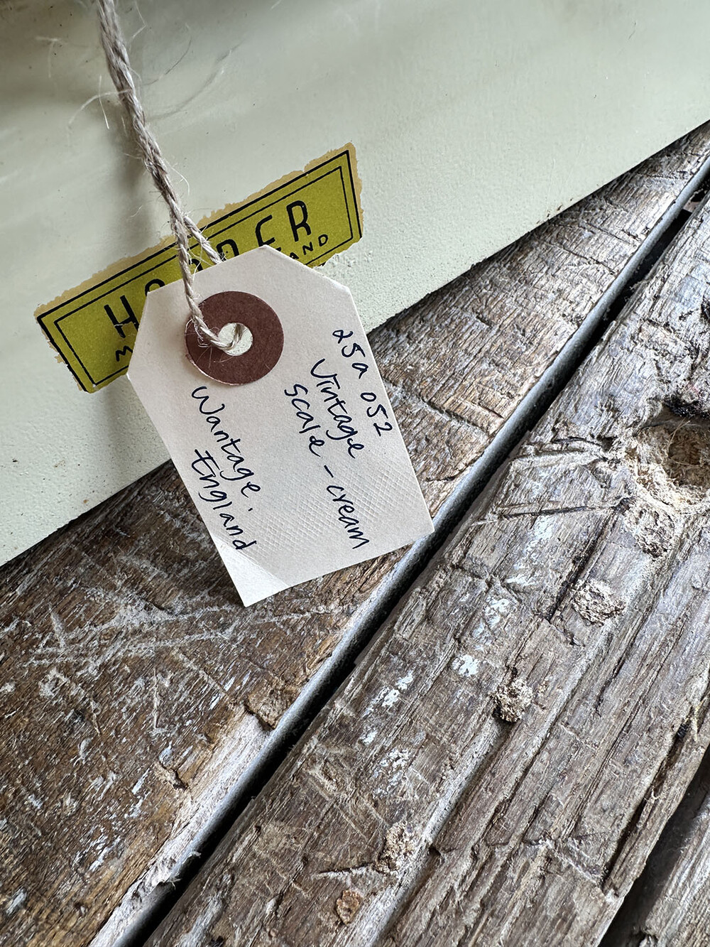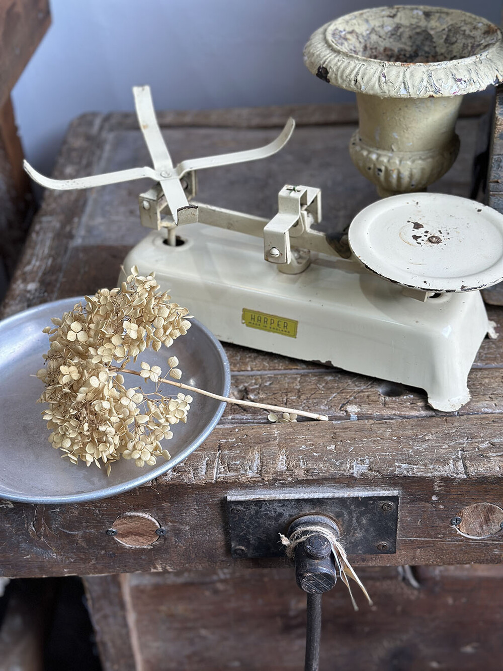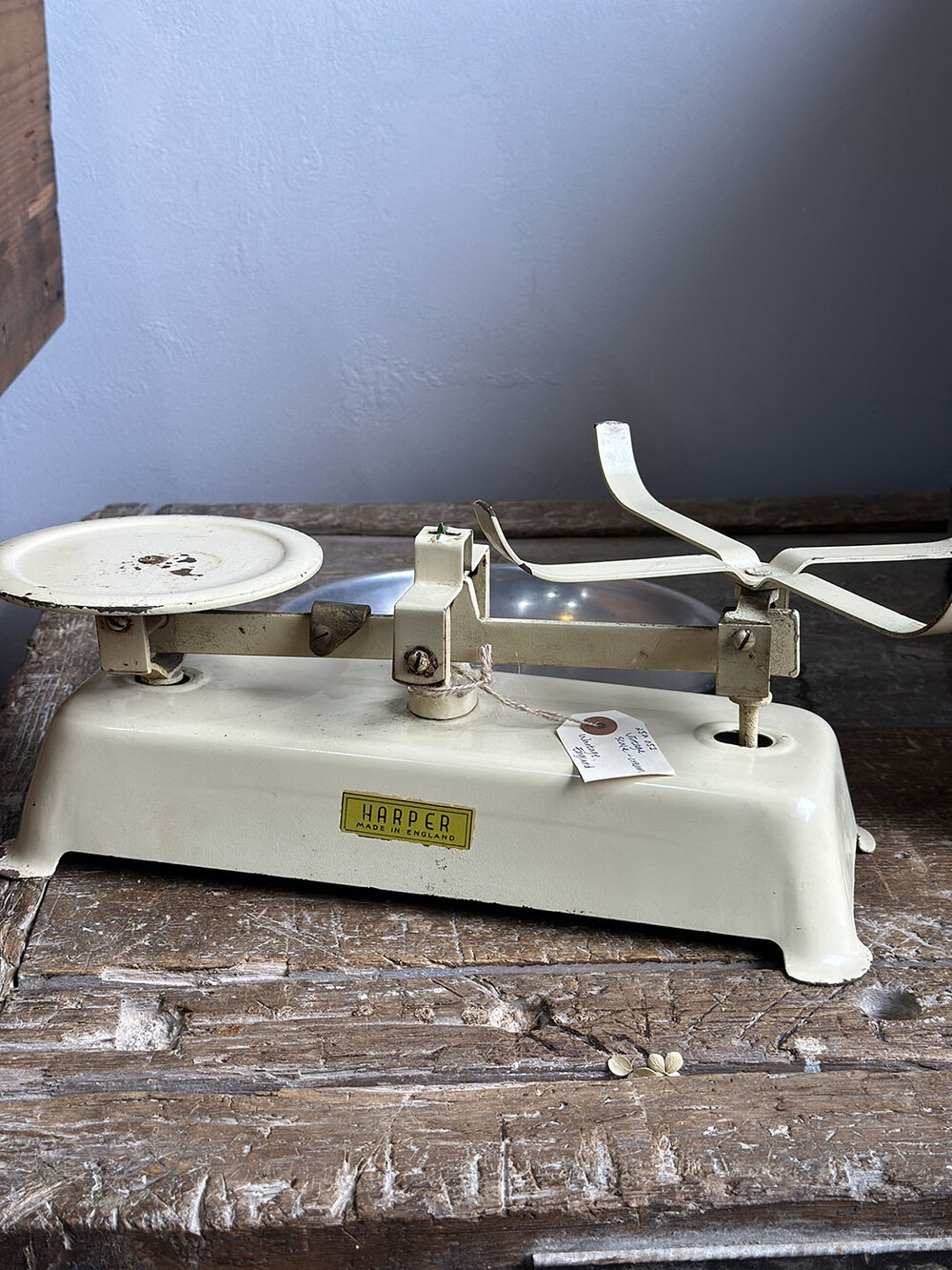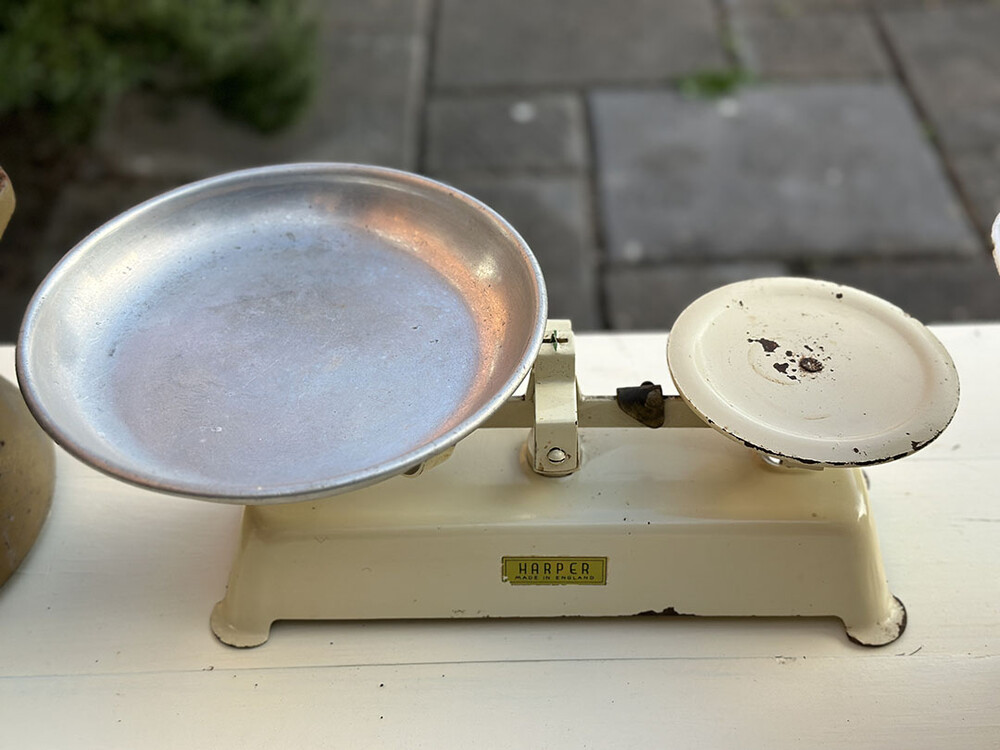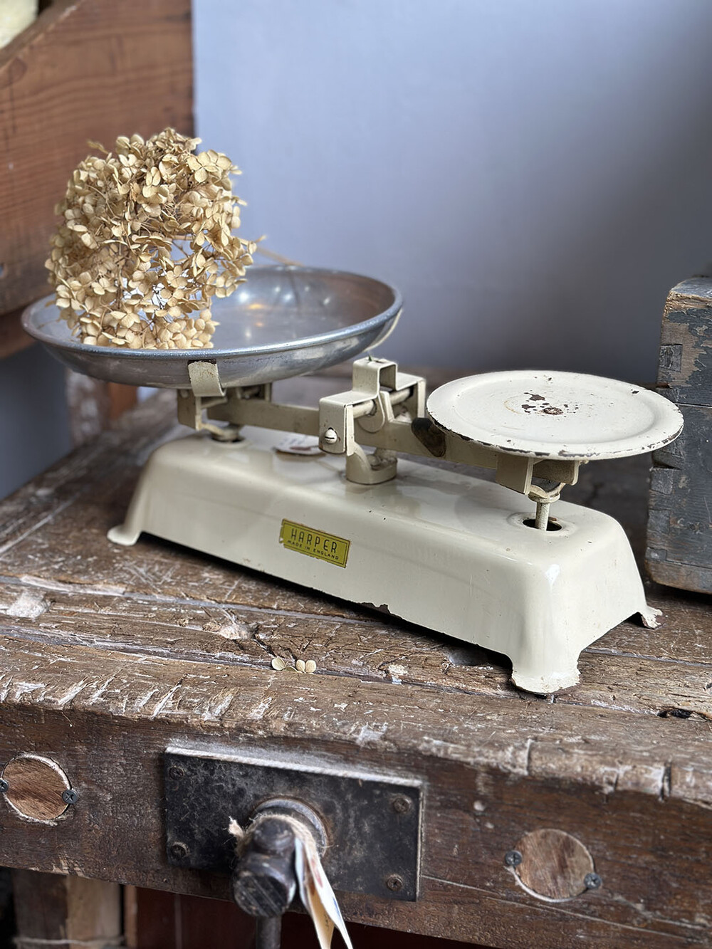 크림 컬러의 기계식 저울입니다. 무쇠 주물로 제작한 저울의 몸체에 크림 컬러의 에나멜(법랑)을 입혀서 색을 냈어요. 빈티지 에나멜 특유의 파티나가 오랜 시간에 걸쳐 형성되면서, 빈티지 특유의 미감이 완성된 상태입니다. 계량 기능도 정상적으로 작동하고, 무게를 잴 물건을 올려 놓을 트레이는 스테인스로 제작 되어 있는데, 탈착이 가능합니다.