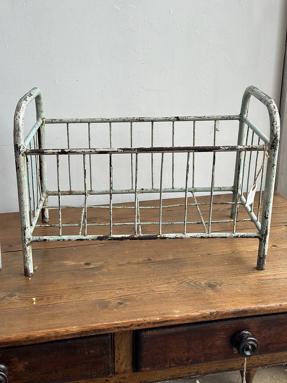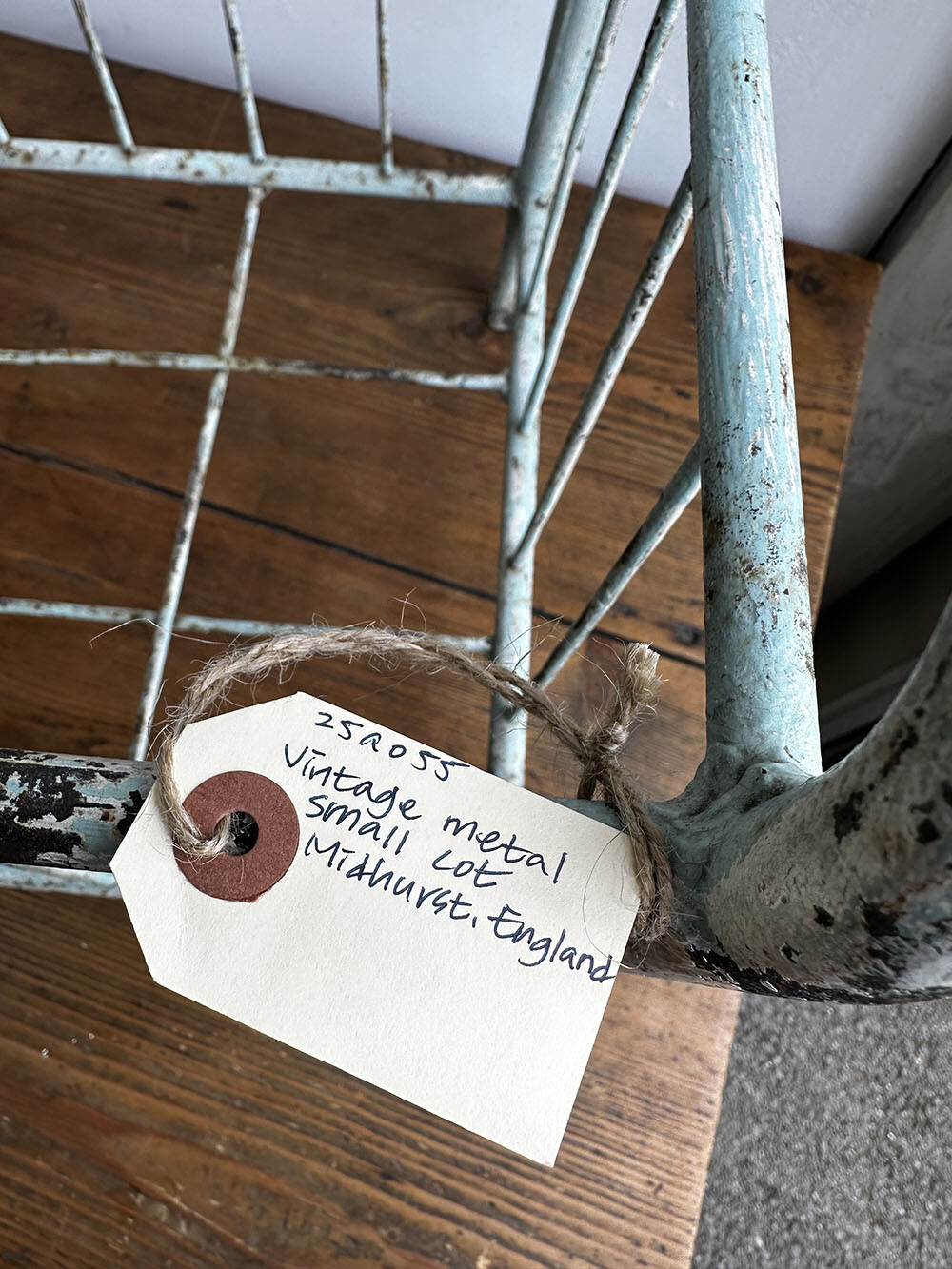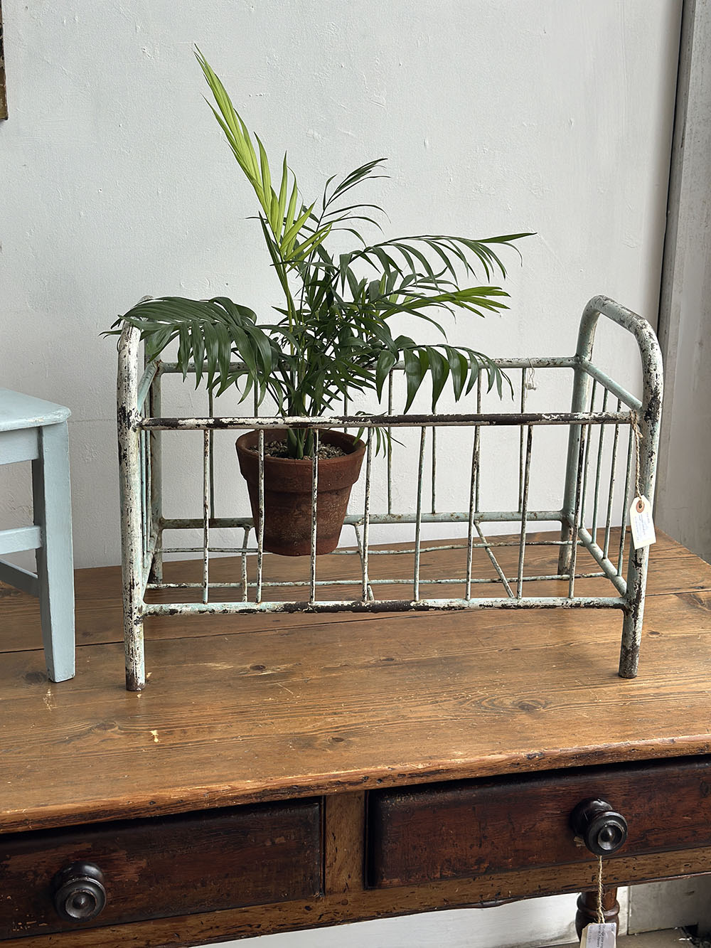 본래는 철제로 제작된 작은 아기용 침대 프레임으로, 스카이 블루의 쉐비 시크 페인팅이 남아 있습니다. 빈티지 디스플레이의 기본적인 베이스가 되는 아이템이므로, 활용 방향은 매우 다양한데요. 참고로 해당 아이템은 미드허스트에서 구근을 심어 놓은 테라코타 화분이 담겨져 있는 상태에서 발견 되어 수집 되었습니다.