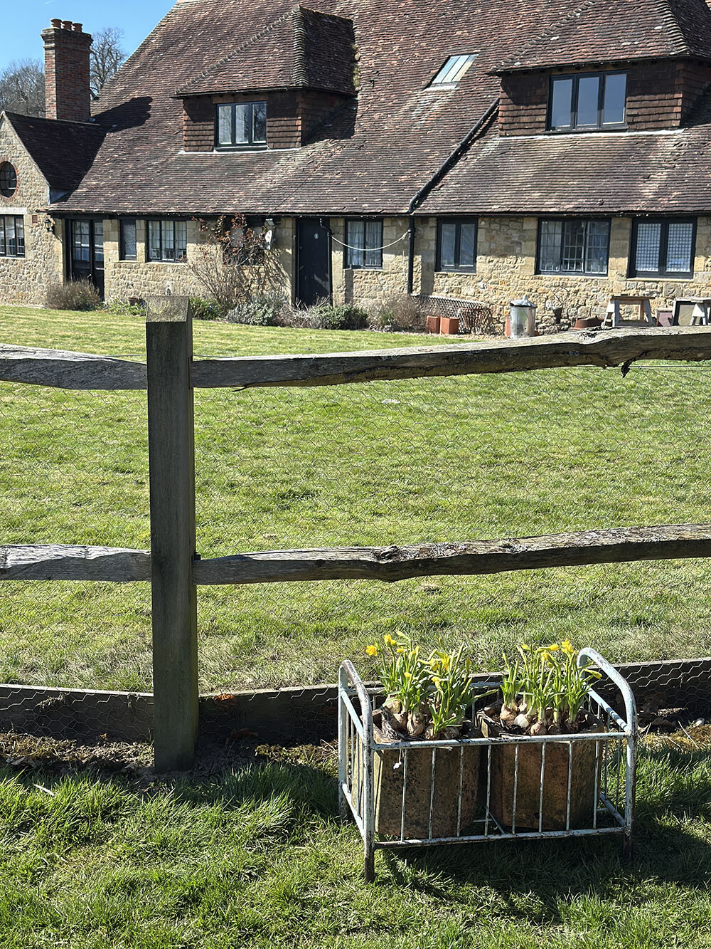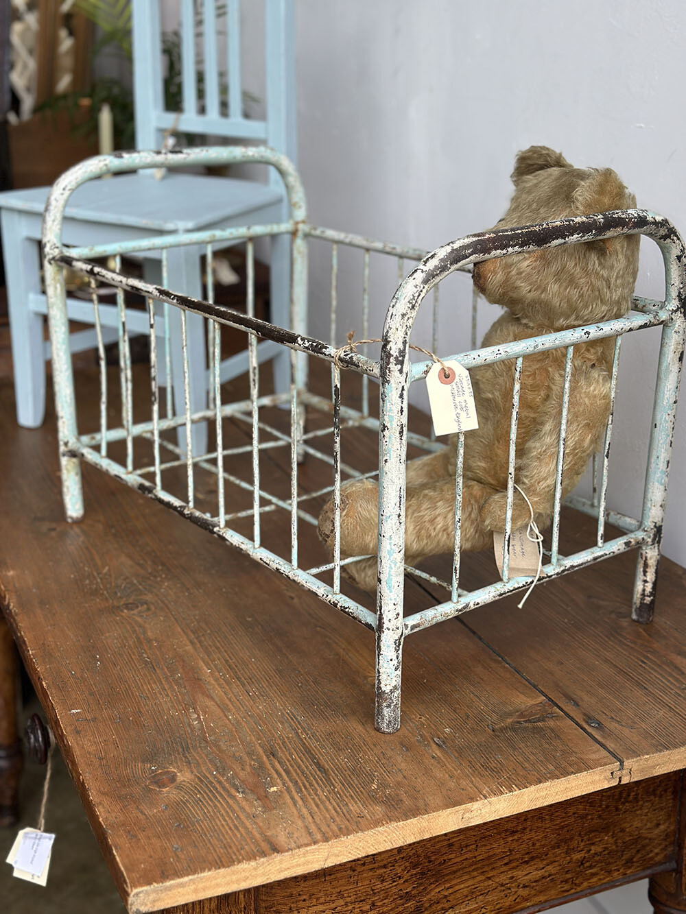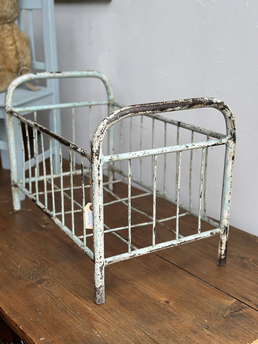 본래는 철제로 제작된 작은 아기용 침대 프레임으로, 스카이 블루의 쉐비 시크 페인팅이 남아 있습니다. 빈티지 디스플레이의 기본적인 베이스가 되는 아이템이므로, 활용 방향은 매우 다양한데요. 참고로 해당 아이템은 미드허스트에서 구근을 심어 놓은 테라코타 화분이 담겨져 있는 상태에서 발견 되어 수집 되었습니다.