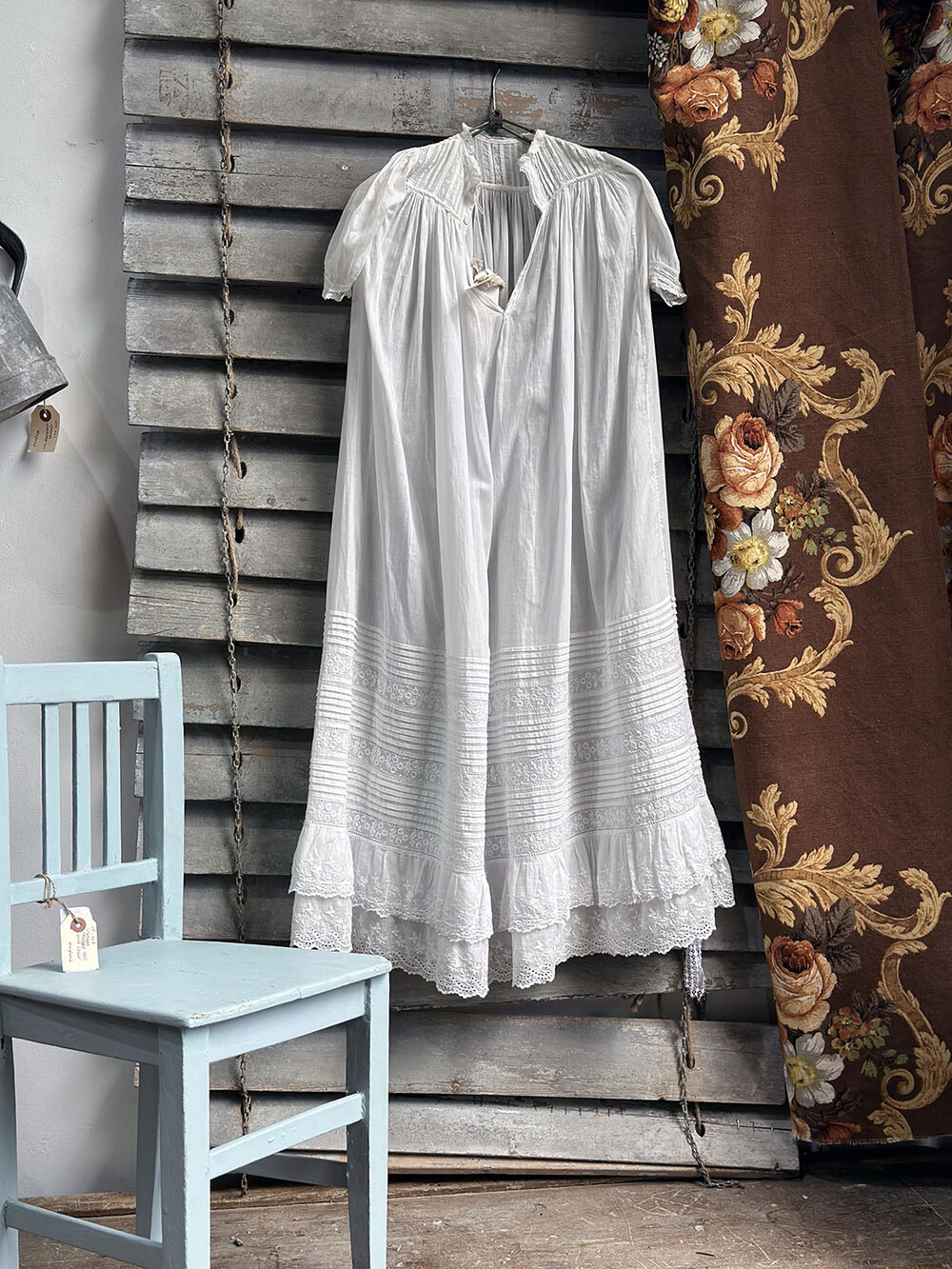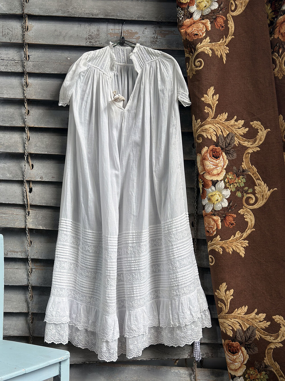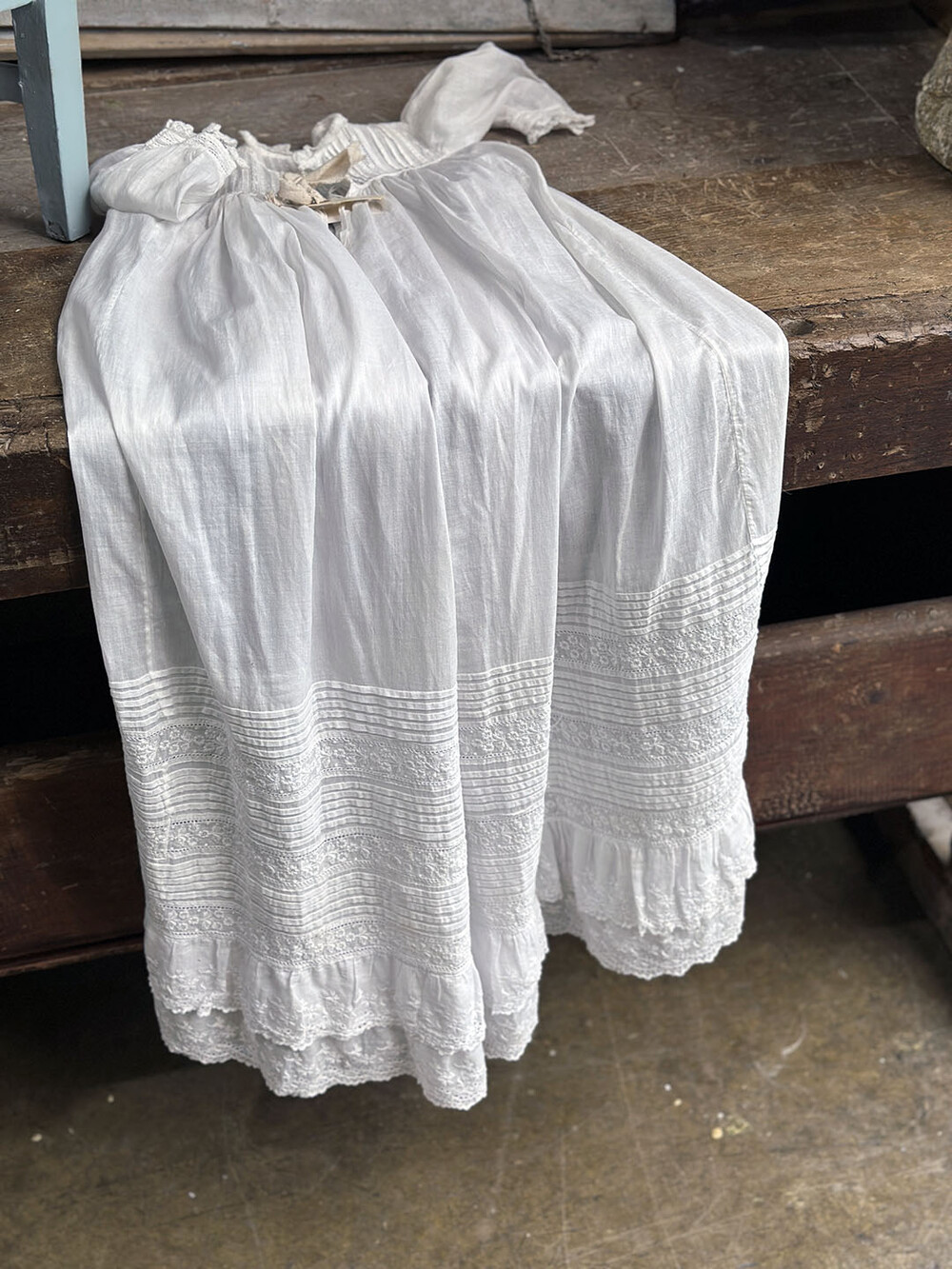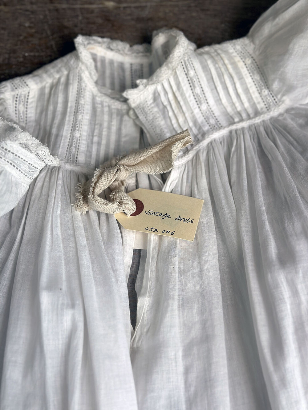 길이 약 96cm의 빈티지 베이비 드레스로, 섬세한 핀턱과 레이스 장식이 특징이며, 자연스러운 에이징이 느껴지는 순면 소재로 제작되었습니다.