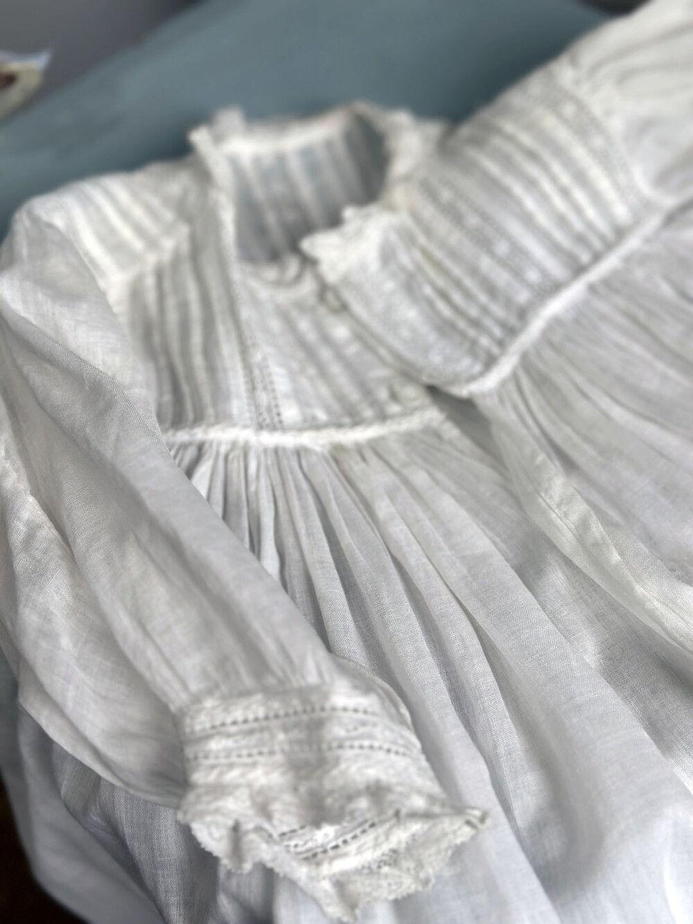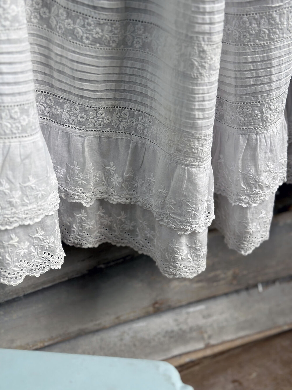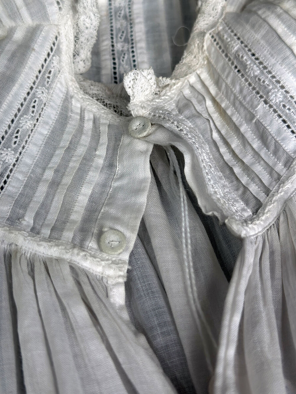 길이 약 96cm의 빈티지 베이비 드레스로, 섬세한 핀턱과 레이스 장식이 특징이며, 자연스러운 에이징이 느껴지는 순면 소재로 제작되었습니다.