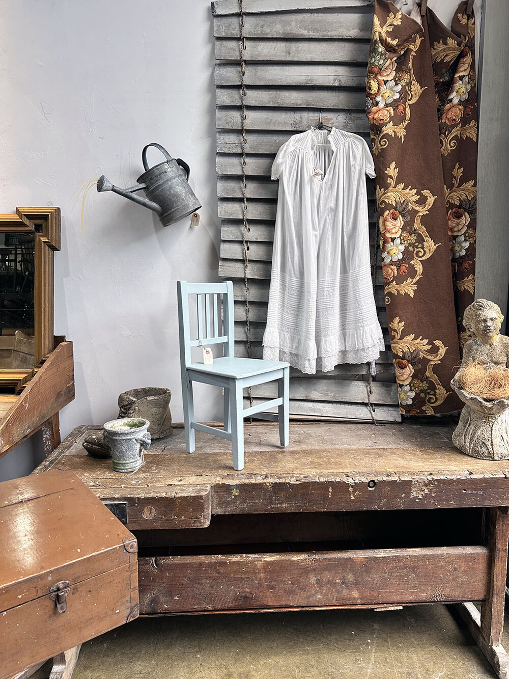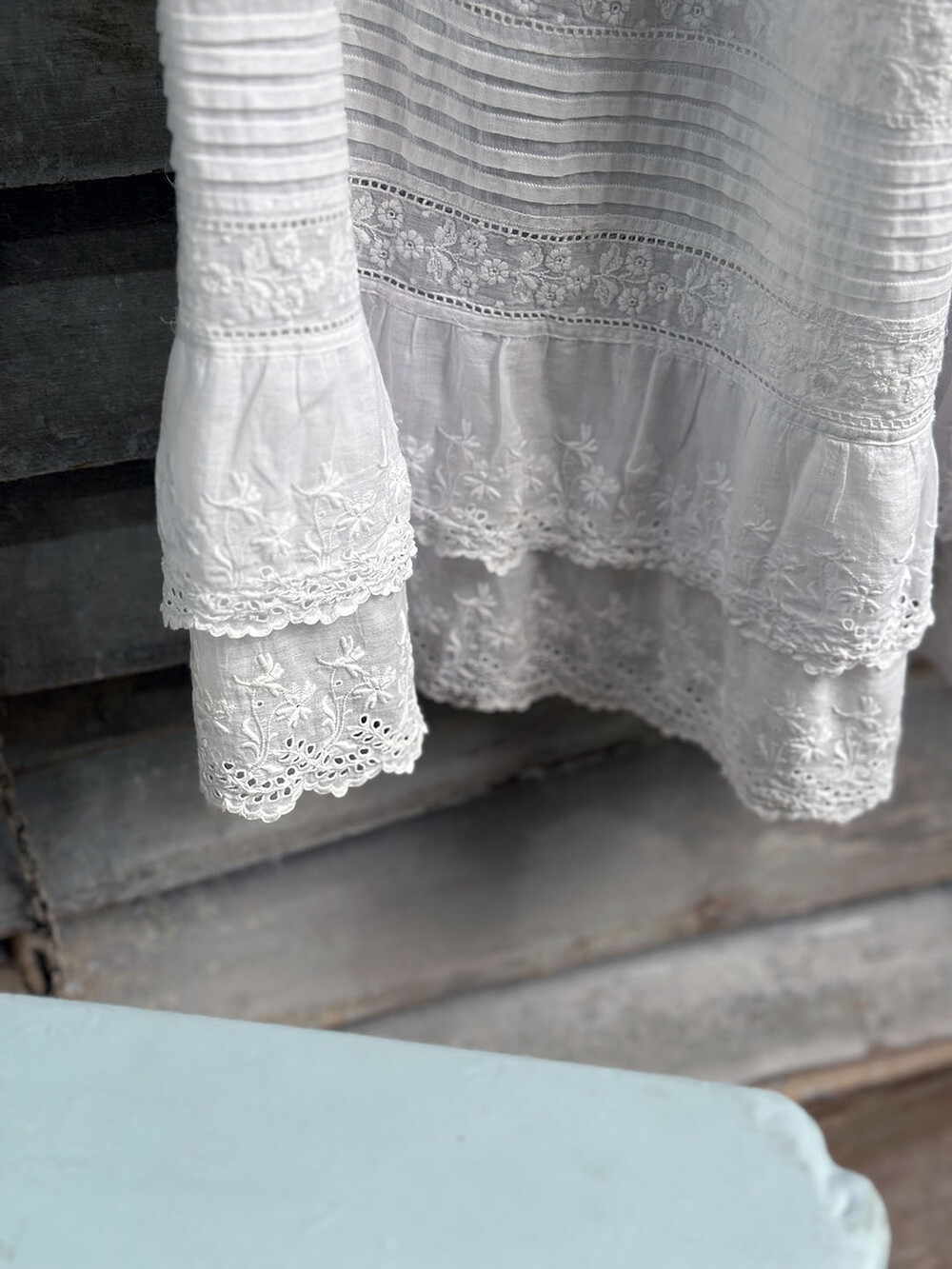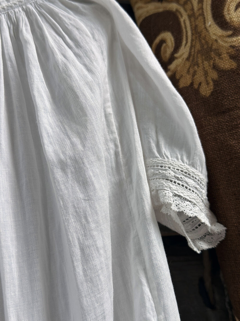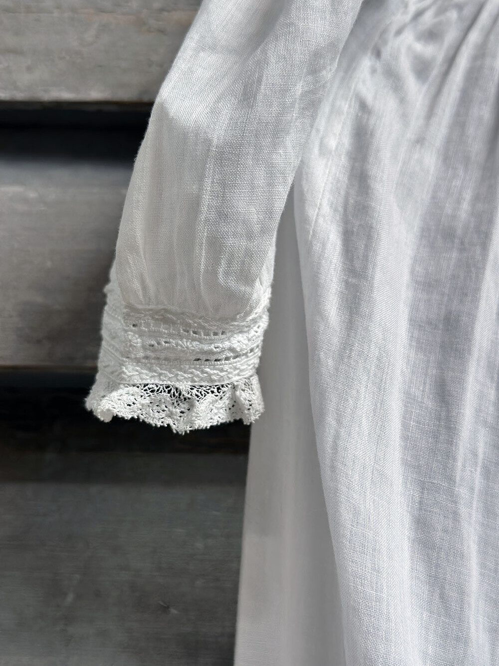길이 약 96cm의 빈티지 베이비 드레스로, 섬세한 핀턱과 레이스 장식이 특징이며, 자연스러운 에이징이 느껴지는 순면 소재로 제작되었습니다.