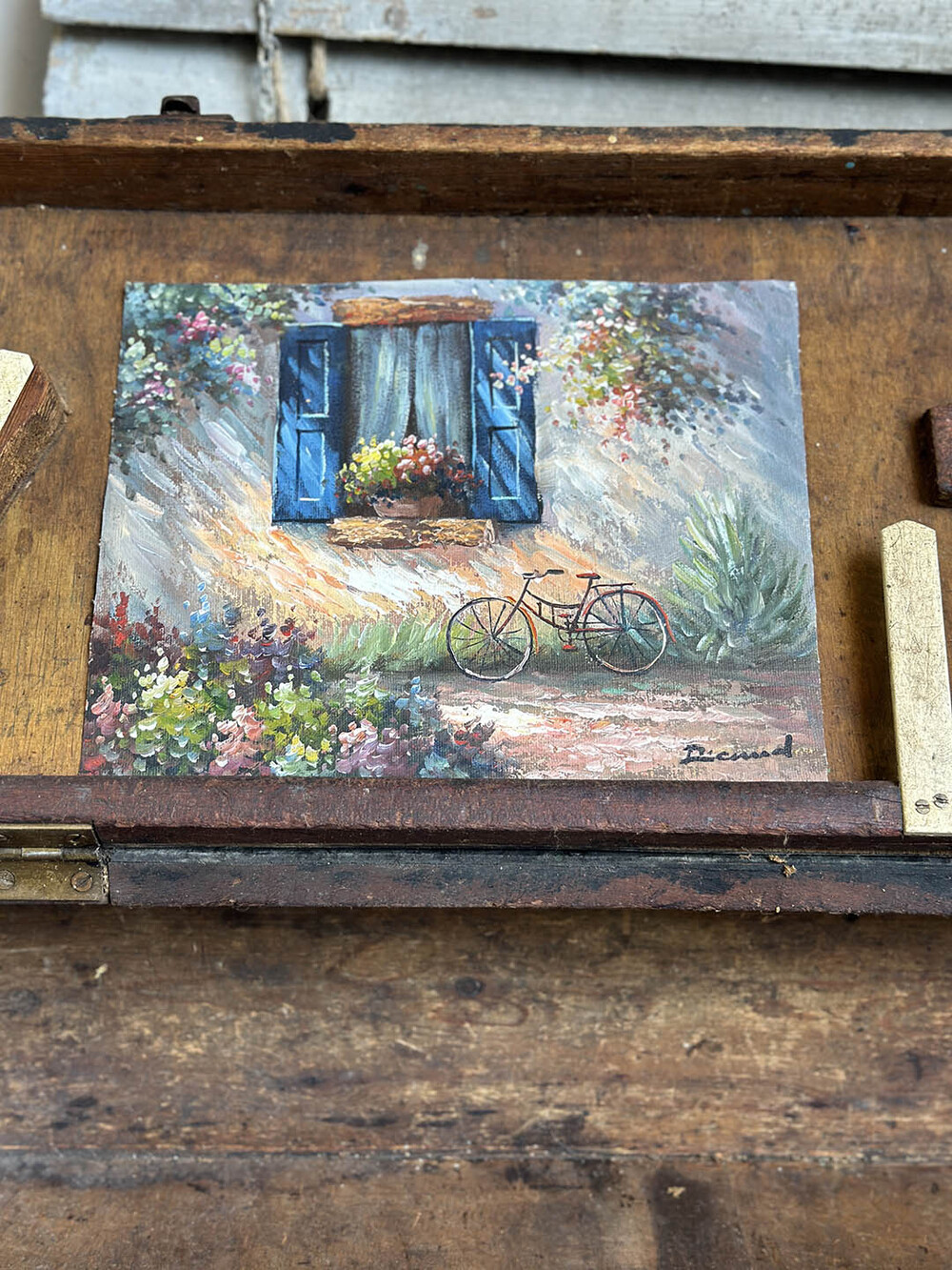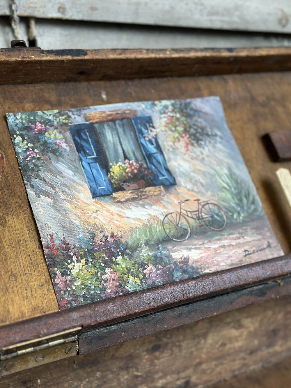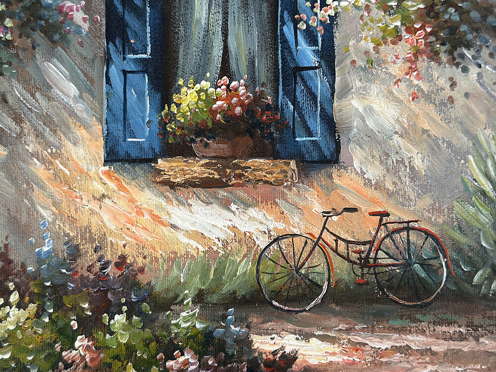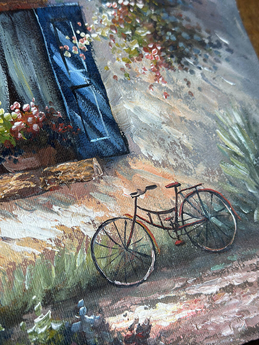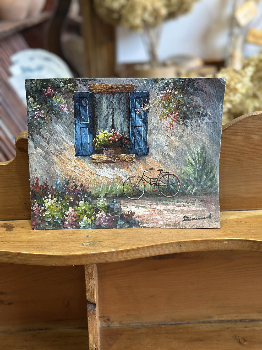 파란 셔터 창문 아래, 벽에 기대어 선 오래된 자전거. 따뜻한 햇살과 만개한 정원, 그리고 부드러운 붓 터치가 어우러진감각적인 오일 페인팅입니다. 강렬하면서도 자연스러운 색감이 특징이며,건물 외벽의 질감이나 식물의 표현에서 작가의 손맛이 잘 느껴지는 작품이에요. 유럽 남부의 어느 한적한 마을을 연상케 하는 풍경으로,공간에 생기를 더하고 싶은 분들께 추천드립니다. 캔버스 전체에 시간이 더해진 흔적이 남아 있어, 오리지널 빈티지 페인팅만의 멋을 한층 더 살려주는 그림입니다.