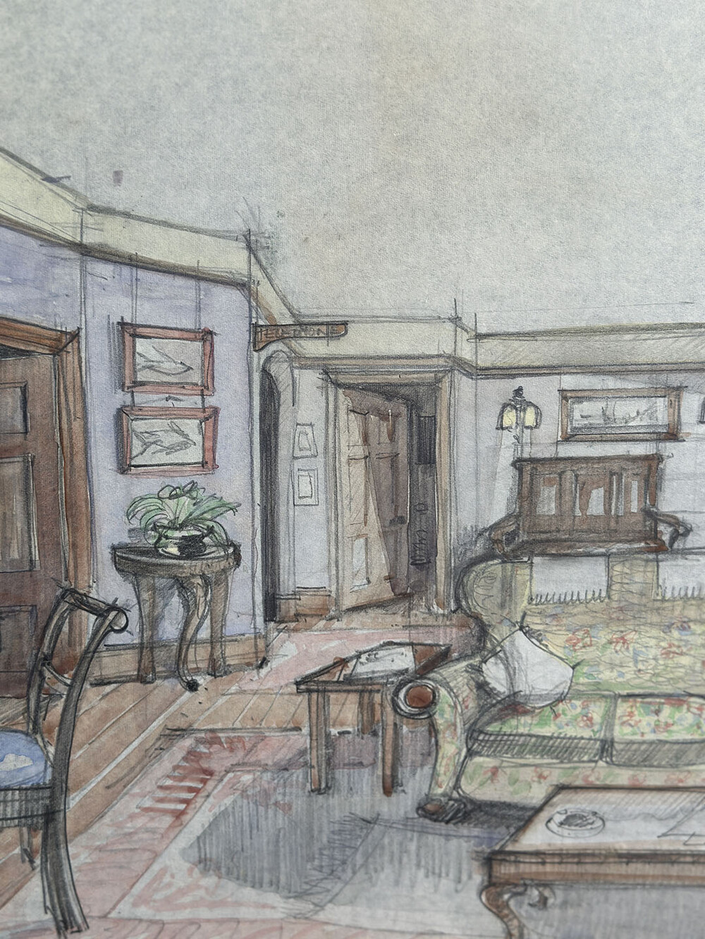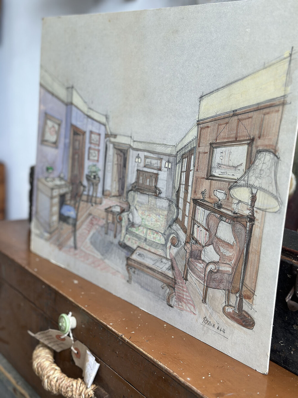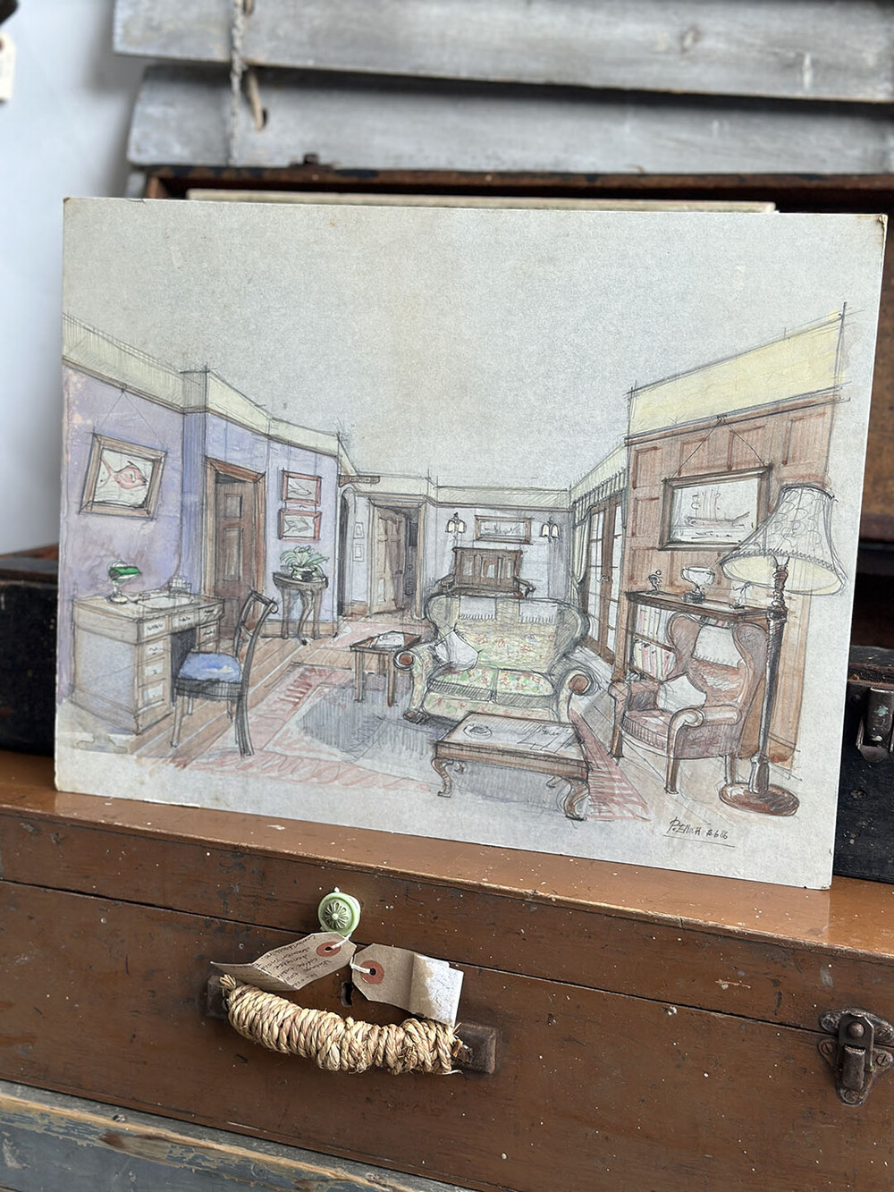 연필과 펜, 은은한 채색이 어우러진 드로잉은 원근과 공간감을 섬세하게 살려, 단순한 스케치를 넘어 인테리어 아카이브 자료 혹은 예술적 완성도가 높은 작품으로 감상할 수 있습니다. 종이에 남은 세월의 질감과 바랜 색조는 빈티지 작품으로서의 매력을 더욱 깊게 합니다.
