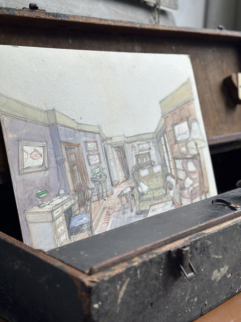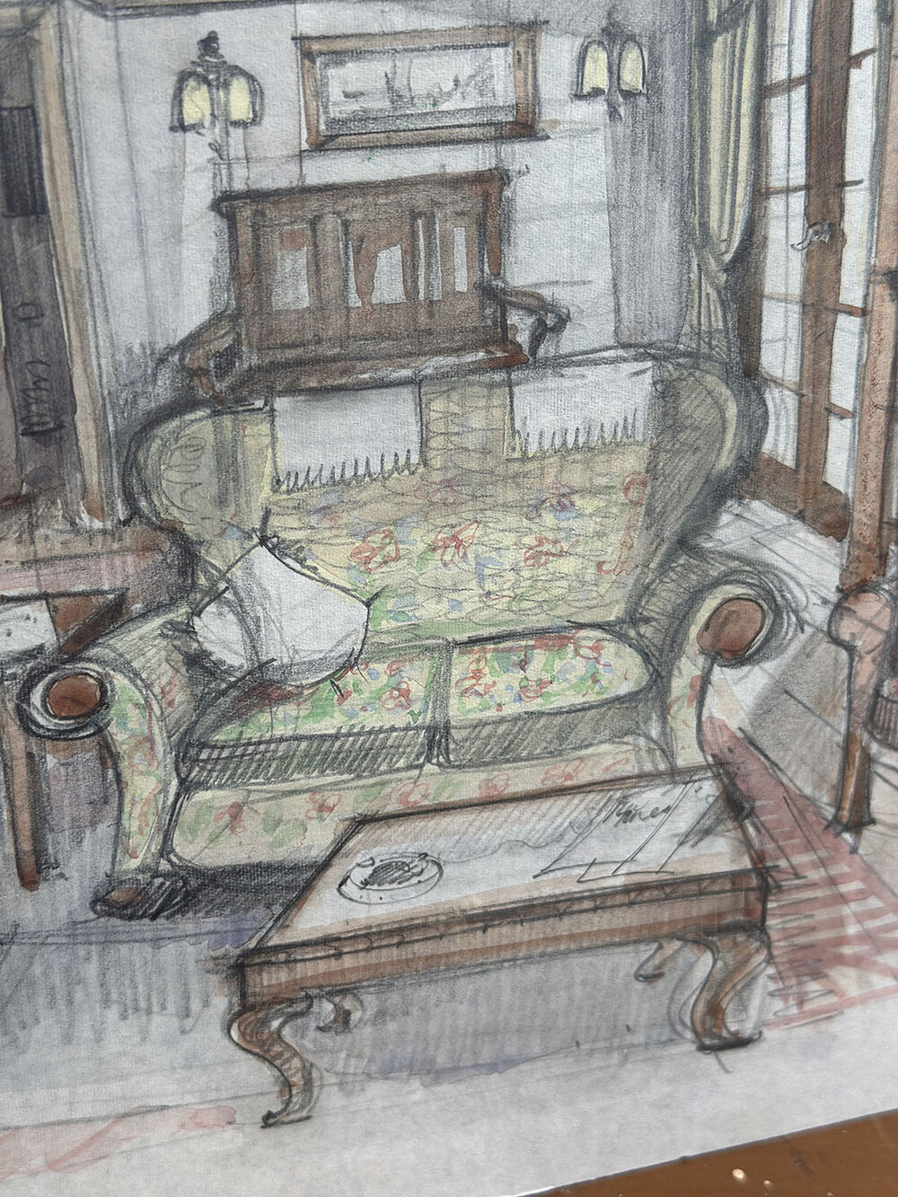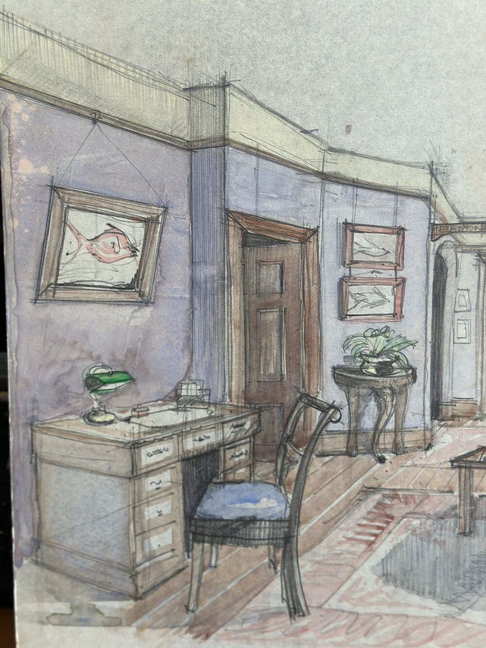 연필과 펜, 은은한 채색이 어우러진 드로잉은 원근과 공간감을 섬세하게 살려, 단순한 스케치를 넘어 인테리어 아카이브 자료 혹은 예술적 완성도가 높은 작품으로 감상할 수 있습니다. 종이에 남은 세월의 질감과 바랜 색조는 빈티지 작품으로서의 매력을 더욱 깊게 합니다.