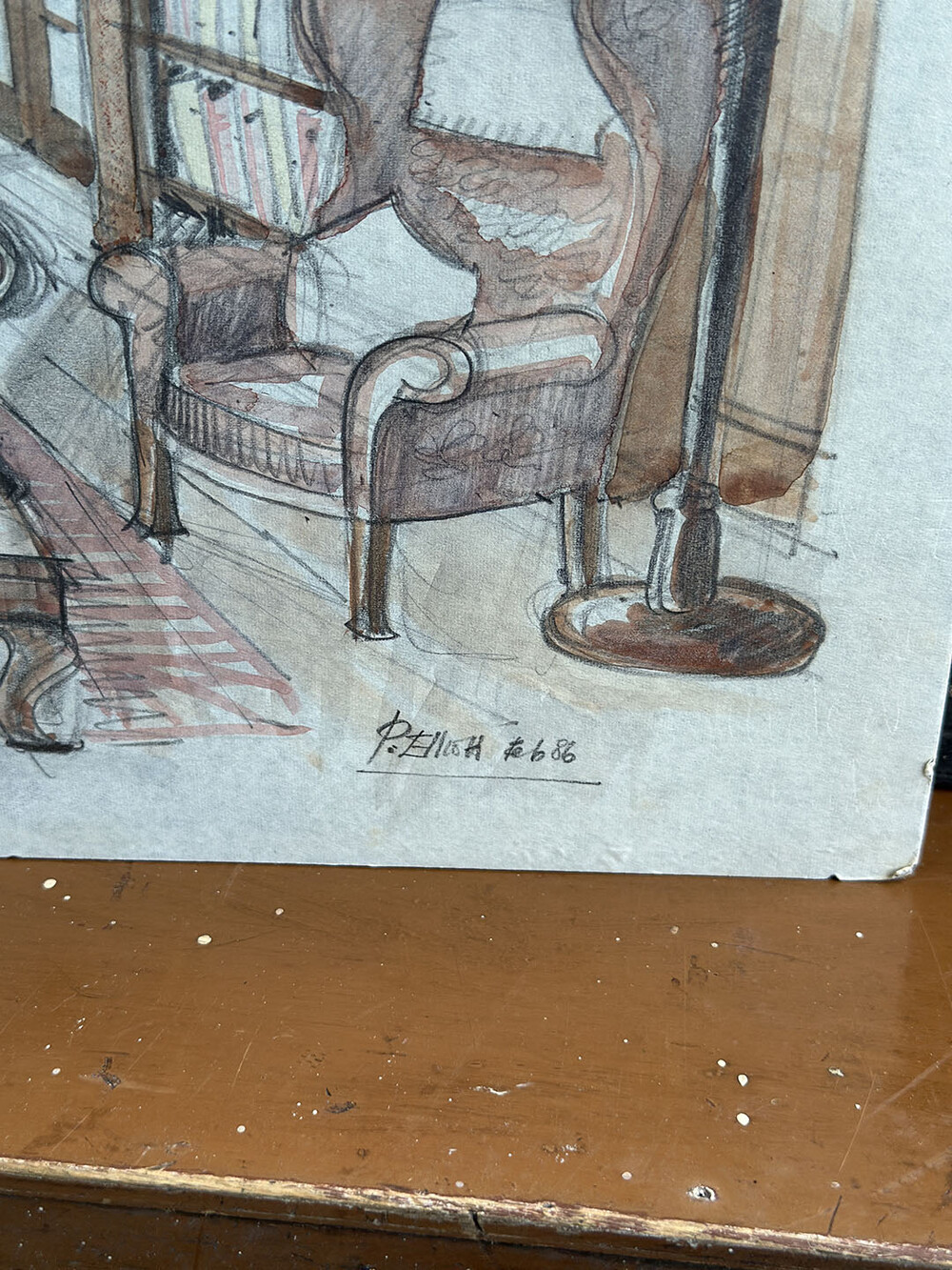1986년 2월에 완성된 빈티지 스케치 드로잉 작품으로, 작가의 서명이 하단에 남아 있어 작품의 진정성을 더해 줍니다. 당시의 공간을 세밀하게 기록하듯 표현한 이 드로잉은 책상, 소파, 암체어, 장식장, 스탠드 등 고풍스러운 가구와 소품들을 정밀하게 묘사하여, 20세기 후반 인테리어의 분위기를 그대로 담아내고 있습니다.