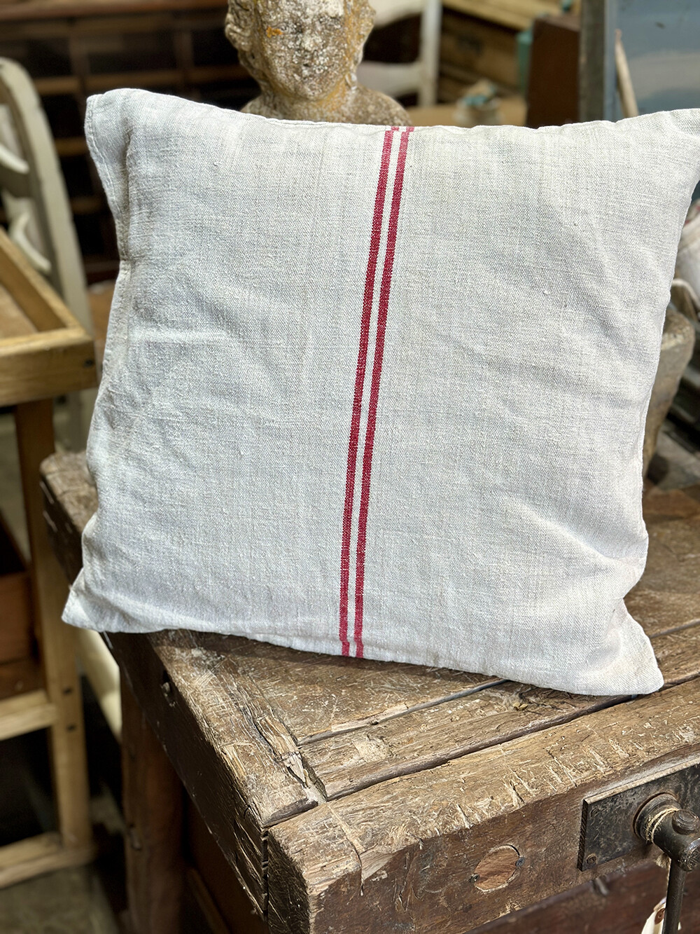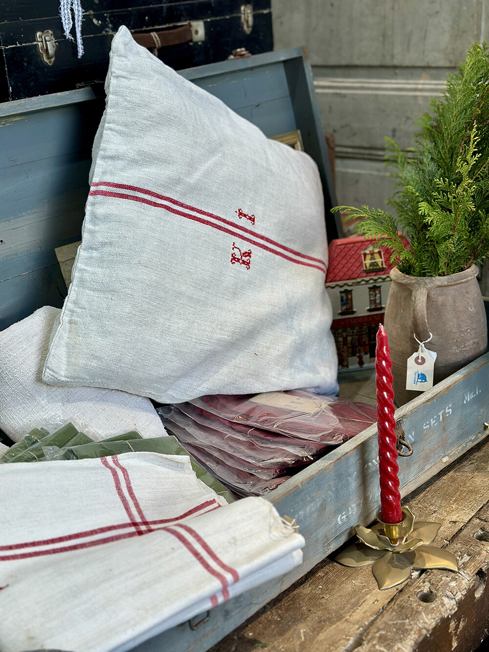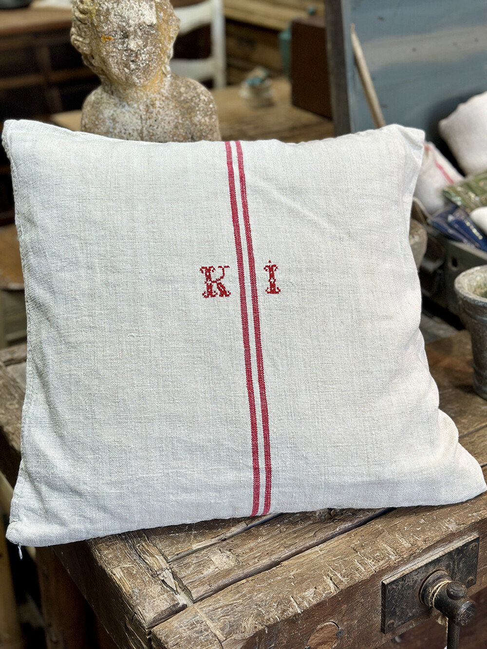 25a-088 올드 빈티지 헴프 쿠션 - 이니셜 & 레드라인