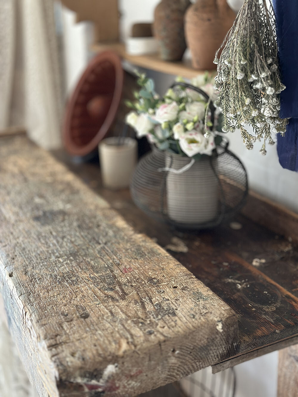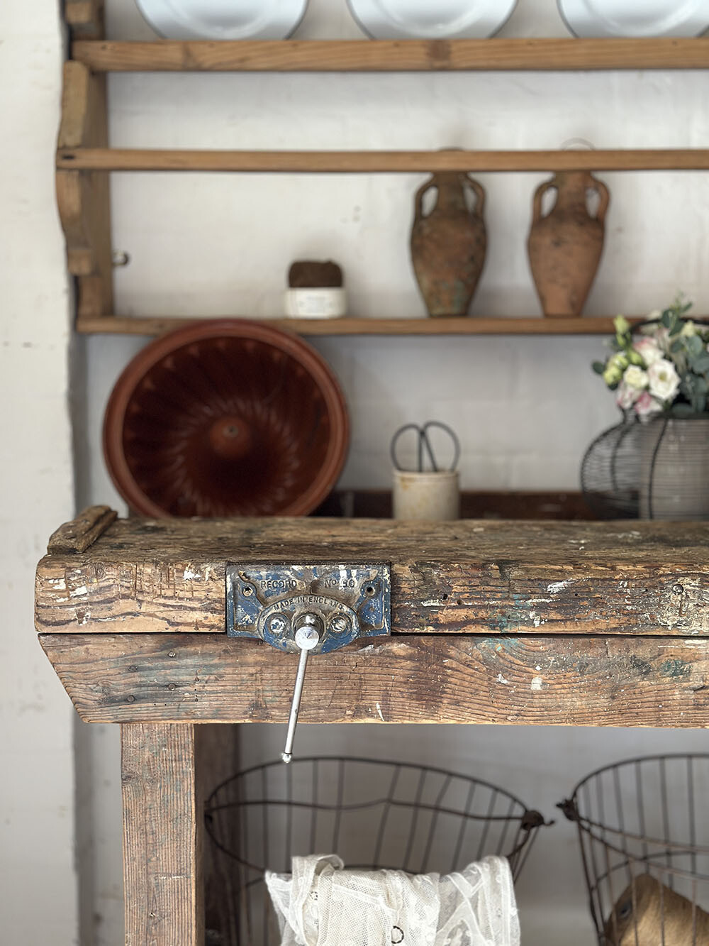 제작된 지 최소 60년 이상 지난 올드 빈티지 워크벤치예요. 두꺼운 원목 상판과 투박한 다리 구조에서 본래 작업용 가구였던 성격이 분명하게 드러나고, 오랜 사용으로 생긴 찍힘과 마모, 얼룩이 그대로 남아 있습니다. 인위적인 연출이 아닌, 실제 생활과 노동의 시간이 쌓여 만들어진 표정이죠.