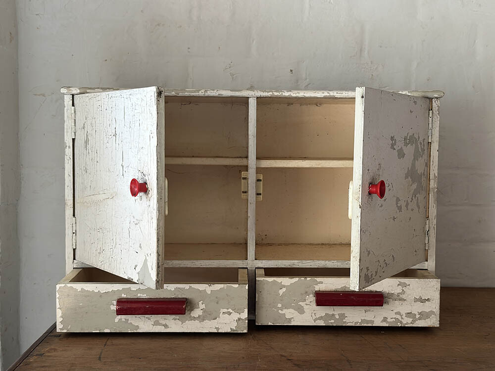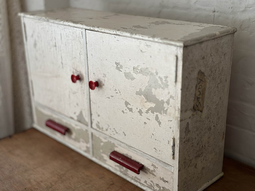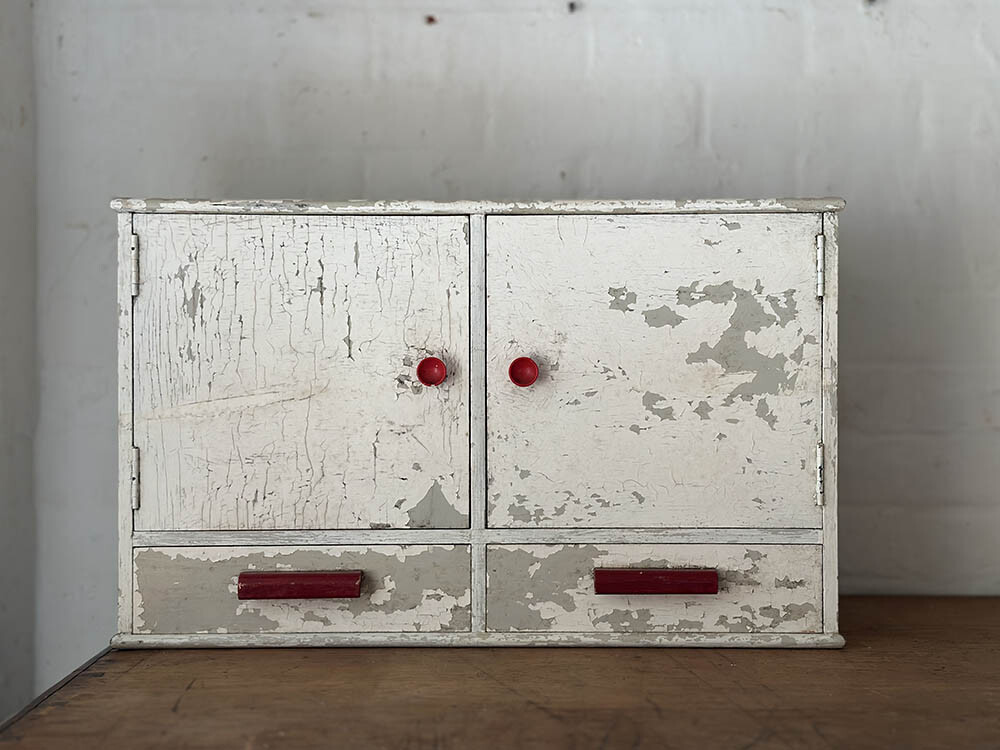 레트로 쉐비 시크 데스크탑 캐비넷입니다. 아담한 크기이지만 양문형 도어와 하단 서랍이 함께 구성되어 있어 작은 소품과 문구류, 액세서리 등을 구분해 수납하기에 실용적인 구조를 갖추고 있습니다. 붉은 손잡이와 대비되는 아이보리 톤이 경쾌한 인상을 남기죠.