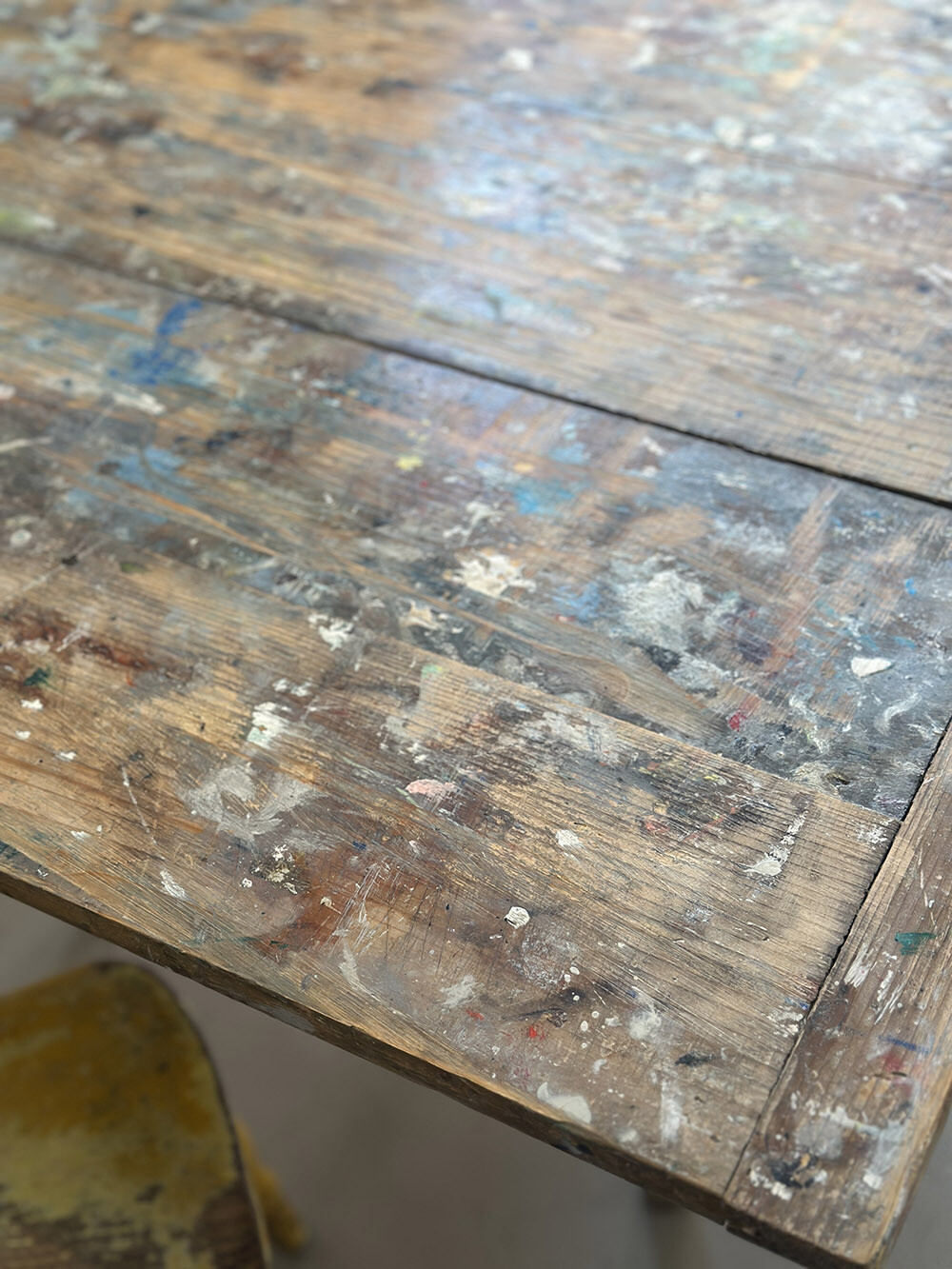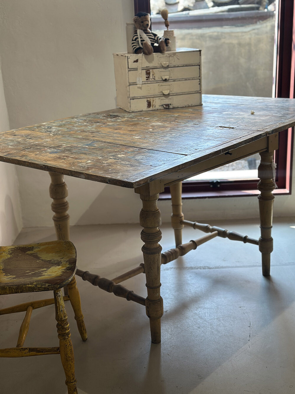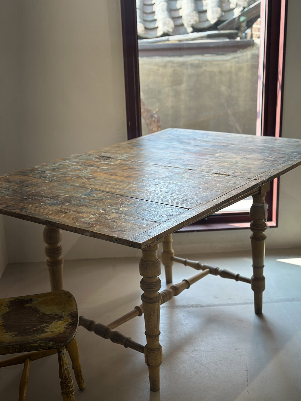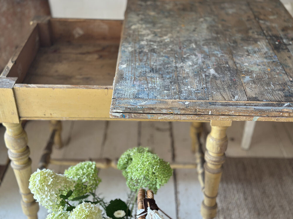런던의 한 화가가 오랜 시간 사용했던 테이블입니다. 독특하게도 상판을 접이식으로 제작한 점이 눈에 띄는데, 작업을 위해 특별히 제작된 가구라고 합니다. 소나무 원목으로 제작된 상판에는 유화 작업의 흔적들과 함께 세월에 의해 생겨난 파티나가 고스란히 남아 있어, 시간의 미감을 잘 보여줍니다.