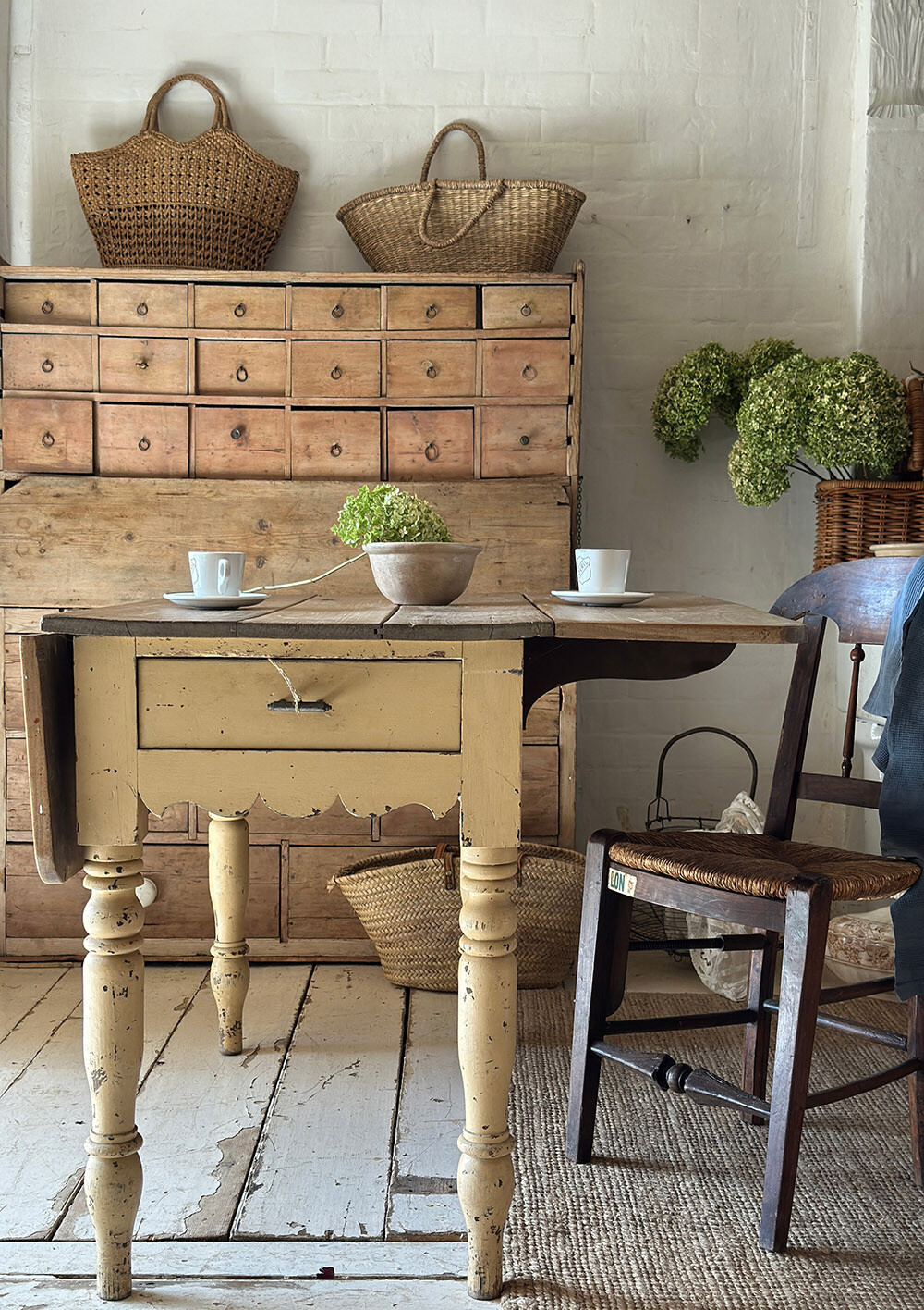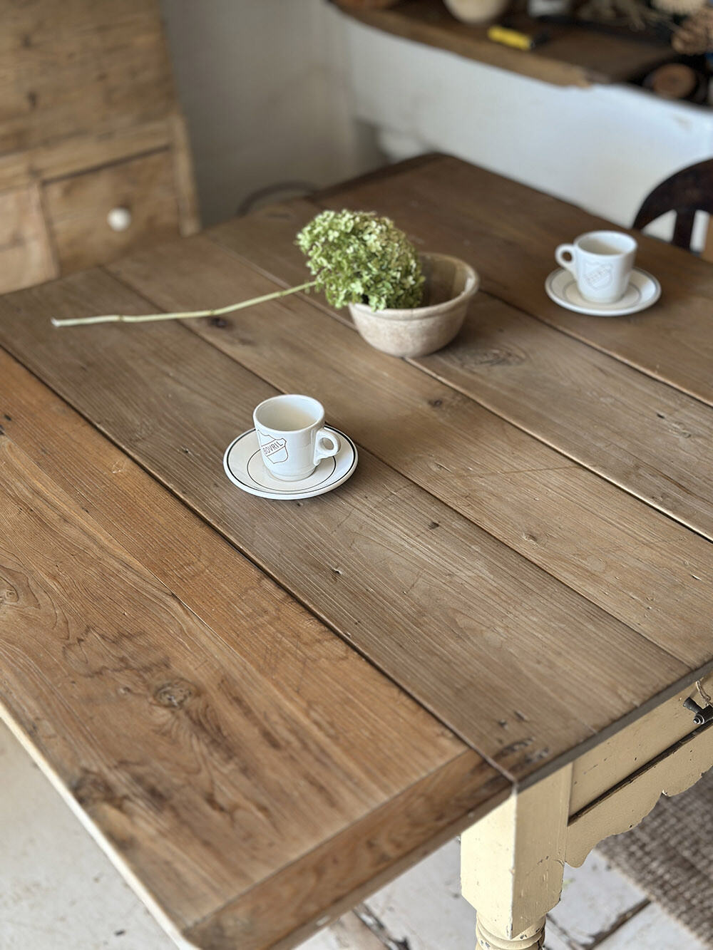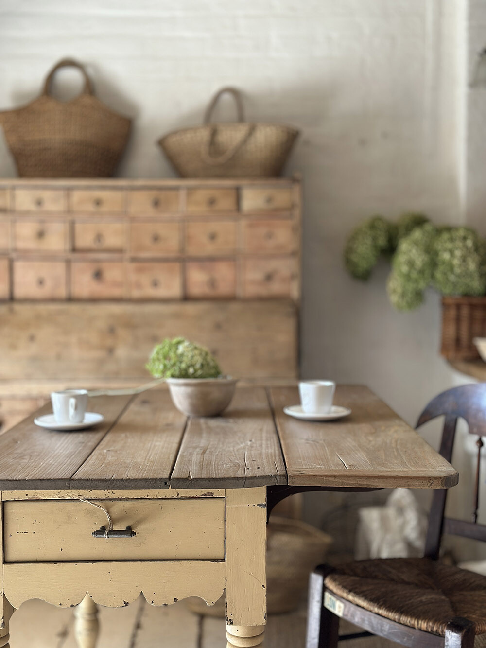 상판을 접었다 펼 수 있는 드랍리프 구조로 만들어진 빈티지 테이블입니다. 전체적으로는 따뜻한 파인 상판과 대비되는 옐로우 컬러의 쉐비 시크 페인팅이 하부에 남아 있어, 컨트리 가구 특유의 소박한 분위기와 세월의 표정을 함께 보여주는 피스예요. 특히 다리 부분의 페인트는 오랜 사용 속에서 자연스럽게 벗겨지고 마모되며 만들어진 질감이어서 인위적인 쉐비 마감과는 다른 깊이를 느낄 수 있습니다.