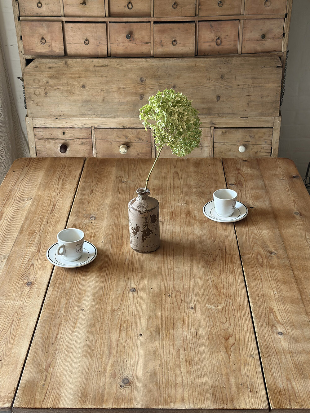 상판은 넓은 파인 보드로 구성되어 있어 펼쳤을 때에는 여유 있는 테이블로 사용할 수 있고, 필요에 따라 한쪽 또는 양쪽을 접어 공간을 효율적으로 활용할 수 있습니다. 식탁, 작업 테이블, 혹은 창가의 다용도 테이블로 두어도 자연스럽게 어울리는 구조이며, 파인 목재 특유의 결과 사용 흔적이 시간이 만든 분위기를 잘 전해주는 테이블입니다.