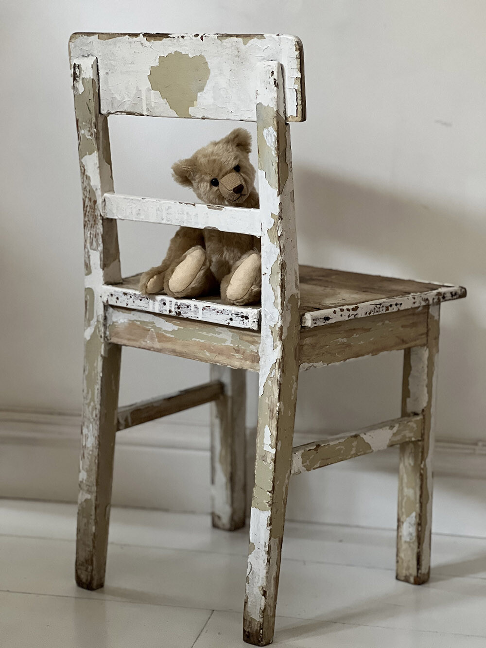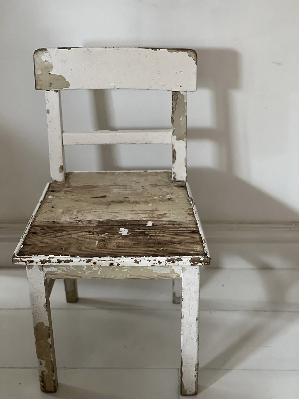 빈티지 쉐비 시크 키즈 체어로, 아이를 위한 소형 사이즈로 제작된 고전적인 바 백(back) 구조의 체어입니다. 직선적인 프레임과 단정한 등받이 구성은 단순하지만 안정적인 형태를 만들어주며, 전체적으로 입혀졌던 화이트 페인트가 오랜 시간 사용되며 자연스럽게 벗겨지고 겹겹이 드러난 하부 컬러와 목재의 결이 깊은 표정을 만들어내고 있죠.