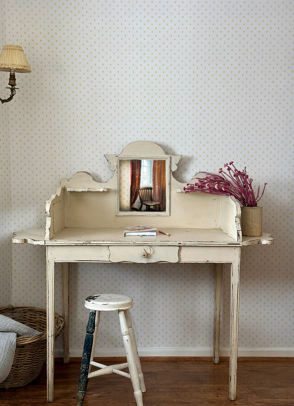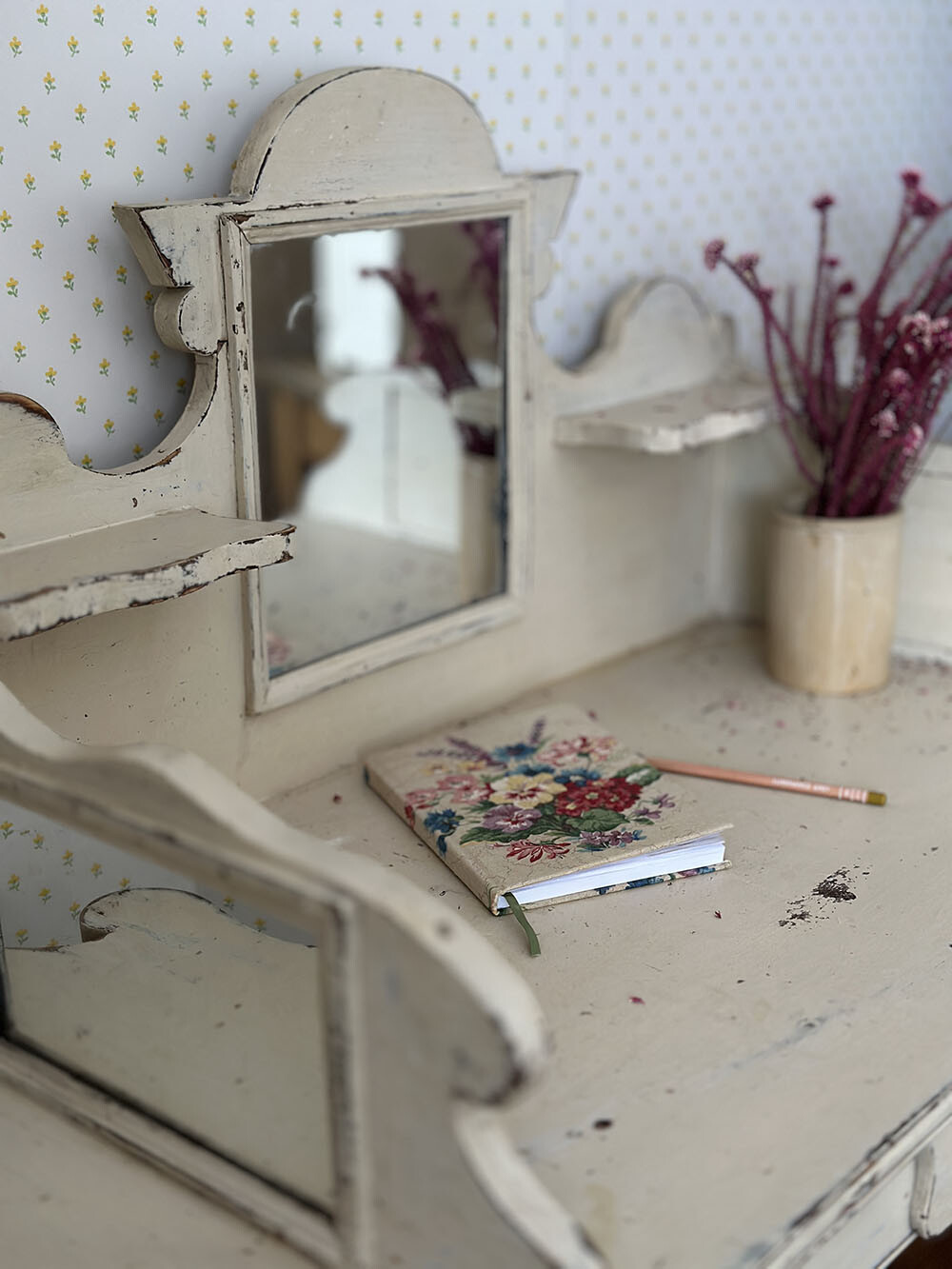 프랑스 가구 특유의 부드러운 커브 엣지가 전체 실루엣을 이끄는 드레싱 테이블입니다. 얇은 판재로 짜여 가볍고 날렵한 인상이 먼저 느껴지고, 과한 장식 없이도 프렌치 가구 특유의 섬세함이 잘 드러나죠.