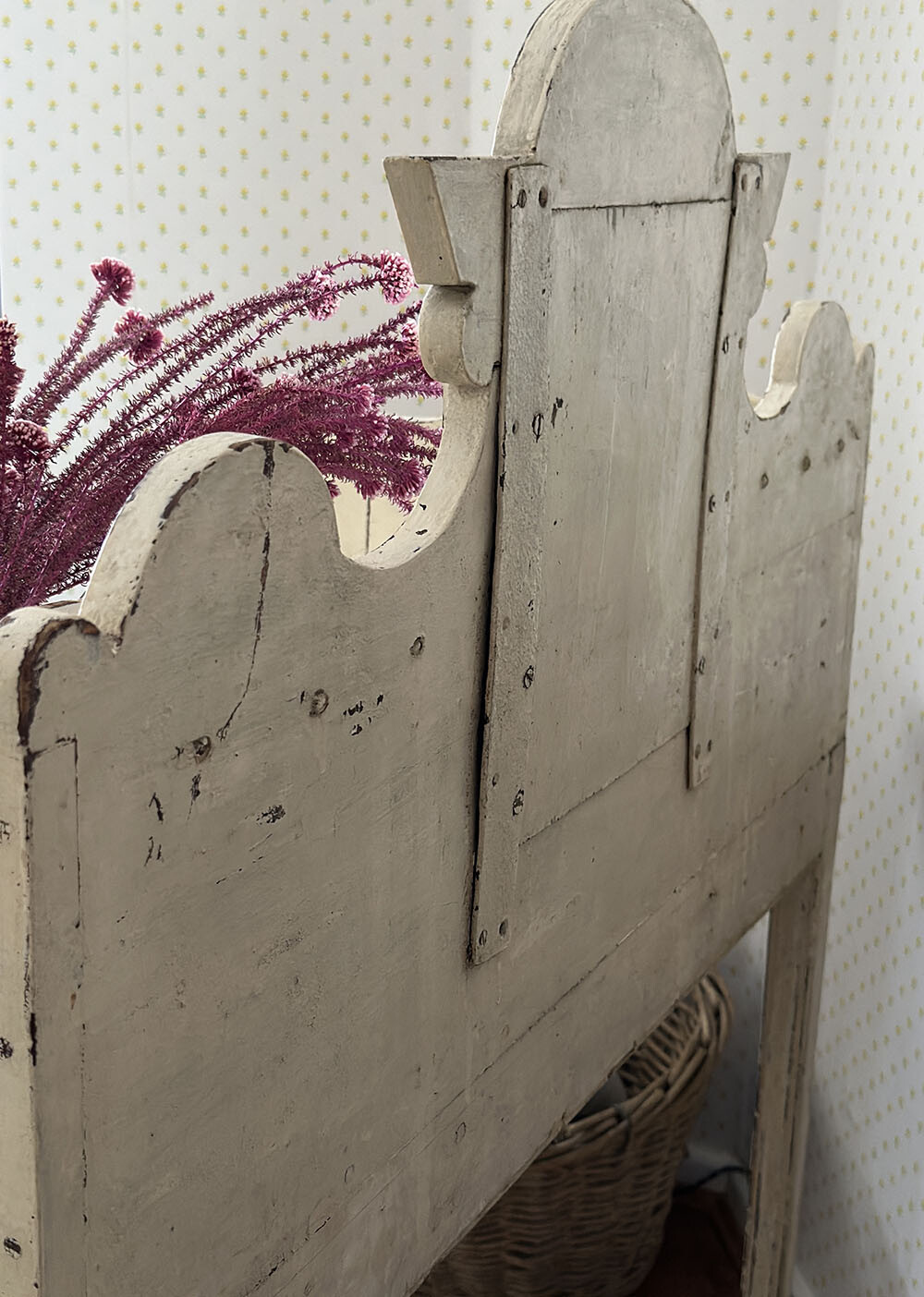 상판 아래에는 서랍이 하나 달려 있어 소소한 물건을 정리하기에 충분하고, 다리는 곧게 뻗은 테이퍼드 레그로 마감되어 공간을 답답하게 만들지 않습니다. 쉐비 시크 페인팅 위로 드러나는 사용 흔적도 과하지 않게 남아 있어, 세월의 흐름이 자연스럽게 읽히는 프렌치 올드 빈티지 드레싱 테이블이에요.