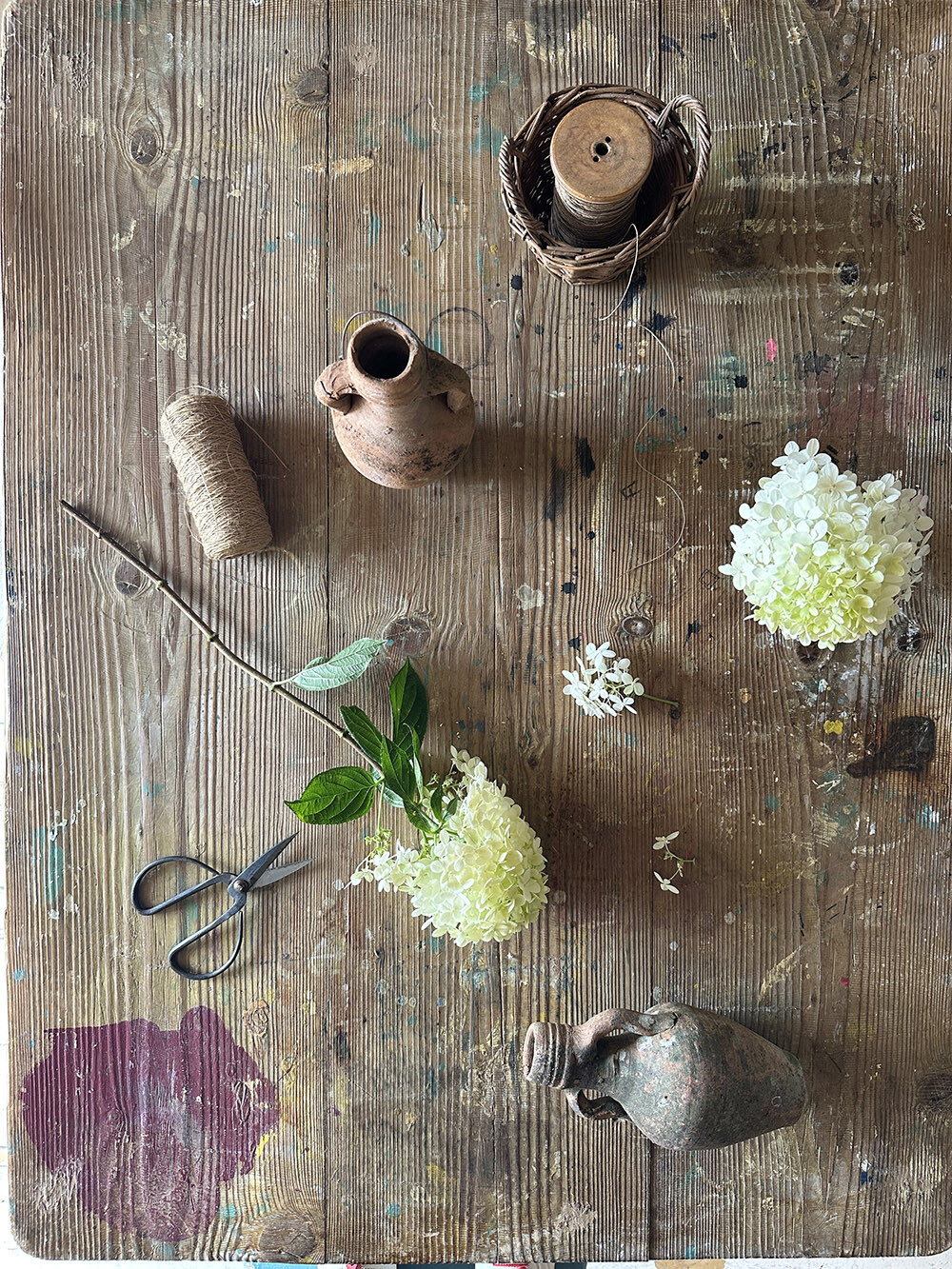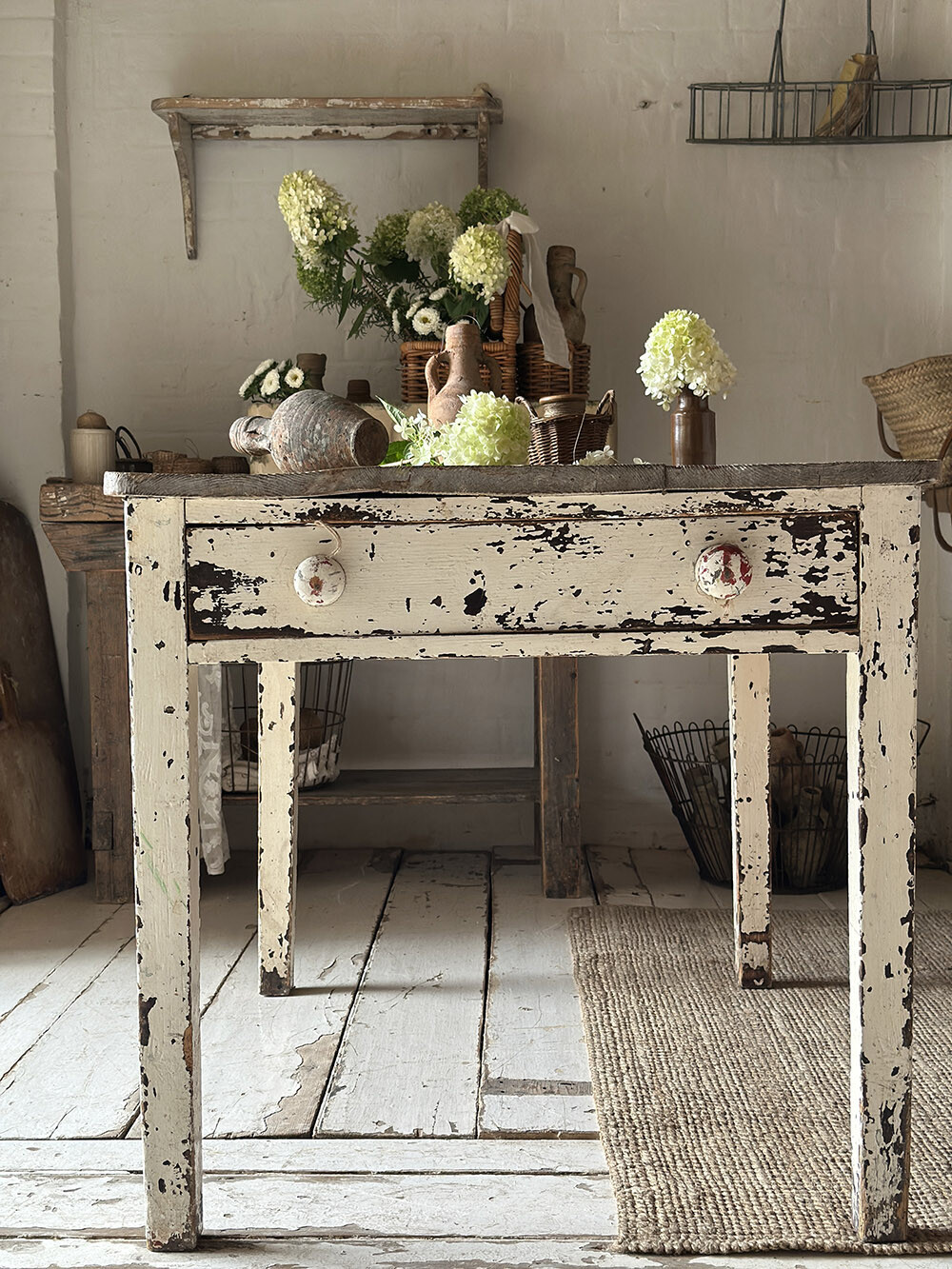 직선적인 상판과 대비되는 테이퍼드 레그가 테이블의 인상을 과하게 무겁지 않게 잡아주고, 오래 사용되며 쌓인 페인트의 마모와 나뭇결, 스크래치가 표면 곳곳에 고스란히 남아 있습니다. 장식적인 연출보다는 실제 생활 속에서 사용되며 만들어진 흔적들이 중심이 되는 모습입니다.