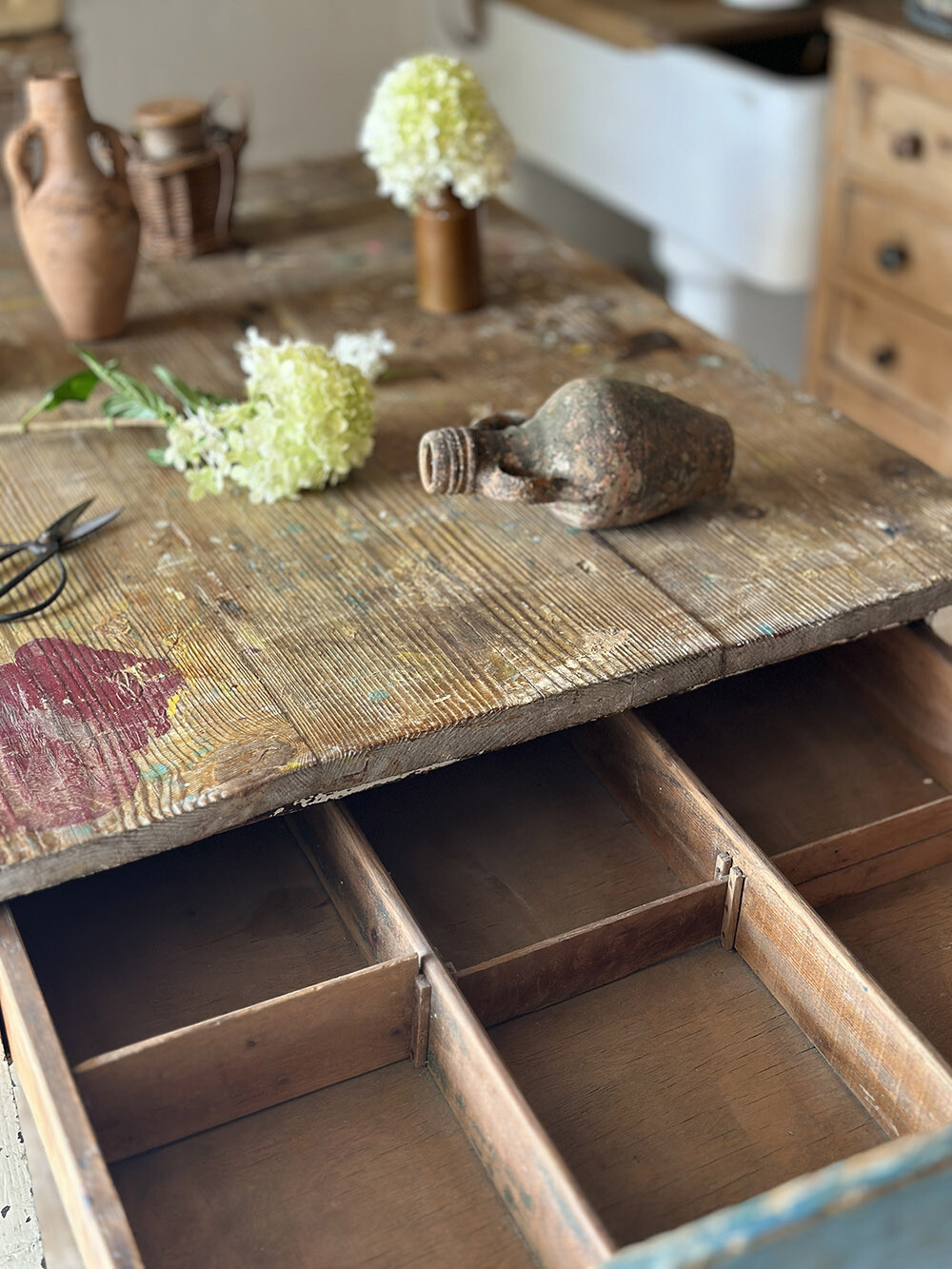 피전홀 파티션이 포함된 올드 빈티지 파인 테이블입니다. 상판 아래에 여러 칸으로 나뉜 수납 구조가 자리하고 있어, 일반적인 테이블에 비해 서랍부가 비교적 두껍게 형성되어 있습니다. 이 구조로 인해 전체 테이블 높이도 자연스럽게 조금 높게 설계된 것으로 보이며, 단순한 다이닝 테이블이라기보다는 작업과 정리를 함께 고려한 가구였음을 짐작하게 합니다.