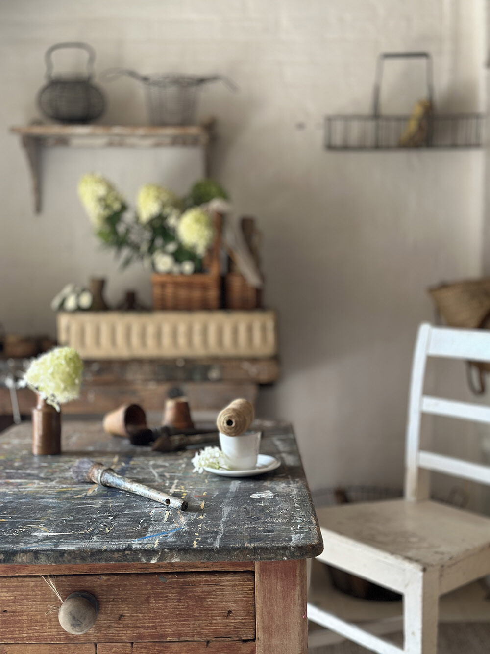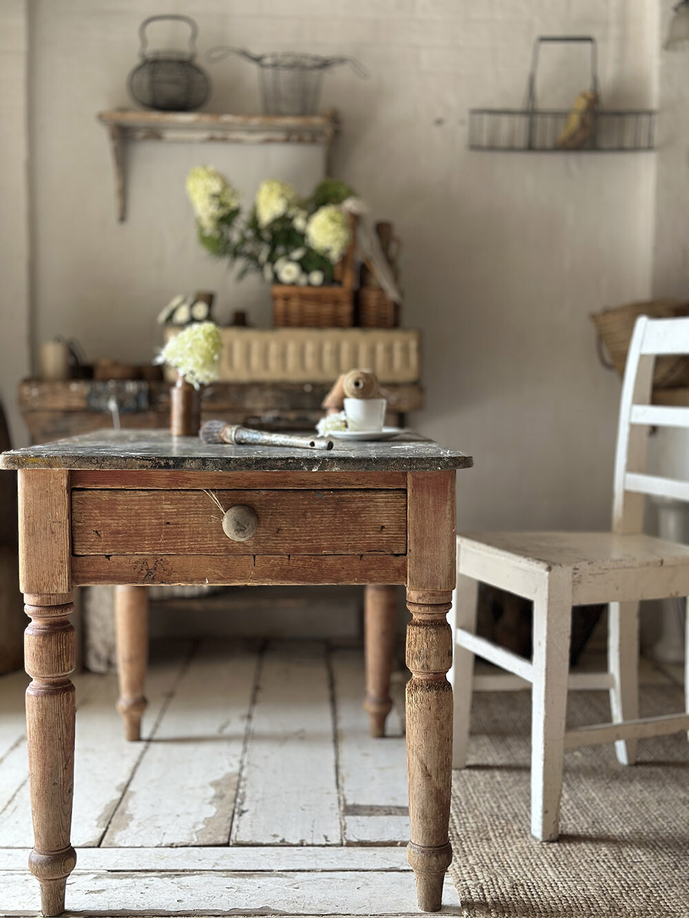 구조를 보면 빅토리안 시대의 턴드 레그를 갖춘 잉글리쉬 컨트리 퍼니쳐의 전형적인 형태 위에, 작업용 도구들을 수납하기 위해 두텁게 제작된 서랍이 더해져 있습니다. 실제 작업의 밀도가 축적된 상태 그대로 남아 있는 피스이기 때문에, 단순한 테이블 이상의 존재감을 갖고 공간 안에서 하나의 장면을 만들어내죠. 작업대나 디스플레이 테이블로 활용했을 때 그 성격이 더욱 분명하게 드러납니다.