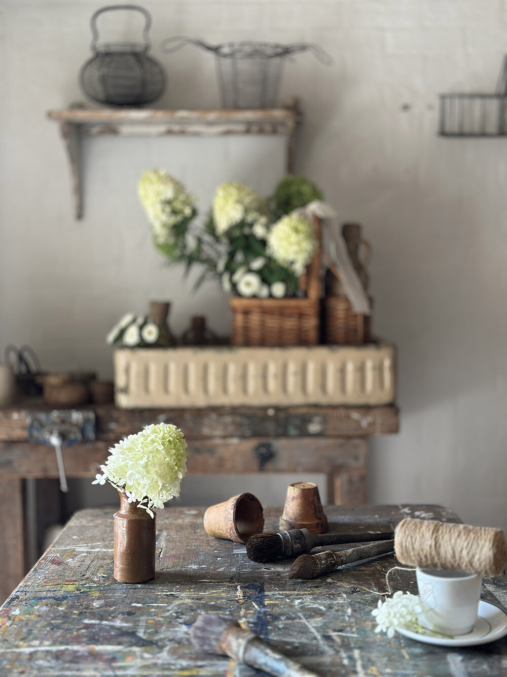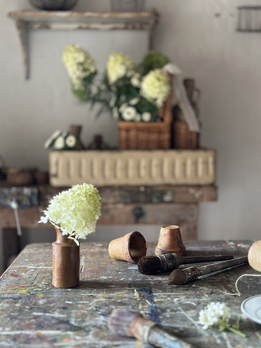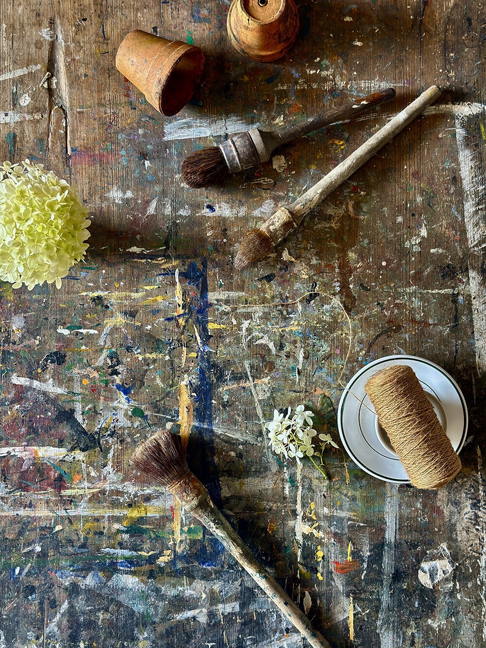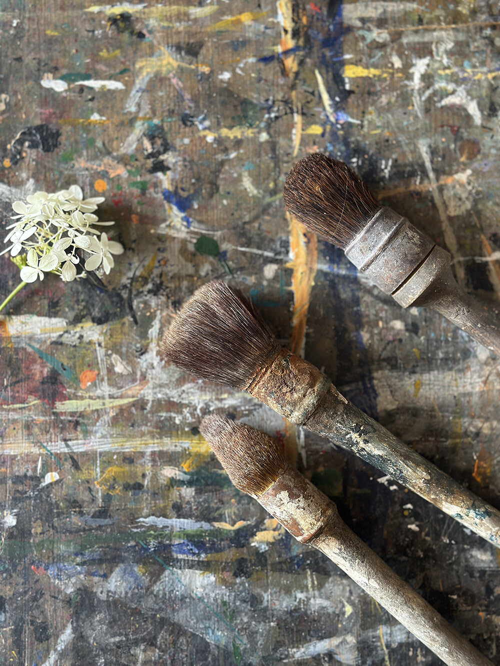 빈티지 파인 아티스트 테이블로, 화가나 공예가들이 실제 작업에 사용하던 워크 테이블입니다. 표면 전체에 남아 있는 물감 자국과 스크래치, 반복된 사용으로 생긴 마모는 단순한 흔적을 넘어 하나의 기록처럼 읽히는 요소들이죠. 이러한 작업용 가구들은 테이블뿐 아니라 워크 벤치, 스툴, 도구까지 하나의 카테고리를 형성할 만큼 고유한 영역을 가지고 있으며, 인위적으로는 만들어낼 수 없는 독특한 파티나가 가장 큰 매력입니다.