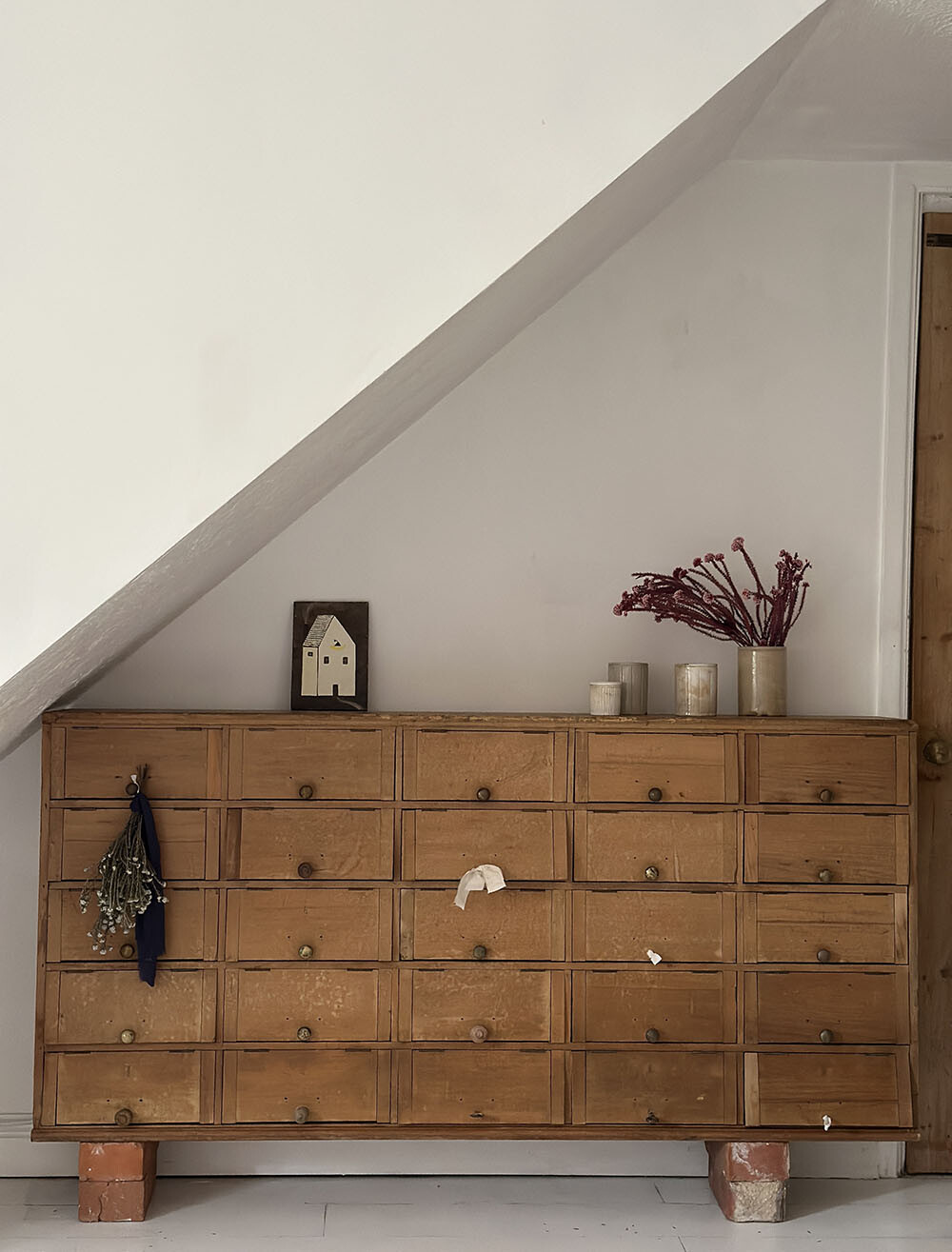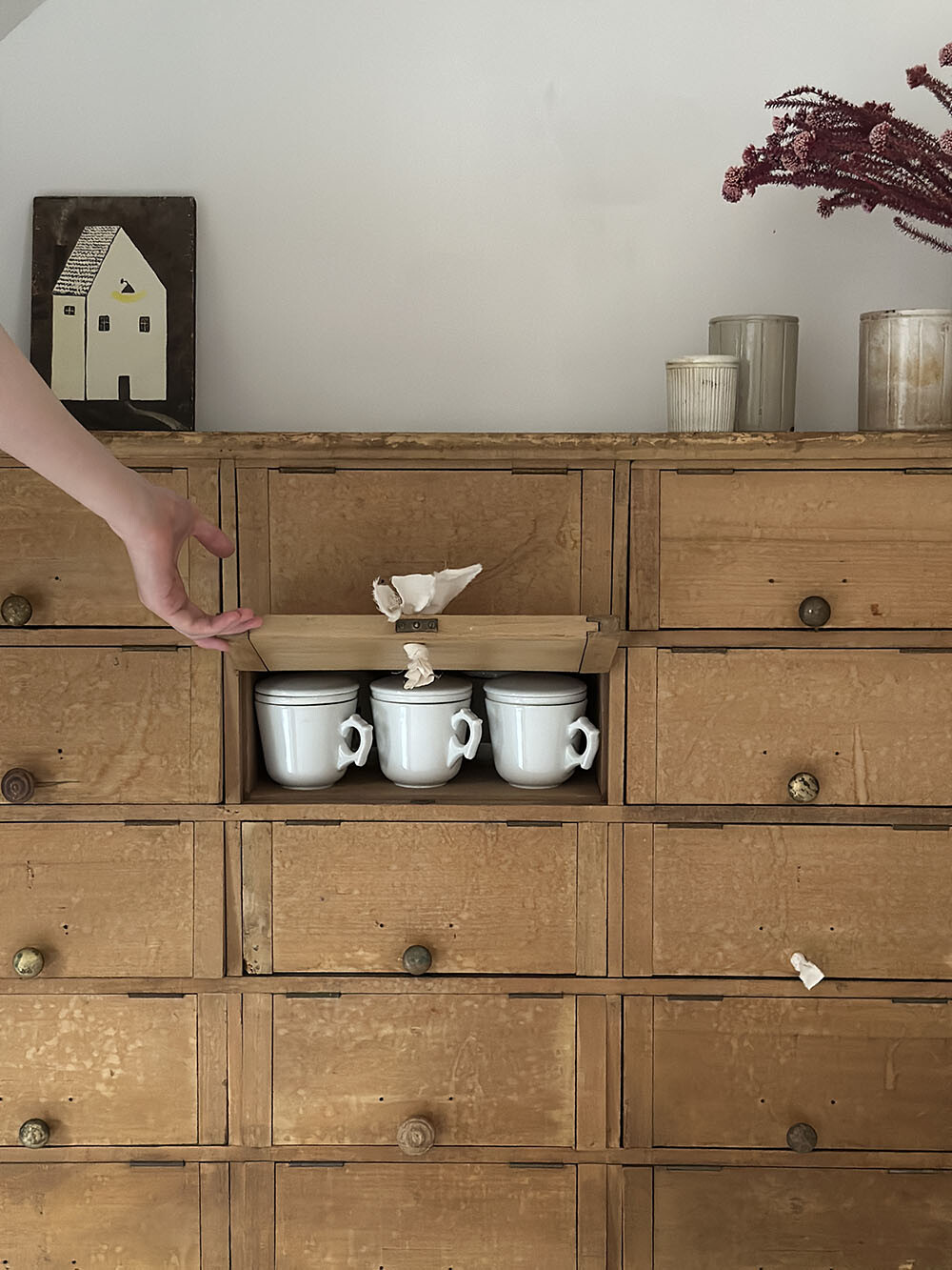 영국에서 제작된 올드 빈티지 파인 캐비넷입니다. 전면을 가득 채운 수납부가 인상적인데, 각각의 수납함이 서랍이 아닌 리프트업 도어 구조로 되어 있는 점이 이 가구의 가장 큰 특징입니다. 도어를 위로 들어 올리면 내부가 한눈에 드러나고, 닫았을 때는 정돈된 면 분할이 유지되는 구조예요.