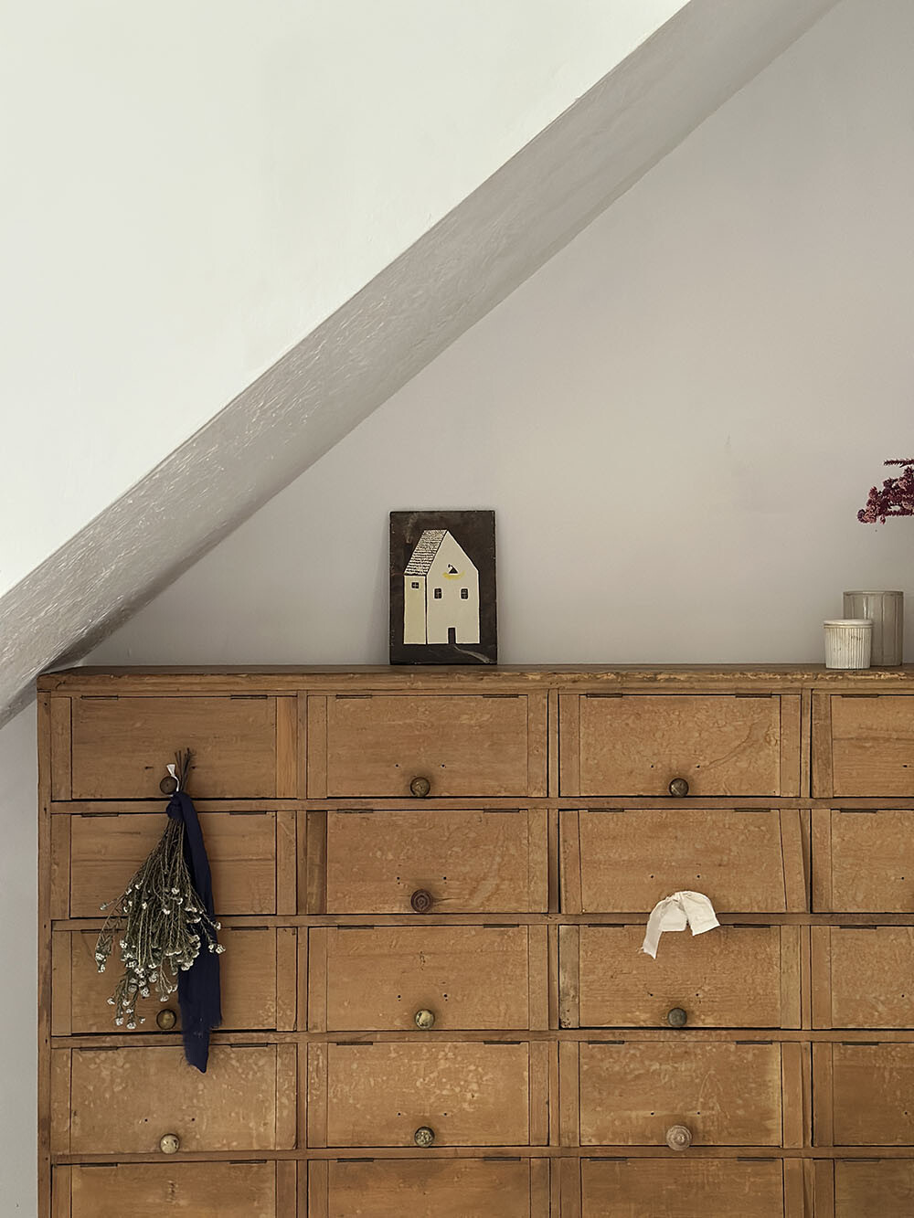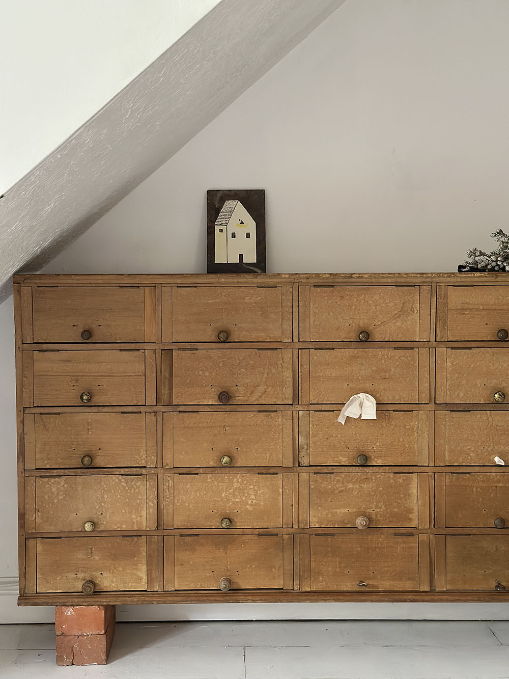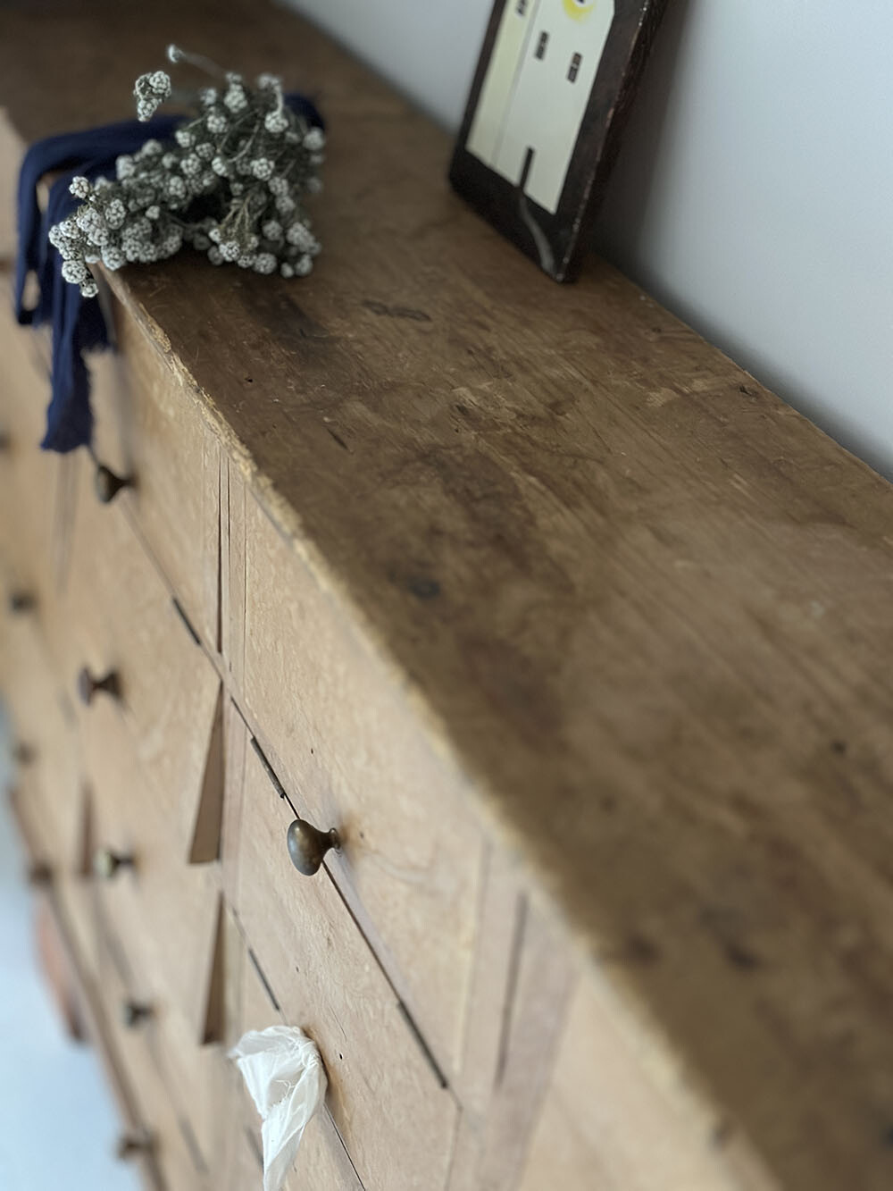 파인 원목 특유의 결이 고르게 드러나 있으며, 오랜 사용으로 생긴 마모와 톤의 변화가 자연스럽게 남아 있습니다. 손잡이와 힌지 역시 단순한 금속 파츠를 사용해, 기능 위주의 가구였음을 보여주죠. 실용을 위해 만들어졌지만, 그 결과물이 오히려 절제된 미감을 만들어냅니다.