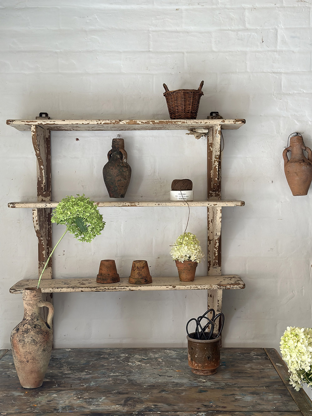 사진에서는 비교적 아담해 보이지만 실제 크기는 너비가 80, 높이도 87cm로 존재감이 있는 편입니다. 세 개의 선반으로 구성되어 있어 작은 오브제나 테이블웨어, 화병 등을 여유 있게 디스플레이할 수 있으며, 벽에 고정할 때 사용하는 브래킷 또한 당시의 오리지널 하드웨어 파츠가 그대로 남아 있습니다. 주방이나 다이닝 공간, 혹은 컨트리 스타일의 벽면에서 분위기를 만들어 주는 장식 선반으로 잘 어울리는 아이템입니다.