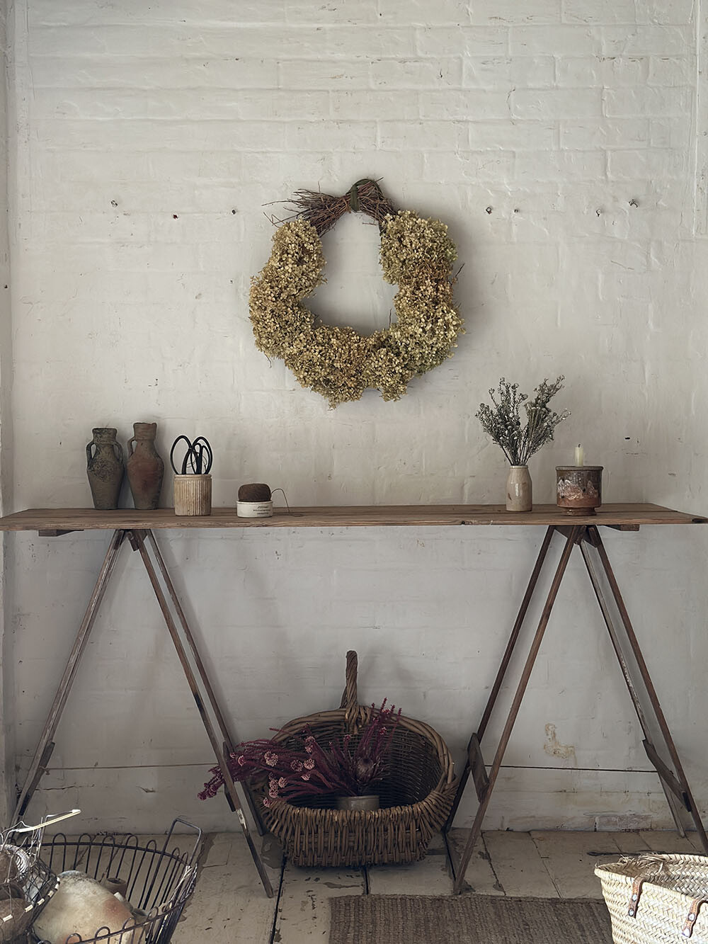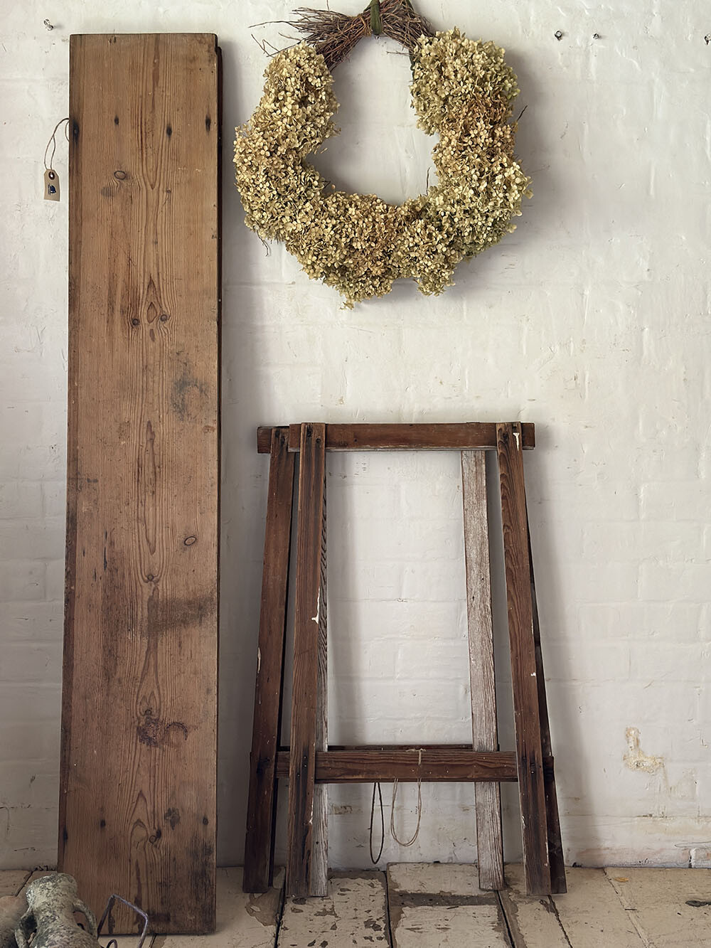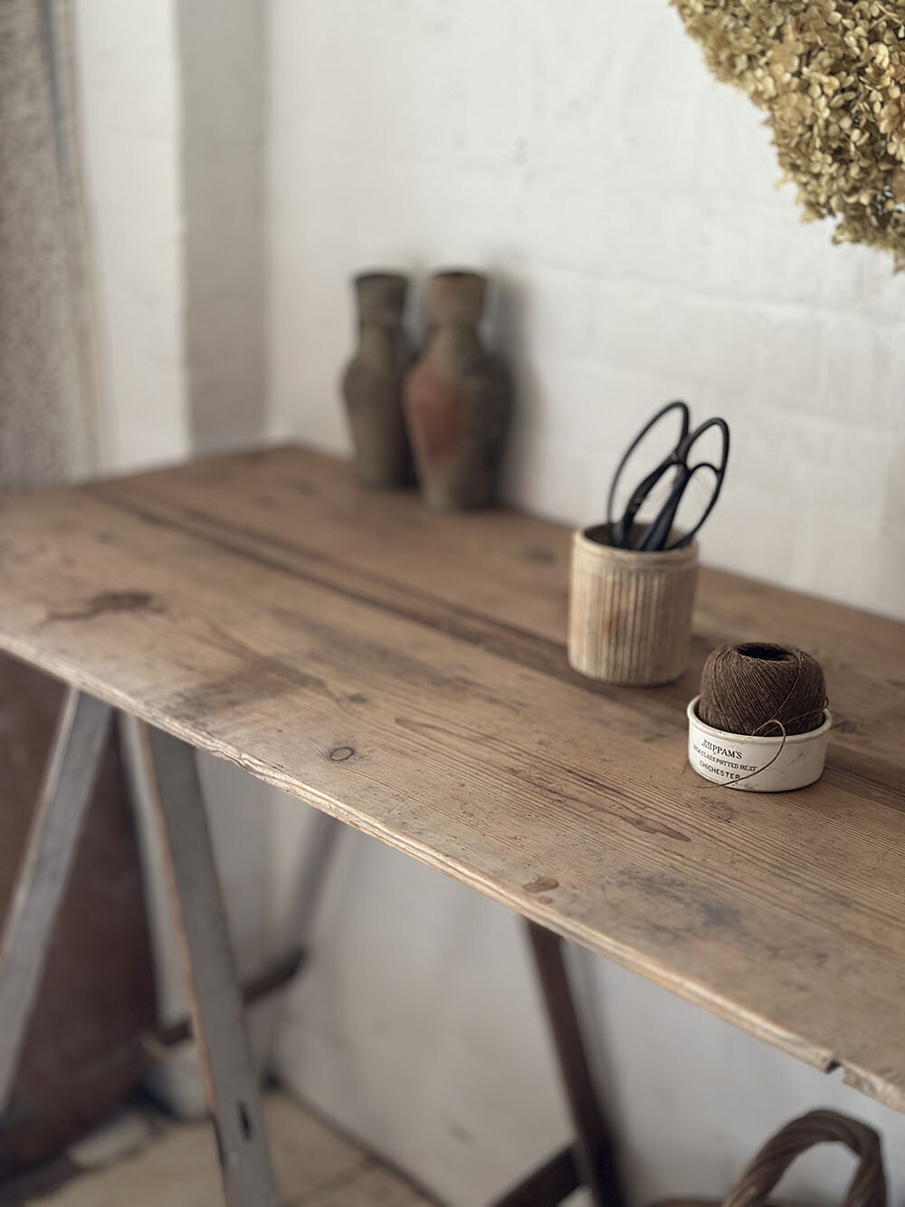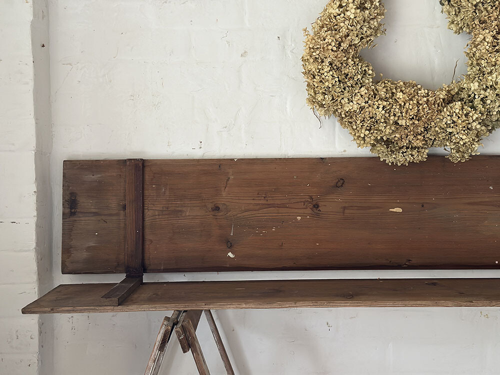 빈티지 파인 트레슬 테이블로, 이동성과 실용성을 중심에 두고 만들어진 구조가 잘 드러나는 피스입니다. 트레슬 테이블은 분리와 이동이 용이하도록 설계된 형태로, 유럽에서는 시장의 진열대나 플라워샵, 작업대 등 다양한 현장에서 활용되어 온 가구죠. 간결한 구조 안에 기능이 분명하게 담겨 있는 전형적인 유틸리티 퍼니처입니다. 파인 원목 상판에는 시간이 지나며 축적된 색감과 결이 자연스럽게 드러나면서, 단순한 형태임에도 충분한 깊이를 만들어냅니다.