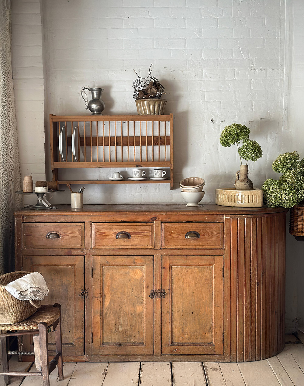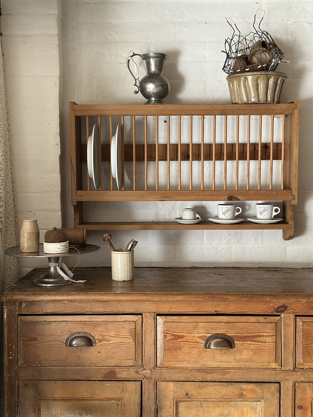 심플한 엣지 라인이 돋보이는 빈티지 파인 플레이트 랙으로, 상단에는 접시를 세워 수납할 수 있는 랙 구조가, 하단에는 한 단의 쉘프가 더해져 실용성과 연출을 동시에 갖춘 구성입니다. 일정한 간격으로 반복되는 슬랫 구조가 시각적인 리듬을 만들어내며, 접시를 꽂아 두었을 때 자연스럽게 정리된 풍경을 만들어주죠.