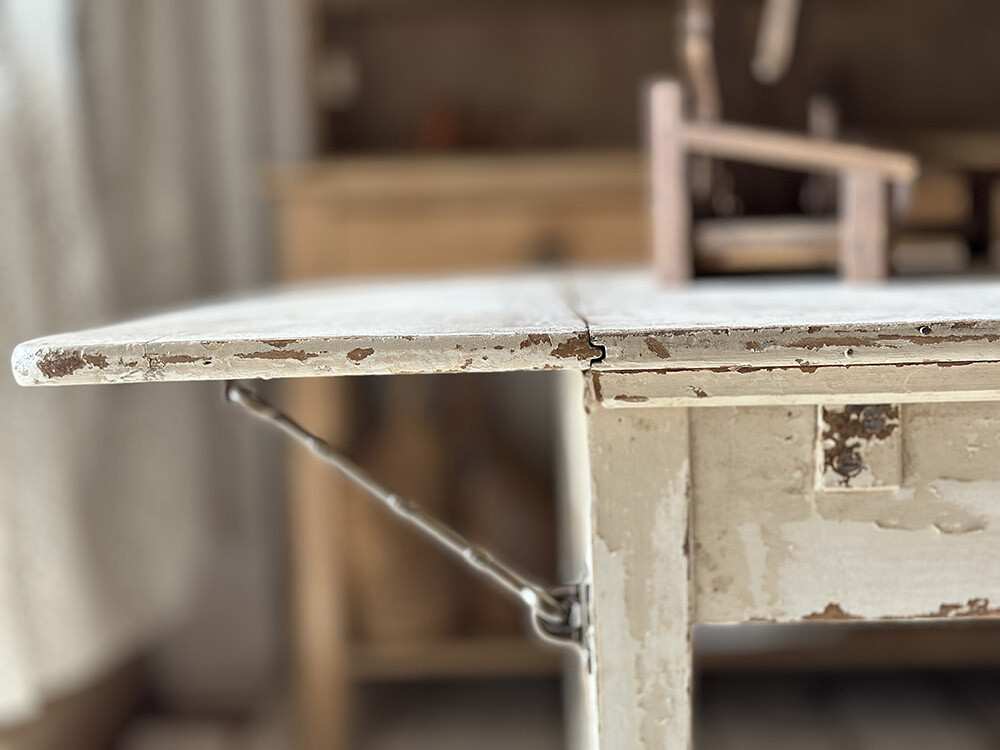 프랑스에서 제작된 올드 빈티지 쉐비 시크 하프 드랍리프 테이블입니다. 한쪽에만 드랍리프 상판이 구성된 하프 타입으로, 필요에 따라 상판을 펼치거나 접어 사용할 수 있는 실용적인 구조를 가지고 있어요. 비교적 아담한 스케일 속에서도 공간 활용도가 높은 테이블입니다.