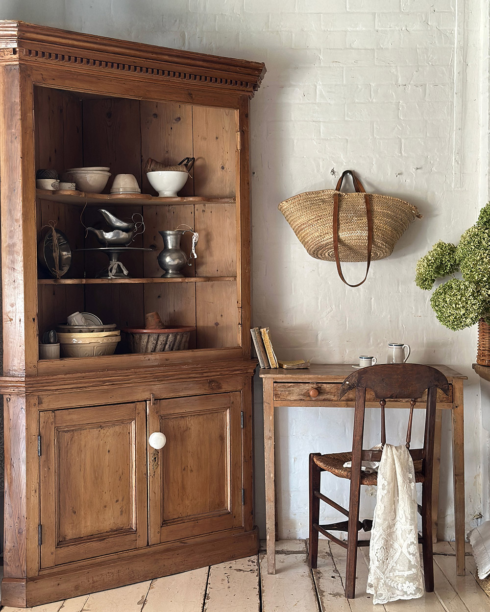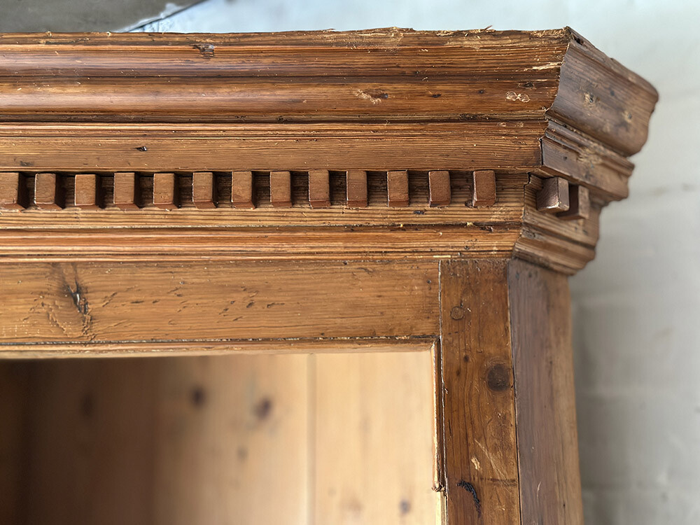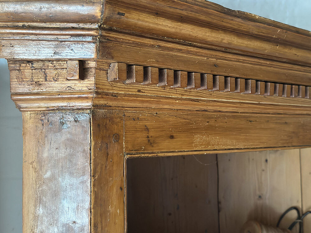 공간의 코너를 채우기 위해 설계된 파인 코너 유닛으로, 1800년대 후반 제작된 앤틱 피스입니다. 상부에는 코니스와 몰딩이 분명하게 살아 있는데, 팔라디오 건축 양식의 영향을 받아 빅토리아 시대에 형성된 장식 요소들이 반영된 형태입니다. 과장되지 않으면서도 리듬감 있게 반복되는 디테일이, 컨트리 가구 특유의 균형을 잘 보여주고 있죠.