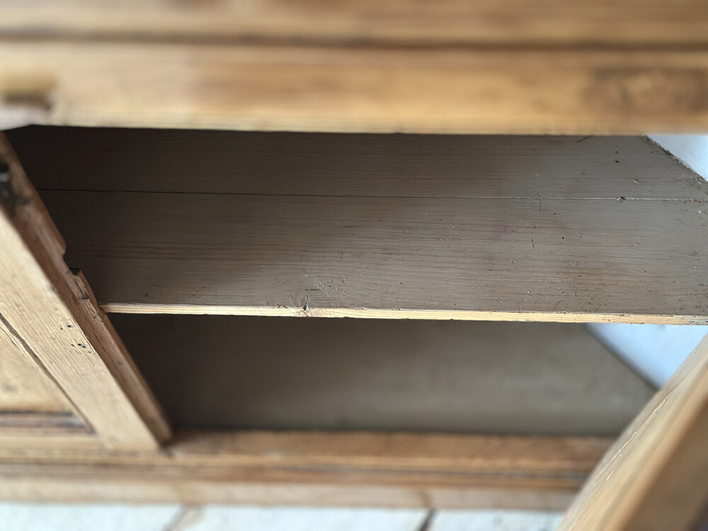 상부는 3단 쉘프로 구성되어 있으며, 각 쉘프의 전면은 가리비 껍데기를 모티프로 한 스캘럽 쉐입으로 엣지 컷팅이 들어가 있습니다. 단순한 평판이 아닌 이런 섬세한 가공이 더해지면서, 실용적인 수납 가구이면서도 장식적인 성격을 함께 갖게 됩니다. 하부 수납함은 내부가 2단으로 나뉘어 있어 실사용에도 충분한 구조를 갖추고 있고, 화이트 컬러의 플레인 놉 손잡이 역시 당시 컨트리 퍼니쳐에서 흔히 사용되던 디테일입니다.
