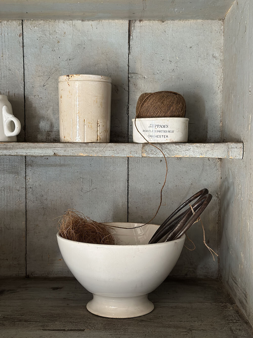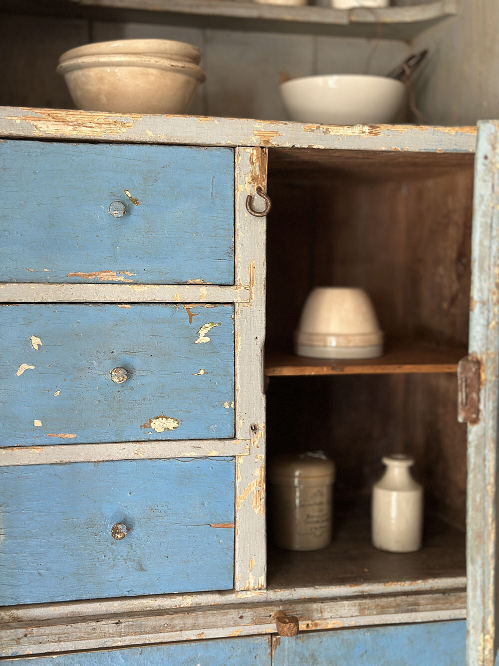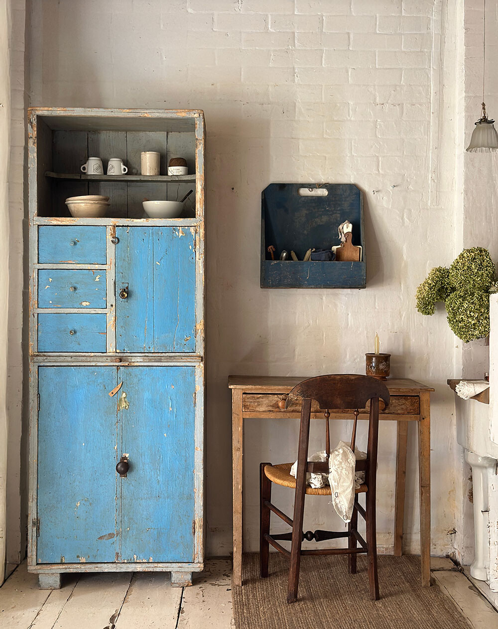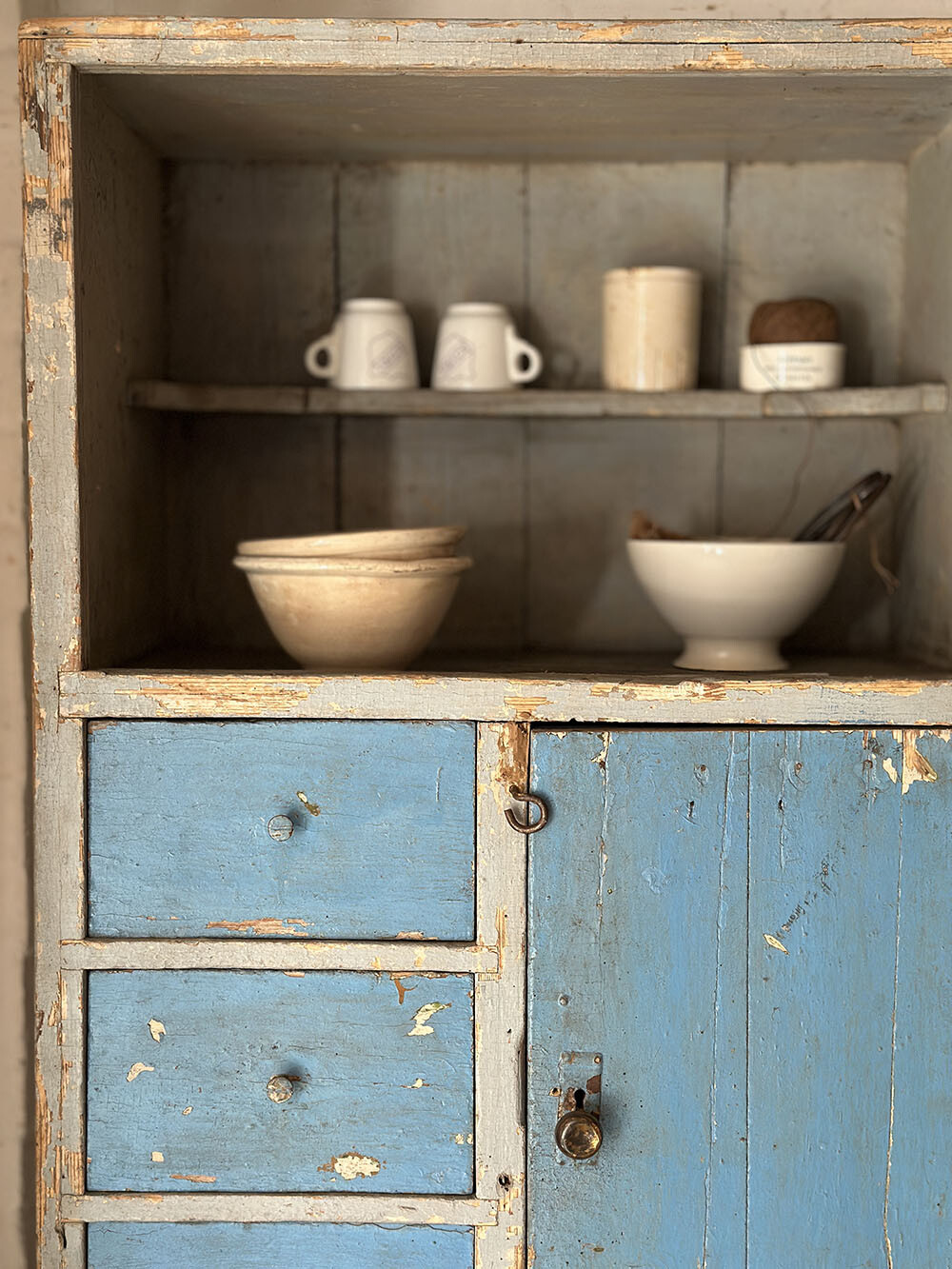 이 커보드는 올드 빈티지 파인 커보드에 쉐비 시크 페인팅이 더해진 피스입니다. 선명한 블루 컬러 위로 겹겹이 드러난 페인팅의 벗겨짐과 모서리의 마모는 인위적인 연출이 아니라, 오랜 시간 실제 생활 속에서 사용되며 쌓여온 흔적임을 분명하게 보여줍니다.