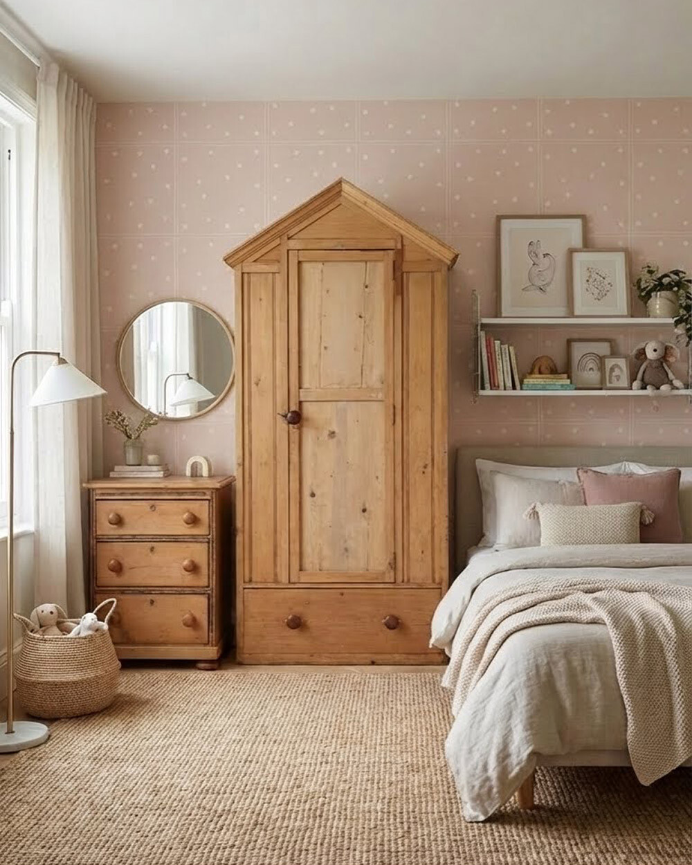 전체적으로 파인 우드 특유의 결이 고르게 드러나 있으며, 긴 시간에 걸쳐 형성된 색의 깊이와 표면의 질감이 자연스럽게 축적되어 있어요. 박공지붕이라는 특이한 형식, 당시로서는 상당한 규모, 그리고 명확한 제작사 정보까지 갖춘 점에서, 이 워드로브는 단순한 수납 가구를 넘어 당시 상류 주거 공간의 성격과 가구 문화의 한 단면을 함께 보여주는 앤틱 피스라고 볼 수 있습니다.