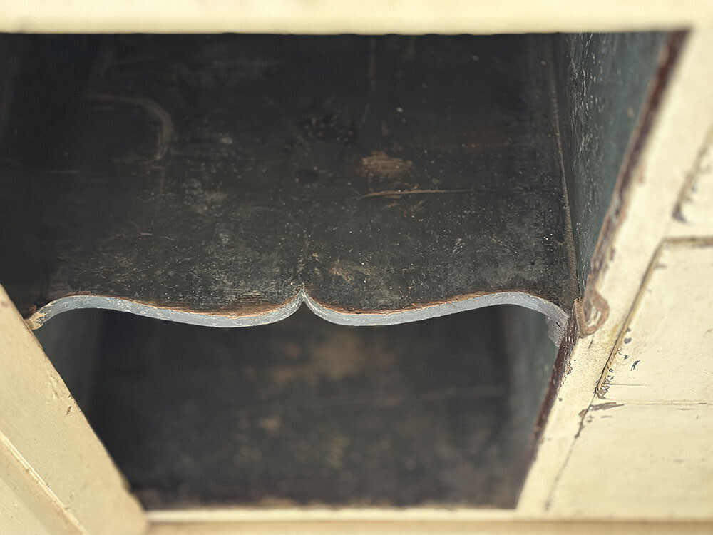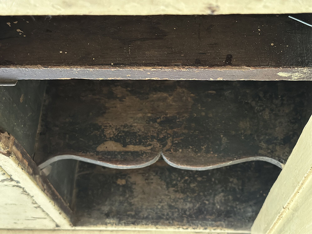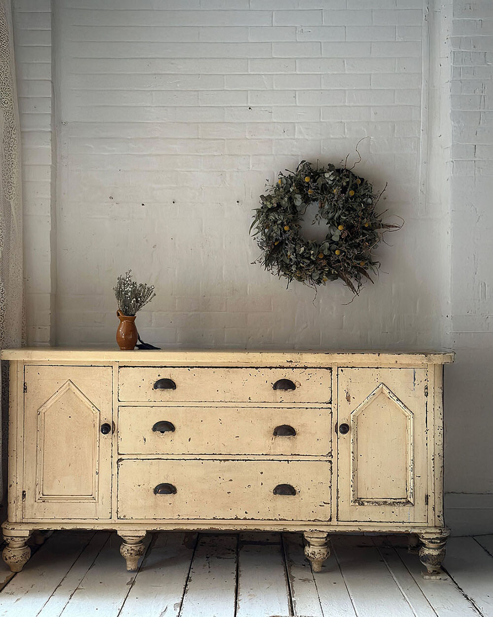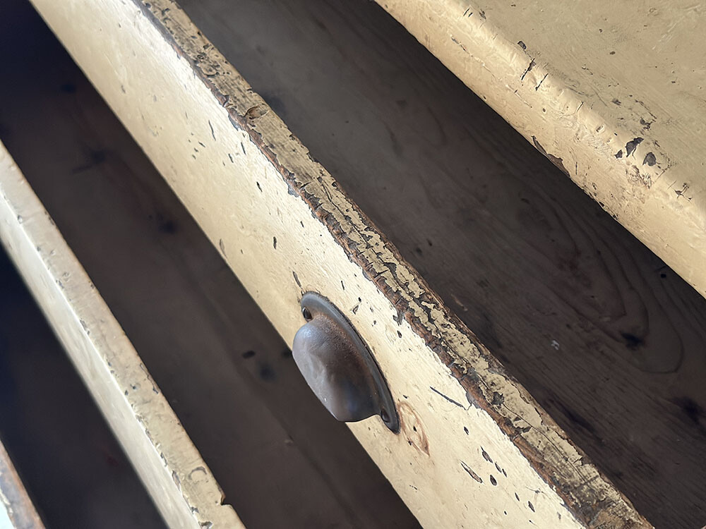 표면에는 쉐비 시크 특유의 페인팅이 남아 있는데, 시간의 흐름에 따라 자연스럽게 벗겨진 흔적과 파인 우드의 결이 함께 드러나 있습니다. 인위적으로 연출된 질감이 아니라, 오랜 사용과 풍화의 과정을 거치며 형성된 파티나가 색의 깊이를 만들어내고 있죠. 서랍 전면과 도어 패널에 더해진 간결한 패널 디자인과 손잡이 선택 역시 과하지 않은 선에서 가구의 성격을 잘 정리해줍니다.
