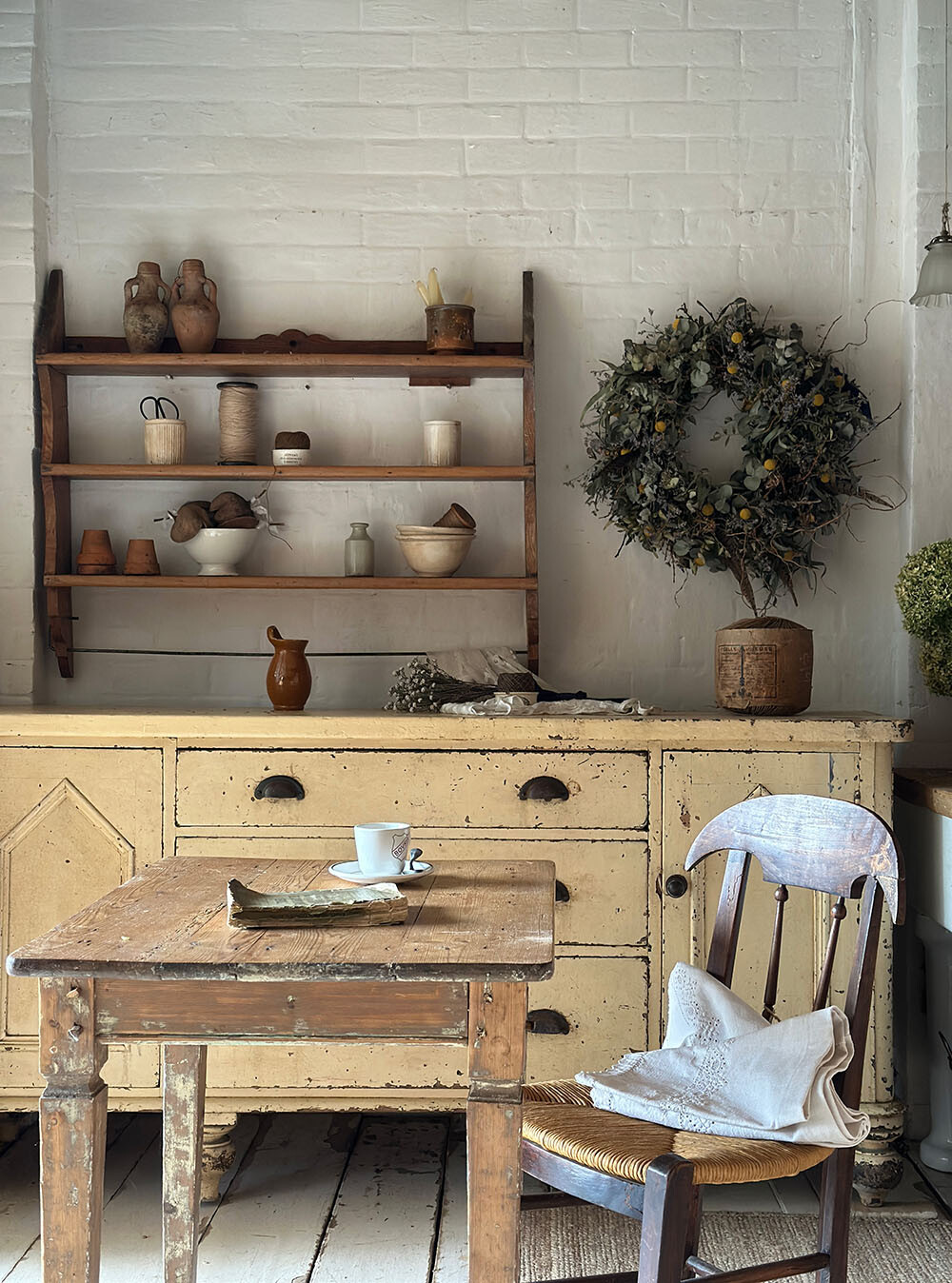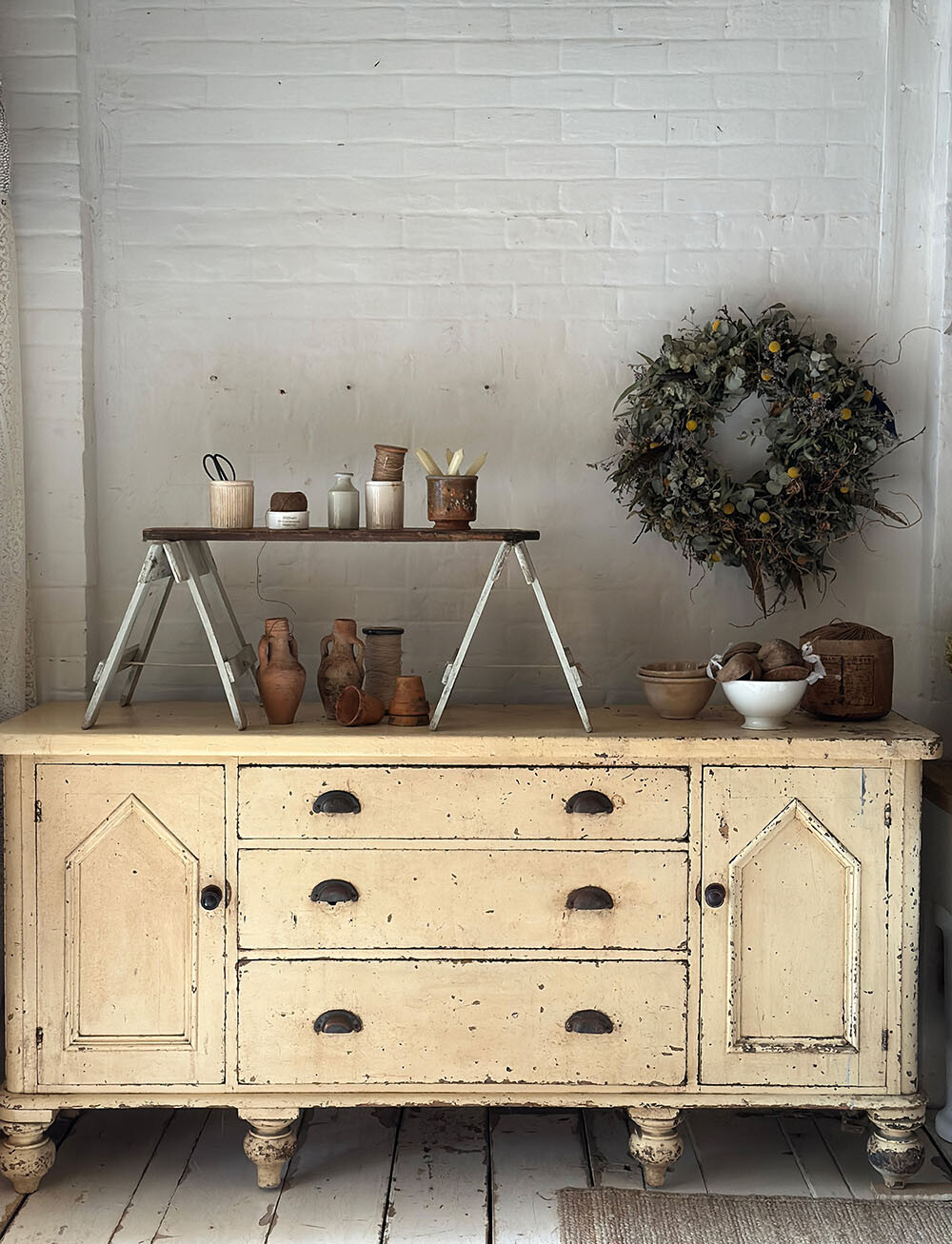 높이가 약 90cm로 비교적 낮지 않은 편에 속해, 일반적인 사이드보드 용도 외에도 카운터처럼 활용하기 좋은 점도 이 가구의 장점입니다. 주방과 다이닝 공간의 경계에서 작업대나 서빙용 가구로 사용해도 무리가 없고, 공간의 중심을 잡아주는 역할을 하기에 충분한 스케일을 갖추고 있어요. 앤틱 파인 특유의 질감과 쉐비 시크 페인팅이 어우러진, 실사용과 수집의 균형이 잘 잡힌 사이드보드입니다.
