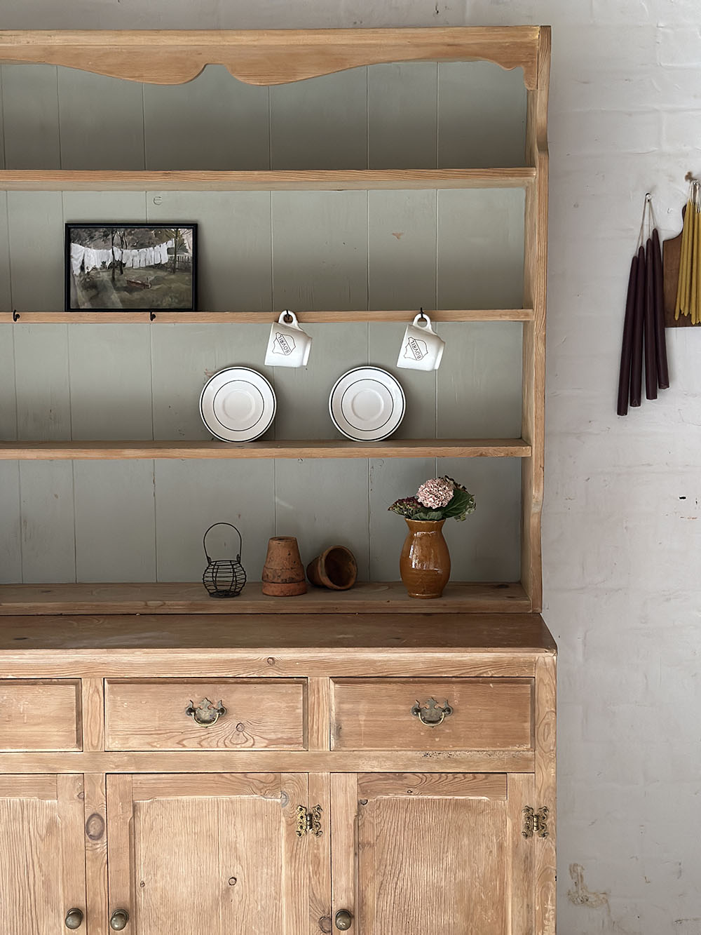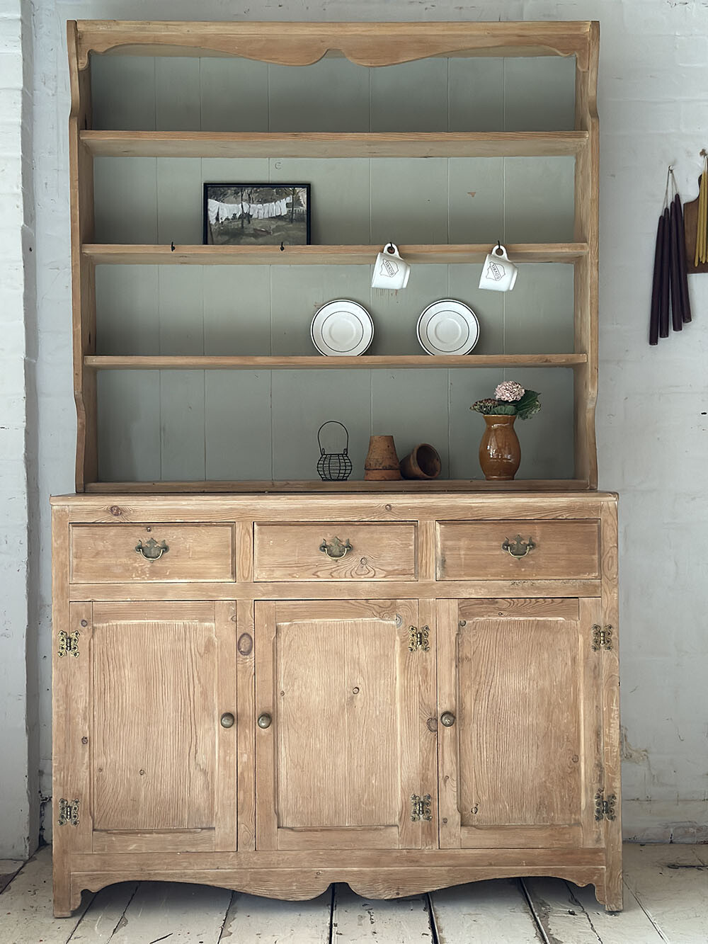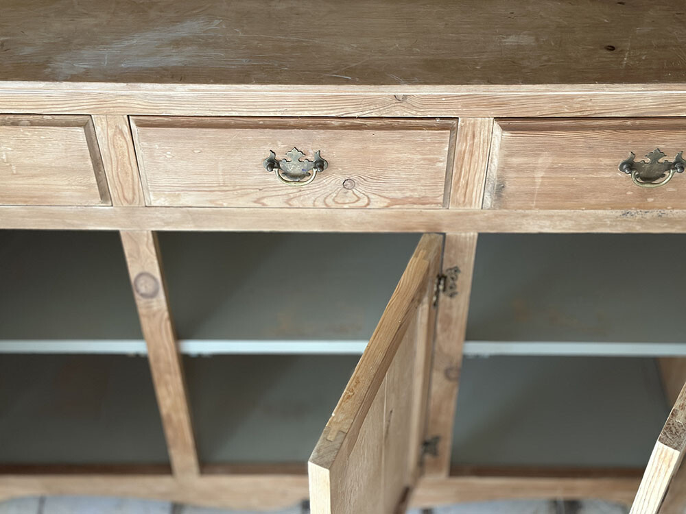 이 빈티지 파인 드레서는 영국 컨트리 퍼니쳐에서 흔히 볼 수 있는 전통적인 드레서의 구성을 따르고 있지만, 전체적인 인상은 한층 부드럽고 정제된 쪽에 가깝습니다. 상부는 오픈 쉘프 형태로 구성되어 있고, 프레임 라인을 따라 절제된 컷팅 장식이 더해져 있어 과하지 않으면서도 드레서 특유의 리듬감을 만들어냅니다.