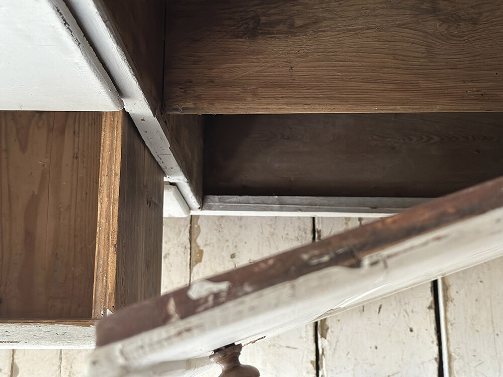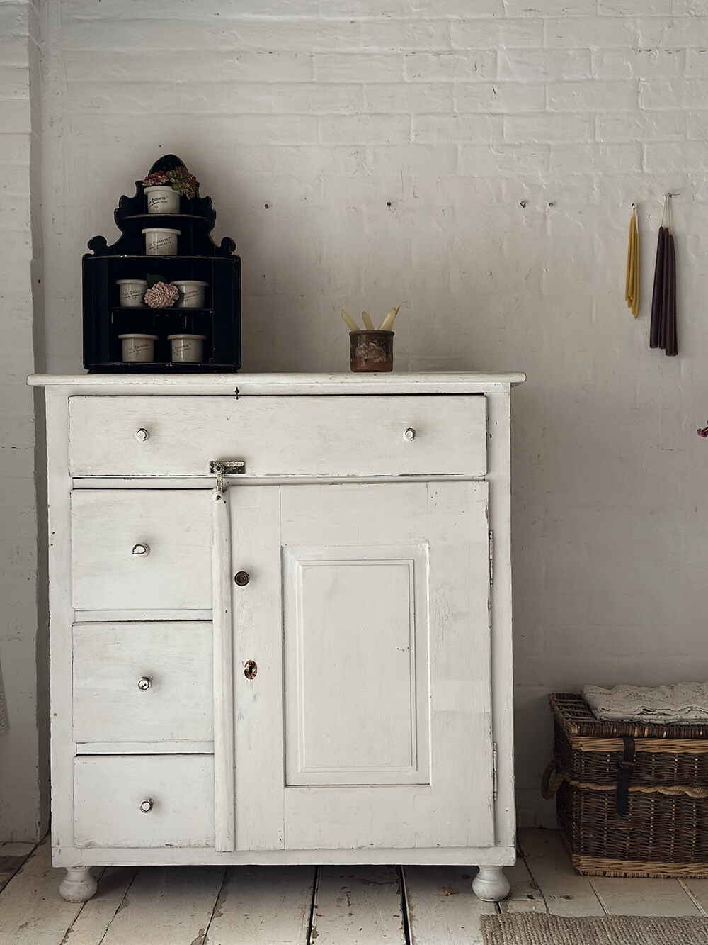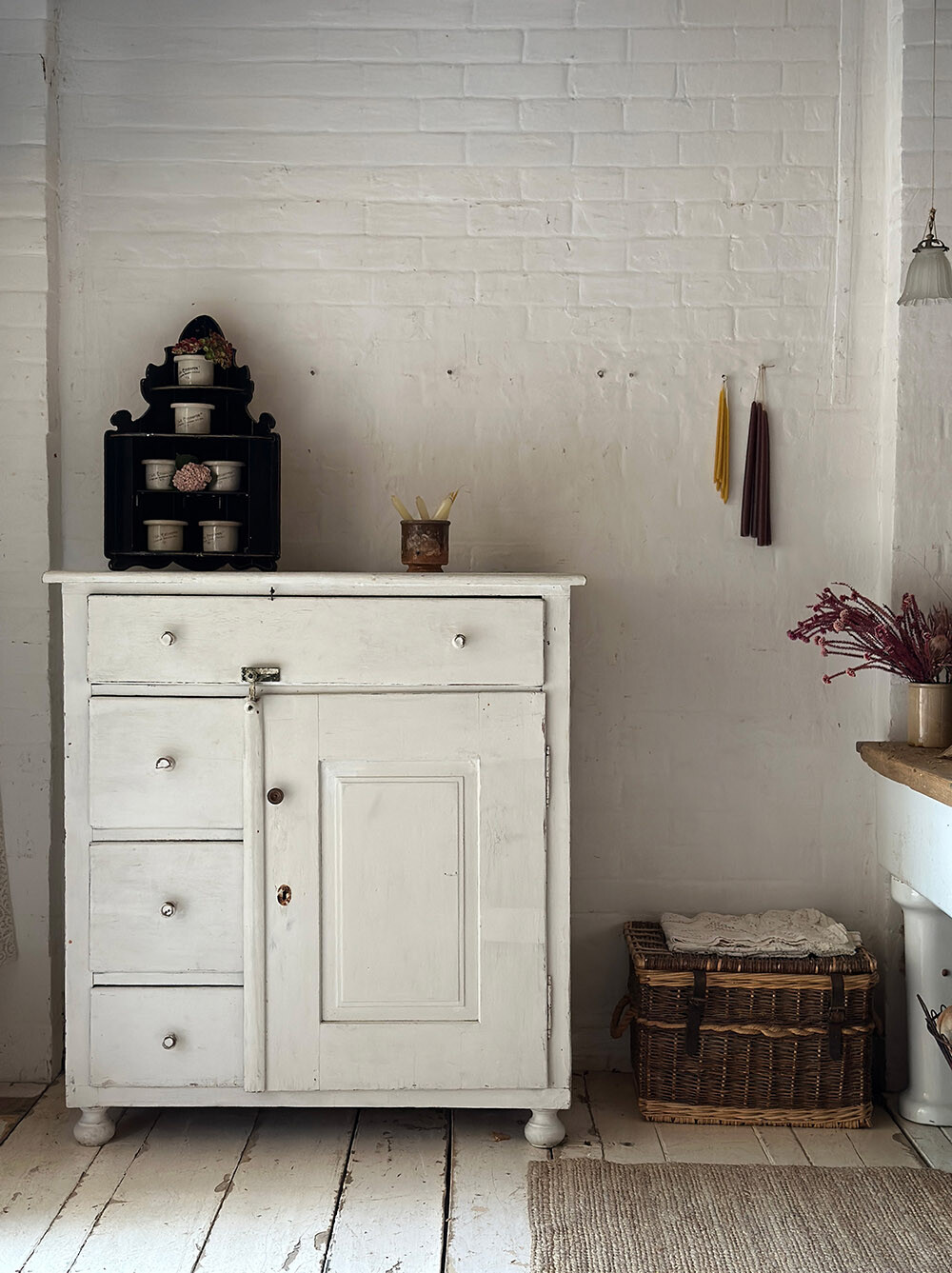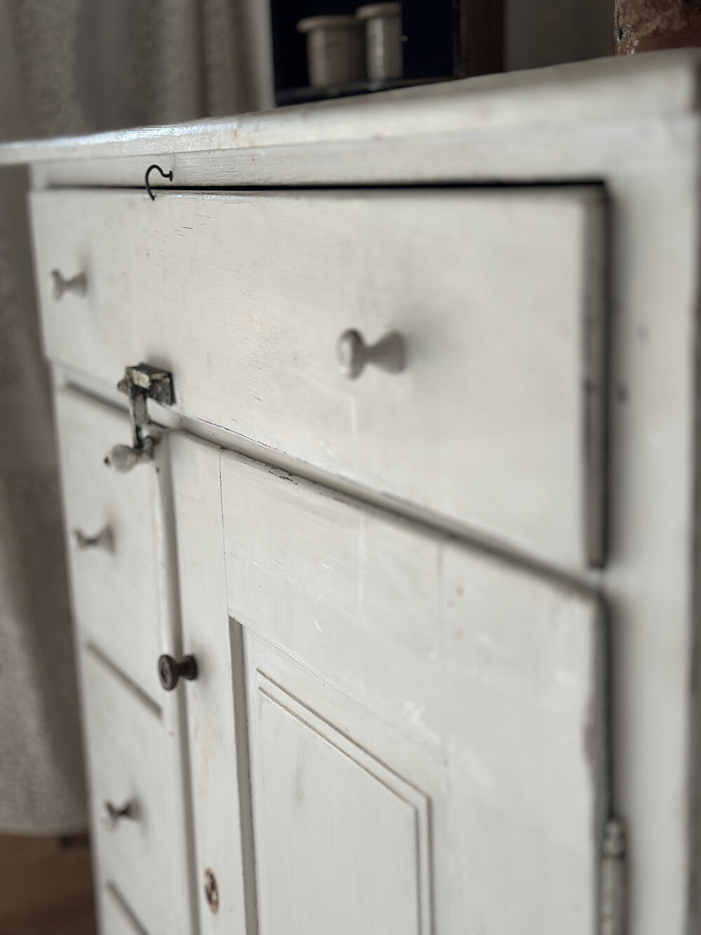 외부는 화이트 컬러의 쉐비 시크 페인팅이 시간과 사용을 거치며 자연스럽게 벗겨지고 쌓이면서 깊은 표정을 만들어내고 있고, 내부는 올드 파인 원목이 그대로 유지되어 짙은 파티나와 결이 대비를 이루는 모습입니다. 기능적인 구조와 생활 속에서 만들어진 흔적이 함께 남아 있는, 공간에 밀도를 더해주는 커보드예요.